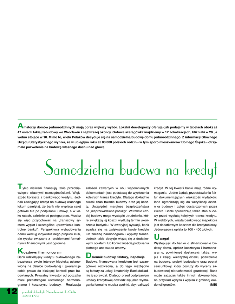A matorzy domów jednorodzinnych mają coraz większy wybór. Lokalni deweloperzy oferują (jak podajemy w tabelach obok) aż 47 osiedli takiej zabudowy we Wrocławiu i najbliższej okolicy. Gotowe szeregówki znajdziemy w 17. lokalizacjach, bliźniaki w 20., a wolno stojące w 10. Mimo to, wielu Polaków decyduje się na samodzielną budowę domu jednorodzinnego. Z informacji Głównego Urzędu Statystycznego wynika, że w ubiegłym roku aż 80 000 polskich rodzin - w tym sporo mieszkańców Dolnego Śląska - otrzymało pozwolenie na budowę własnego dachu nad głową. Samodzielna budowa na kredyt T ylko nieliczni finansują takie przedsięwzięcie własnymi oszczędnościami. Większość korzysta z bankowego kredytu. Jednak zaciągając kredyt na budowę własnego lokum pamiętaj, że bank nie wypłaca całej gotówki tuż po podpisaniu umowy, a w kilku ratach, zależnie od postępu prac. Musisz się więc przygotować na „transzowy system wypłat i szczególne uprawnienia kontrolne banku”. Perspektywa wybudowania domu według indywidualnego projektu kusi, ale ryzyko związane z problemami formalnymi i finansowymi jest ogromne. K osztorys i harmonogram Bank udzielający kredytu budowlanego zabezpiecza swoje interesy hipoteką ustanowioną na działce budowlanej i gwarantuje sobie prawo do bieżącej kontroli prac budowlanych. Prywatny inwestor od początku musi przestrzegać ustalonego harmonogramu i kosztorysu budowy. Realizacja 12 założeń zawartych w obu wspomnianych dokumentach jest podstawą do wypłacenia kolejnych transz kredytu. Dlatego dokładnie określ czas trwania budowy oraz jej koszty. Uwzględnij margines bezpieczeństwa na „nieprzewidziane poślizgi”. W trakcie każdej budowy mogą wystąpić utrudnienia, które zwiększą jej koszt i wydłużą termin ukończenia budynku. W awaryjnej sytuacji, bank zgadza się na zwiększenie kwoty kredytu lub zmianę harmonogramu wypłaty transz. Jednak takie decyzje wiążą się z dodatkowymi opłatami lub koniecznością podpisania płatnego aneksu do umowy. D ziennik budowy, faktury, inspekcja Budowa finansowana kredytem jest szczegółowo rozliczona, a do tego niezbędne są faktury za usługi i materiały. Bank dokładnie je sprawdzi. Dlatego przed podpisaniem umowy kredytowej dowiedz się jakie wymagania formalne musisz spełnić, aby rozliczyć kredyt. W tej kwestii banki mają różne wymagania. Jedne żądają przedstawiania faktur dokumentujących większość wydatków. Inne ograniczają się do weryfikacji dziennika budowy i zdjęć dostarczonych przez klienta. Banki sprawdzają także stan budowy przed wypłatą kolejnych transz kredytu. W niektórych, wizyta bankowego inspektora jest dodatkowym kosztem dla kredytobiorcy. Jednorazowa opłata to 100 - 400 złotych. U waga! Występując do banku o sfinansowanie budowy domu, oprócz kosztorysu i harmonogramu, powinieneś dostarczyć także: wypis z księgi wieczystej działki, pozwolenie na budowę, projekt budowlany oraz operat szacunkowy, który posłuży do wyceny zabudowanej nieruchomości gruntowej. Bank może zażądać także innych dokumentów, na przykład wyrysu i wypisu z gminnej ewidencji gruntów. (MB)