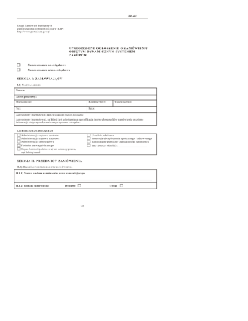 ZP401 Urząd Zamówień Publicznych Zamieszczanie ogłoszeń online w BZP: http://www.portal.uzp.gov.pl UPROSZCZONE OGŁOSZENIE O ZAMÓW IENIU OBJĘTYM DYNAMICZNYM SYSTEMEM ZAKUPÓW Zamieszczanie obowiązkowe Zamieszczanie nieobowiązkowe SEKCJA I: ZAM AW IAJĄCY I.1) N AZWA I ADRES Nazwa: Adres pocztowy: Miejscowość: Kod pocztowy: Województwo: Tel.: Faks: Adres strony internetowej zamawiającego (jeżeli posiada) : Adres strony internetowej, na której jest udostępniana specyfikacja istotnych warunków zamówienia oraz inne informacje dotyczące dynamicznego systemu zakupów: I.2) R ODZAJ ZAM AW IAJĄCEGO Administracja rządowa centralna Administracja rządowa terenowa Administracja samorządowa Uczelnia publiczna Instytucja ubezpieczenia społecznego i zdrowotnego Samodzielny publiczny zakład opieki zdrowotnej Podmiot prawa publicznego Inny (proszę określić) : Organ kontroli państwowej lub ochrony prawa, sąd lub trybunał SEKCJA II: PRZEDMIOT ZAMÓWIENIA II.1) O K R E ŚL E N IE PR Z E D M IO T U Z A M Ó W IEN IA II.1.1) Nazwa nadana zamówieniu przez zamawiającego II.1.2) Rodzaj zamówienia: Dostawy Usługi 1/2 ZP401 II.1.3) Określenie przedmiotu oraz wielkości lub zakresu zamówienia objętego dynamicznym systemem zakupów II.1.4) W SPÓLNY S ŁOW NIK Z AM ÓW IEŃ (CPV) Słownik główny Główny przedmiot Dodatkowe przedmioty SEKCJA IV: PROCEDURA IV.1) T RY B UD ZIELEN IA ZA M Ó W IEN IA : Przetarg nieograniczony IV.2) I NFO RM ACJE ADM INISTRACYJNE IV.2.1) Ogłoszenie o zamówieniu, w którym ustanowiono dynamiczny system zakupów Numer ogłoszenia w BZP: albo w Dz. Urz. UE: IV.2.2) Termin składania ofert orientacyjnych Data: (dd/mm/rrrr) Godzina: 2/2