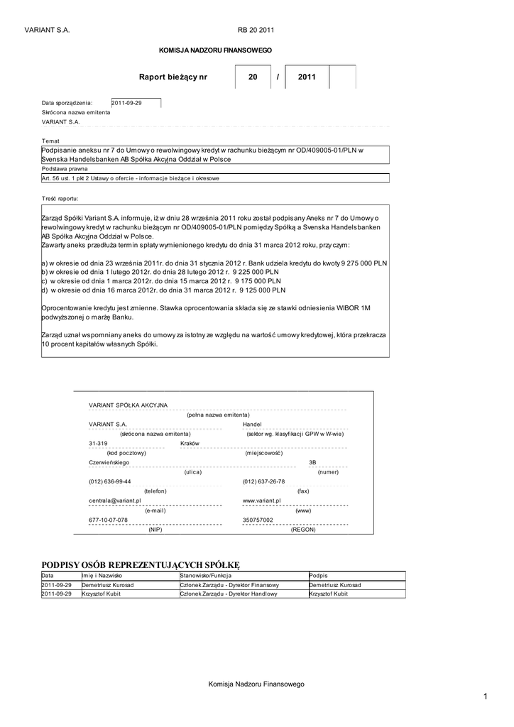 VARIANT S.A. RB 20 2011 KOMISJA NADZORU FINANSOWEGO Raport bieżący nr 20 / 2011 2011-09-29 Data sporządzenia: Skrócona nazwa emitenta VARIANT S.A. Temat Podpisanie aneksu nr 7 do Umowy o rewolwingowy kredyt w rachunku bieżącym nr OD/409005-01/PLN w Svenska Handelsbanken AB Spółka Akcyjna Oddział w Polsce Podstawa prawna Art. 56 ust. 1 pkt 2 Ustawy o ofercie - informacje bieżące i okresowe Treść raportu: Zarząd Spółki Variant S.A. informuje, iż w dniu 28 września 2011 roku został podpisany Aneks nr 7 do Umowy o rewolwingowy kredyt w rachunku bieżącym nr OD/409005-01/PLN pomiędzy Spółką a Svenska Handelsbanken AB Spółka Akcyjna Oddział w Polsce. Zawarty aneks przedłuża termin spłaty wymienionego kredytu do dnia 31 marca 2012 roku, przy czym: a) w okresie od dnia 23 września 2011r. do dnia 31 stycznia 2012 r. Bank udziela kredytu do kwoty 9 275 000 PLN b) w okresie od dnia 1 lutego 2012r. do dnia 28 lutego 2012 r. 9 225 000 PLN c) w okresie od dnia 1 marca 2012r. do dnia 15 marca 2012 r. 9 175 000 PLN d) w okresie od dnia 16 marca 2012r. do dnia 31 marca 2012 r. 9 125 000 PLN Oprocentowanie kredytu jest zmienne. Stawka oprocentowania składa się ze stawki odniesienia WIBOR 1M podwyższonej o marżę Banku. Zarząd uznał wspomniany aneks do umowy za istotny ze względu na wartość umowy kredytowej, która przekracza 10 procent kapitałów własnych Spółki. VARIANT SPÓŁKA AKCYJNA (pełna nazwa emitenta) VARIANT S.A. Handel (skróc ona nazwa emitenta) 31-319 (sektor wg. klasyfikacji GPW w W-wie) Kraków (kod pocztowy) (miejscowość) Czerwieńskiego 3B (ulica) (numer) (012) 636-99-44 (012) 637-26-78 (telefon) (fax) c [email protected] www.variant.pl (e-mail) (www) 677-10-07-078 350757002 (NIP) (REGON) PODPISY OSÓB REPREZENTUJĄCYCH SPÓŁKĘ Data Imię i Nazwisko Stanowisko/Funkc ja Podpis 2011-09-29 Demetriusz Kurosad Członek Zarządu - Dyrektor Finansowy Demetriusz Kurosad 2011-09-29 Krzysztof Kubit Członek Zarządu - Dyrektor Handlowy Krzysztof Kubit Komisja Nadzoru Finansowego 1