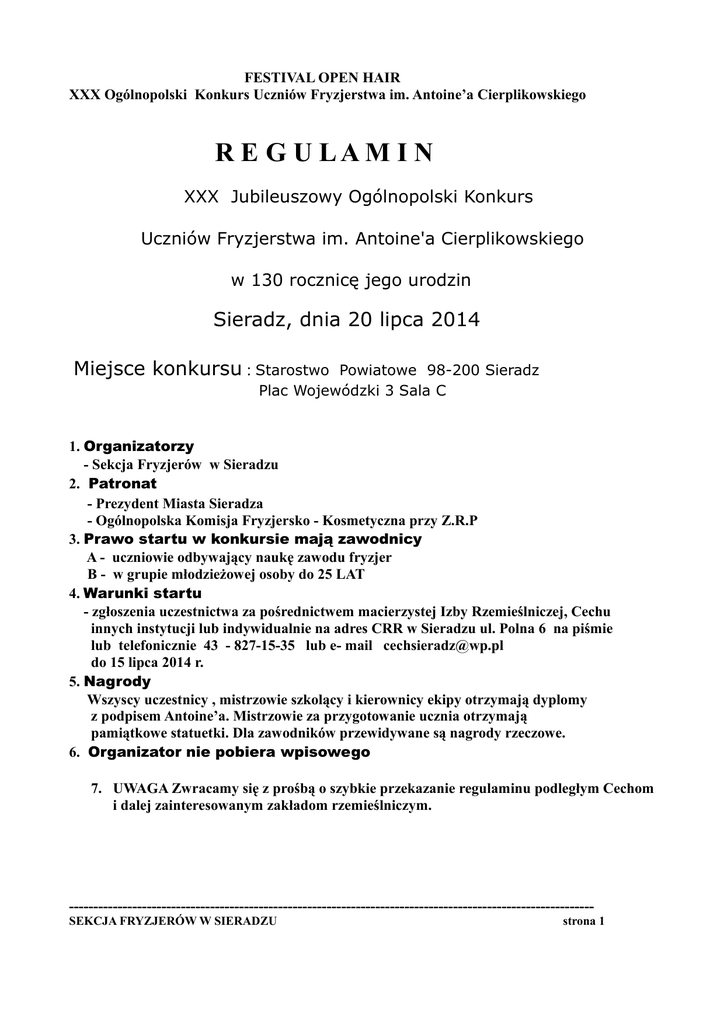 FESTIVAL OPEN HAIR XXX Ogólnopolski Konkurs Uczniów Fryzjerstwa im. Antoine’a Cierplikowskiego R E G U LA M I N XXX Jubileuszowy Ogólnopolski Konkurs Uczniów Fryzjerstwa im. Antoine'a Cierplikowskiego w 130 rocznicę jego urodzin Sieradz, dnia 20 lipca 2014 Miejsce konkursu : Starostwo Powiatowe 98-200 Sieradz Plac Wojewódzki 3 Sala C 1. Organizatorzy - Sekcja Fryzjerów w Sieradzu 2. Patronat - Prezydent Miasta Sieradza - Ogólnopolska Komisja Fryzjersko - Kosmetyczna przy Z.R.P 3. Prawo startu w konkursie mają zawodnicy A - uczniowie odbywający naukę zawodu fryzjer B - w grupie młodzieżowej osoby do 25 LAT 4. Warunki startu - zgłoszenia uczestnictwa za pośrednictwem macierzystej Izby Rzemieślniczej, Cechu innych instytucji lub indywidualnie na adres CRR w Sieradzu ul. Polna 6 na piśmie lub telefonicznie 43 - 827-15-35 lub e- mail [email protected] do 15 lipca 2014 r. 5. Nagrody Wszyscy uczestnicy , mistrzowie szkolący i kierownicy ekipy otrzymają dyplomy z podpisem Antoine’a. Mistrzowie za przygotowanie ucznia otrzymają pamiątkowe statuetki. Dla zawodników przewidywane są nagrody rzeczowe. 6. Organizator nie pobiera wpisowego 7. UWAGA Zwracamy się z prośbą o szybkie przekazanie regulaminu podległym Cechom i dalej zainteresowanym zakładom rzemieślniczym. -----------------------------------------------------------------------------------------------------------SEKCJA FRYZJERÓW W SIERADZU strona 1 FESTIVAL OPEN HAIR XXX Ogólnopolski Konkurs Uczniów Fryzjerstwa im. Antoine’a Cierplikowskiego Jednym z priorytetów XXX Ogólnopolskiego Konkursu Uczniów Fryzjerstwa im. Antoinea Cierplikowskiego jest wyłonienie Zwycięzcy SIERADZ OPEN HAIR FESTVAL 2014 w klasyfikacji damskiej i meskiej. Ten prestiżowy Konkurs odbędzie się pod patronatem Prezydenta Miasta Sieradza i Ogólnopolskiej Komisji Fryzjersko Kosmetycznej i stanowi dodatkowa kategorię obok Laureatów wyłonionych w XXX Ogólnopolskim Konkursie Uczniów Fryzjerstwa im. Antoinea Cierplikowskiego. W klasyfikacji damskiej o wyborze zwycięzcy decyduje suma punktów w następujących konkurencjach: 1. Fryzura Dzienna Konsumencka 2. Fryzura Wieczorowa 3. Fryzura Twoich Marzeń W klasyfikacji męskiej pod uwagę brana będzie suma punktów z następujących konkurencji: 1. Modelowanie Fryzury z Długich Włosów 2. Modelowanie Fryzury Klasycznej -----------------------------------------------------------------------------------------------SEKCJA FRYZJERÓW W SIERADZU strona 2 FESTIVAL OPEN HAIR XXX Ogólnopolski Konkurs Uczniów Fryzjerstwa im. Antoinea Cierplikowskiego KONKURS OBEJMUJE NASTĘPUJĄCE KONKURENCJE --------------------------------------------------------------------------------------------- FRYZJERSTWO DAMSKIE -------------------------------------------------------I. Wyciskanie fal na mokro ===================== przed rozpoczęciem konkurencji włosy muszą być zmoczone i zaczesane gładko do tyłu. 1. Można użyć klipsów do wykończenia. Włosy nie mogą być spięte. 2. Kolor włosów - kolory włosów są dozwolone. Zabronione są kolory neonowe i kolorowe spray. Nie wolno używać brokatu. 3. Wszystkie produkty są dozwolone. 4. Czas wykonania - 25 minut II. Fryzura dzienna konsumencka =================================== fryzura dla dziewczyny wybierającej się na casting modelek - pokaz mody Mokre włosy - przed rozpoczęciem konkurencji włosy muszą być mokre i gładko zaczesane do tyłu głowy Długość włosów dowolna. Zadanie: wykonanie fryzury 1. PRODUKTY - Wszystkie produkty dozwolone 2. NARZĘDZIA - wszystkie narzędzia modelujące dozwolone 3. KOLOR WŁOSÓW - według uznania uczestnika - zabronione kolory neonowe i kolory spraye 4. UBIÓR - Strój akcesoria makijaż muszą harmonizować z fryzurą 5. CZAS TRWANIA - 30 minut ----------------------------------------------------------------------------------------------------------------SEKCJA FRYZJERÓW W SIERADZU strona 3 FESTIVAL OPEN HAIR XXX Ogólnopolski Konkurs Uczniów Fryzjerstwa im. Antoinea Cierplikowskiego III. Fryzura wieczorowa ======================== fryzura na specjalną okazję /wizytowa/ - plecionki i warkocze z długich włosów Włosy rozpuszczone i gładko zaczesane do tyłu głowy / mokre lub suche - do uznania zawodnika/ 1. FRYZURA bez dopinek , wykonana wyłącznie przy użyciu rąk , grzebieni i szczotek 2. KOLOR WŁOSÓW - Według uznania uczestnika. 3. MAKIJAŻ - stosowny do fryzury wizytowej 4. PRODUKTY - dozwolone wszystkie produkty 5. CZAS WYKONANIA - 30 minut IV . Fryzura twoich marzeń =========================== fryzura według własnego pomysłu Mokre włosy - przed rozpoczęciem konkurencji włosy muszą być mokre i gładko Zaczesane do tyłu głowy 1. DŁUGOŚĆ włosów dowolna 2. DOZWOLONE wszystkie narzędzia 3. KOLORY bez ograniczeń możliwości zastosowania wszelkich środków Koloryzujących - zabronione kolory neonowe i spray”e 4. Czas wykonania - 25 minut -----------------------------------------------------------------------------------------------------------------SEKCJA FRYZJERÓW W SIERADZ strona 4 FESTIVAL OPEN HAIR XXX Ogólnopolski Konkurs Uczniów Fryzjerstwa im. Antoinea Cierplikowskiego V. Fryzura ślubna z długich włosów ============================ Fryzura ślubna na długich włosach wykonana na główkach treningowych lub modelach. 1. WŁOSY manekina mają być suche, rozpuszczone i zaczesane do tyłu. 2. WSZYSTKIE produkty są dozwolone. 3. WSZYSTKIE narzędzia modelujące są dozwolone. 4. KOLOR WŁOSÓW- wybór koloru jest dowolny. Zabronione są kolory neonowe kolor spray’e i brokaty. 5. FRYZURA ma charakter elegancki. 6. UBIÓR - kreacja i makijaż muszą mieć charakter ślubny 7. Wszystkie materiały do dekoracji są dozwolone, ale nie mogą przykrywac więcej niż 25 % fryzury. Treski, dopinki i peruki są zabronione. 8. Czas wykonania - 30 minut U WAGA ----------------KONKURENCJI MOGĄ BYĆ WYKONANE NA MODELACH LUB MANEKINACH Punktacja : max 30