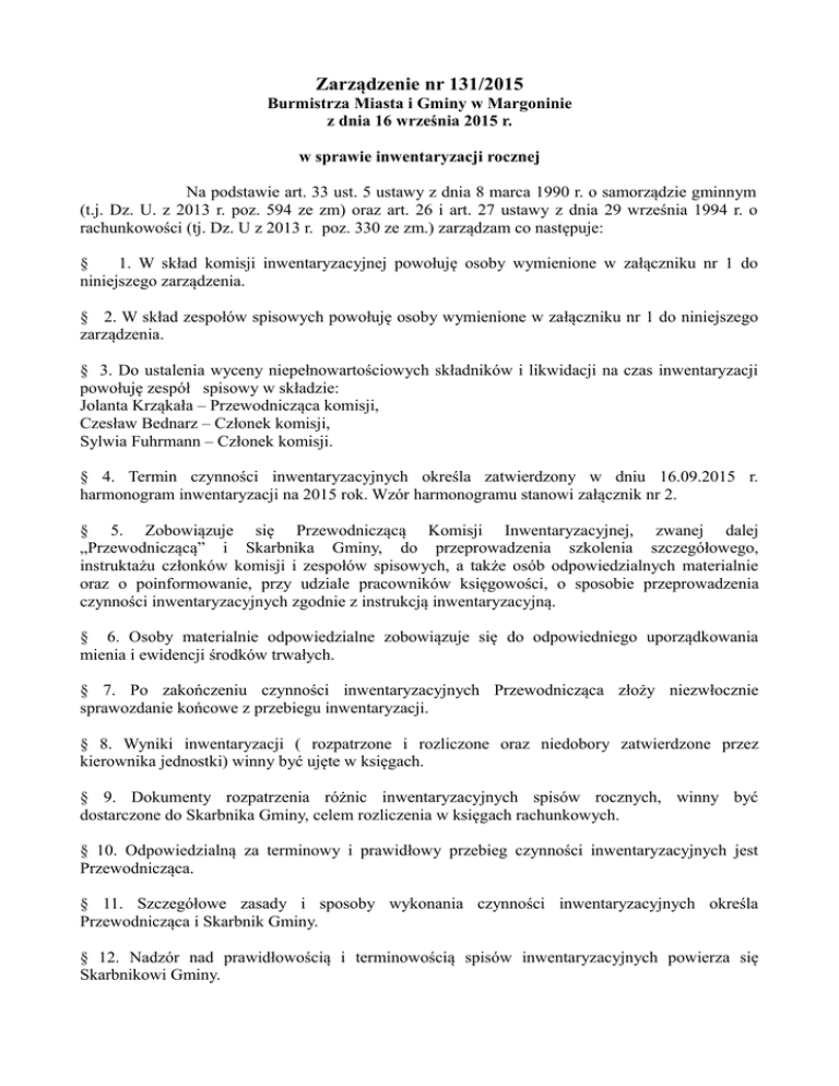 Zarządzenie nr 131/2015 Burmistrza Miasta i Gminy w Margoninie z dnia 16 września 2015 r. w sprawie inwentaryzacji rocznej Na podstawie art. 33 ust. 5 ustawy z dnia 8 marca 1990 r. o samorządzie gminnym (t.j. Dz. U. z 2013 r. poz. 594 ze zm) oraz art. 26 i art. 27 ustawy z dnia 29 września 1994 r. o rachunkowości (tj. Dz. U z 2013 r. poz. 330 ze zm.) zarządzam co następuje: § 1. W skład komisji inwentaryzacyjnej powołuję osoby wymienione w załączniku nr 1 do niniejszego zarządzenia. § 2. W skład zespołów spisowych powołuję osoby wymienione w załączniku nr 1 do niniejszego zarządzenia. § 3. Do ustalenia wyceny niepełnowartościowych składników i likwidacji na czas inwentaryzacji powołuję zespół spisowy w składzie: Jolanta Krząkała – Przewodnicząca komisji, Czesław Bednarz – Członek komisji, Sylwia Fuhrmann – Członek komisji. § 4. Termin czynności inwentaryzacyjnych określa zatwierdzony w dniu 16.09.2015 r. harmonogram inwentaryzacji na 2015 rok. Wzór harmonogramu stanowi załącznik nr 2. § 5. Zobowiązuje się Przewodniczącą Komisji Inwentaryzacyjnej, zwanej dalej „Przewodniczącą” i Skarbnika Gminy, do przeprowadzenia szkolenia szczegółowego, instruktażu członków komisji i zespołów spisowych, a także osób odpowiedzialnych materialnie oraz o poinformowanie, przy udziale pracowników księgowości, o sposobie przeprowadzenia czynności inwentaryzacyjnych zgodnie z instrukcją inwentaryzacyjną. § 6. Osoby materialnie odpowiedzialne zobowiązuje się do odpowiedniego uporządkowania mienia i ewidencji środków trwałych. § 7. Po zakończeniu czynności inwentaryzacyjnych Przewodnicząca złoży niezwłocznie sprawozdanie końcowe z przebiegu inwentaryzacji. § 8. Wyniki inwentaryzacji ( rozpatrzone i rozliczone oraz niedobory zatwierdzone przez kierownika jednostki) winny być ujęte w księgach. § 9. Dokumenty rozpatrzenia różnic inwentaryzacyjnych spisów rocznych, winny być dostarczone do Skarbnika Gminy, celem rozliczenia w księgach rachunkowych. § 10. Odpowiedzialną za terminowy i prawidłowy przebieg czynności inwentaryzacyjnych jest Przewodnicząca. § 11. Szczegółowe zasady i sposoby wykonania czynności inwentaryzacyjnych określa Przewodnicząca i Skarbnik Gminy. § 12. Nadzór nad prawidłowością i terminowością spisów inwentaryzacyjnych powierza się Skarbnikowi Gminy. § 13. Pracownicy służb finansowych przeprowadzają inwentaryzację gotówki w kasie czeków, akcji, obligacji, druków ścisłego zarachowania oraz należności drogą uzyskania od kontrahentów pisemnego potwierdzenia stanu tych sald oraz inwentaryzację w drodze porównania stanu ewidencyjnego należności spornych i wątpliwych, należności i zobowiązań publicznoprawnych, należności i zobowiązań wobec pracowników, rozliczeń międzyokresowych kosztów, fundusze specjalne, rezerwy, przychody przyszłych okresów, należności długoterminowych, udziałów w obcych podmiotach gospodarczych. § 14. Traci moc zarządzenie nr 115/2014 Burmistrza Miasta i Gminy w Margoninie z dnia 16 września 2014 r. § 15. Zarządzenie obowiązuje z dniem podjęcia. SF Załącznik nr 1 do Zarządzenia nr 131/2015 Burmistrza Miasta i Gminy w Margoninie z dnia 16 września 2015 r. 1. Skład komisji inwentaryzacyjnej: Jolanta Krząkała – Przewodnicząca komisji, Czesław Bednarz – Członek komisji, Sylwia Fuhrmann – Członek komisji. 2. Skład zespołów spisowych: Zespół I Katarzyna Kupniewska, Czesław Bednarz Zespół II Sylwia Mirecka, Barbara Kamińska Zespół III Katarzyna Wojtecka, Izabela Chróścińska Zespół IV Marek Nowaczewski, Monika Melińska 3 3. Przydziela się zespoły do objęcia spisem z natury następujących jednostek: Zespół I – Lodowisko, Narty wodne, Sołectwo Sypniewo, Siłownia Margonin, Plaża miejska Margonin, Sala wiejska Sypniewo Zespół II – MGOPiPZ, Tv kablowa, Rybakówka, Stadion, Sołectwo Margońska Wieś, Sołectwo Lipiny, Sołectwo Studźce, Sala wiejska Margońska Wieś Zespół III – Urząd MiG, USC, Sala kinowa, Straż Miejska, Sołectwo Sułaszewo, Sala wiejska Lipiniec, Sołectwo Lipiniec, Sołectwo Próchnowo, Sołectwo Zbyszewice Zespół IV – OSP Margonin, OSP Radwanki, OSP Zbyszewice, Świetlica Radwanki, Klub Próchnowianki, Świetlica Kowalewo, Sołectwo Kowalewo, Sołectwo Radwanki Załącznik nr 2 do Zarządzenia nr 131/2015 Burmistrza Miasta i Gminy w Margoninie z dnia 16.09.2015 r. Harmonogram inwentaryzacji L.p Przedmiot inwentaryzacji Obiekt inwentaryzacji Termin Metoda przeprowadzenia inwentaryzacji inwentaryzacji 1. Środki trwałe Urząd MiG, teren Raz na 4 lata, całej Gminy termin następnej inwentaryzacji przypada na 2016 r. Spis z natury na arkuszach spisu z natury 2. Środki trwałe (grunty i trudno Teren całej Gminy Od 01.12.2015 r. do 31.03.2016 r. Weryfikacja sald 3. Środki trwałe w budowie Urząd MiG, teren Od 01.12.2015 r. całej Gminy do 31.03.2016 r. Weryfikacja sald 4. Pozostałe środki trwałe Urząd MiG (poszczególne komórki organizacyjne). Jednostki pomocnicze Gminy, OSP. Od 01.10.2015 r. do 30.10.2015 r. Spis z natury na arkuszach spisu z natury 5. Wartości niematerialne i prawne Urząd MiG Od 02.01.2016 r. do 31.03.2016 r. Protokół z weryfikacji sald 6. Udziały i akcje Urząd MiG (poszczególne komórki organizacyjne) Od 02.01.2016 r. do 31.03.2016 r. Protokół z weryfikacji sald 7. Materiały Urząd MiG (poszczególne jednostki organizacyjne). Jednostki pomocnicze Gminy, OSP. Od 01.12.2015 r. do 15.01.2016 r. Spis z natury na arkuszach spisu z natury 8. Środki pieniężne w kasie Kasa Urzędu MiG 31.12.2015 r. dostępne) (inwestycje) (poszczególne komórki organizacyjne) 9. Środki pieniężne na rachunkach Urząd MiG bankowych (wraz z kontami kredytów i pożyczek z ksiąg rachunkowych budżetu) (referat finansowy) Od 02.01.2016 r. do 31.03.2016 r. Protokół z inwentaryzacji Protokół z weryfikacji sald 10. Druki ścisłego zara