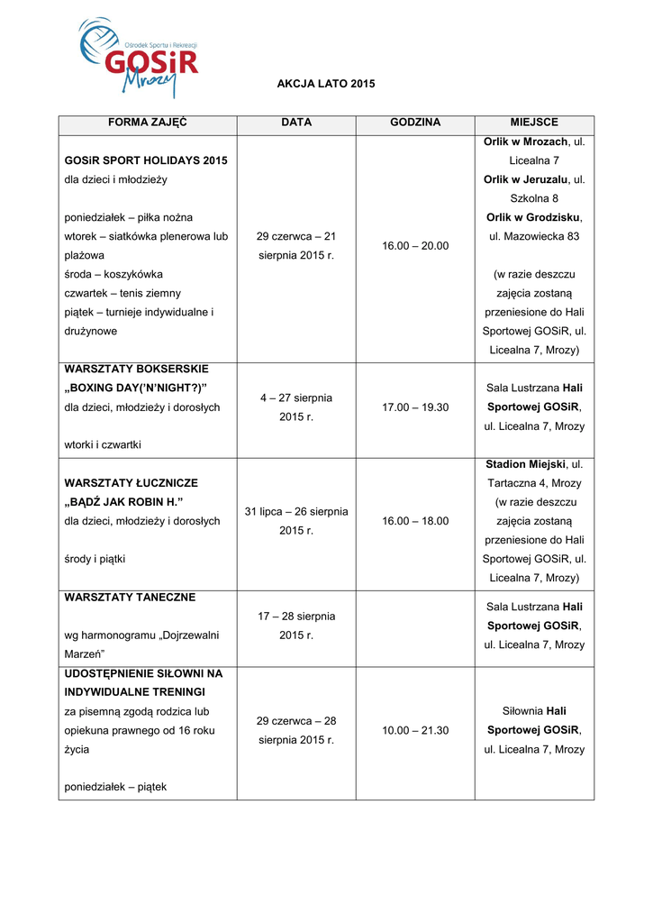 AKCJA LATO 2015 FORMA ZAJĘĆ DATA GODZINA MIEJSCE Orlik w Mrozach, ul. GOSiR SPORT HOLIDAYS 2015 Licealna 7 dla dzieci i młodzieży Orlik w Jeruzalu, ul. Szkolna 8 poniedziałek – piłka nożna Orlik w Grodzisku, wtorek – siatkówka plenerowa lub 29 czerwca – 21 plażowa sierpnia 2015 r. 16.00 – 20.00 ul. Mazowiecka 83 środa – koszykówka (w razie deszczu czwartek – tenis ziemny zajęcia zostaną piątek – turnieje indywidualne i przeniesione do Hali drużynowe Sportowej GOSiR, ul. Licealna 7, Mrozy) WARSZTATY BOKSERSKIE „BOXING DAY(’N’NIGHT?)” dla dzieci, młodzieży i dorosłych 4 – 27 sierpnia 2015 r. Sala Lustrzana Hali 17.00 – 19.30 Sportowej GOSiR, ul. Licealna 7, Mrozy wtorki i czwartki Stadion Miejski, ul. WARSZTATY ŁUCZNICZE „BĄDŹ JAK ROBIN H.” dla dzieci, młodzieży i dorosłych Tartaczna 4, Mrozy 31 lipca – 26 sierpnia 2015 r. (w razie deszczu 16.00 – 18.00 zajęcia zostaną przeniesione do Hali środy i piątki Sportowej GOSiR, ul. Licealna 7, Mrozy) WARSZTATY TANECZNE Sala Lustrzana Hali 17 – 28 sierpnia wg harmonogramu „Dojrzewalni Sportowej GOSiR, 2015 r. ul. Licealna 7, Mrozy Marzeń” UDOSTĘPNIENIE SIŁOWNI NA INDYWIDUALNE TRENINGI za pisemną zgodą rodzica lub opiekuna prawnego od 16 roku życia poniedziałek – piątek 29 czerwca – 28 sierpnia 2015 r. Siłownia Hali 10.00 – 21.30 Sportowej GOSiR, ul. Licealna 7, Mrozy FORMA ZAJĘĆ DATA GODZINA MIEJSCE „STÓŁ DLA KAŻDEGO” UDOSTĘPNIENIE STOŁU DO TENISA NA INDYWIDUALNE 29 czerwca – 31 TRENINGI sierpnia 2015 r. Hol Hali Sportowej 16.00 – 21.30 GOSiR, ul. Licealna 7, Mrozy poniedziałek – piątek UDOSTĘPNIENI KORTU TENISOWEGO NA INDYWIDUALNE TRENINGI wg oddzielnego 27 czerwca – 31 sierpnia 2015 r. poniedziałek – niedziela harmonogramupo Kort na Stadionie wcześniejszym Miejskim, ul. ustaleniu godziny pod Tartaczna 4, Mrozy nr tel. 501 802 502 wg oddzielnego TURNIEJE TENISA ZIEMNEGO lipiec – sierpień 2015 r. harmonogramu Kort na Stadionie dostępnego na Miejskim, ul. stronie Tartaczna 4, Mrozy www.gosir.mrozy.pl wg oddzielnego TURNIEJE SIATKÓWKI PLAŻOWEJ lipiec – sierpień 2015 r. harmonogramu Boiska do siatkówki dostępnego na plażowej, ul. Żwirowa stronie („Kopalnia”), Mrozy www.gosir.mrozy.pl