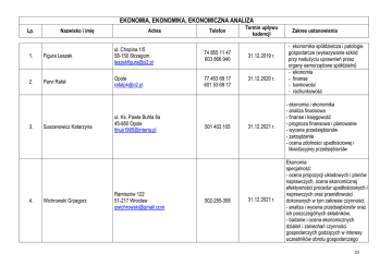EKONOMIA, EKONOMIKA, EKONOMICZNA ANALIZA Lp. Nazwisko i imię Adres 1. Figura Leszek ul. Chopina 1/5 58-150 Strzegom [email protected] 2. Parvi Rafał Opole [email protected] 3. 4. Suszanowicz Katarzyna Wichrowski Grzegorz ul. Ks. Pawła Buhla 8a 45-950 Opole [email protected] Ramiszów 122 51-217 Wrocław [email protected] Telefon 74 855 11 47 603 866 940 77 453 69 17 601 53 69 17 501 403 105 502-255-308 Termin upływu kadencji 31.12.2019 r. 31.12.2020 r. Zakres ustanowienia - ekonomika spółdzielcza i patologie gospodarcze (wykazywanie szkód przy nadużyciu uprawnień przez organy samorządowe spółdzielni) - ekonomia - finanse - bankowość - rachunkowość 31.12.2021 r. - ekonomia i ekonomika - analiza finansowa - finanse i księgowość - prognoza finansowa i planowanie - wycena przedsiębiorstw - zarządzanie - ocena zdolności upadłościowej i likwidacyjnej przedsiębiorstw 31.12.2021 r. Ekonomia specjalność: - ocena propozycji układowych i planów naprawczych, ocena ekonomicznej efektywności procedur upadłościowych i naprawczych oraz prawidłowości dokonanych w tym zakresie czynności; - analiza i wycena przedsiębiorstw oraz ich poszczególnych składników, - badanie i ocena ekonomicznych działań i zaniechań czynności gospodarczych godzących w interesy uczestników obrotu gospodarczego 20 EKONOMIA, EKONOMIKA, EKONOMICZNA ANALIZA Lp. Nazwisko i imię Adres Telefon Termin upływu kadencji Zakres ustanowienia (działanie na szkodę). Zarządzanie specjalność: - zarządzanie przedsiębiorstwem, marketingiem, finansami, ryzykiem prowadzenia działalności gospodarczej, kontrolą zarządczą i jakości produkcji. 5. Wróbel Reinhard ul. Głogowska 8 45-315 Opole [email protected] 604 455 500 31.12.2018 r. - ekonomia, analizy ekonomiczne; - finanse, zarządzanie finansowe; - księgowość i rachunkowość; - zarządzanie, zarządzanie ryzykiem Data modyfikacji: 05.01.2017 r 20