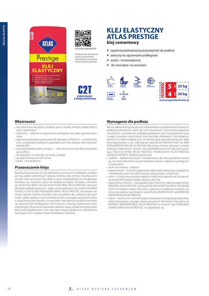 kleje do płytek KLEJ ELASTYCZNY ATLAS PRESTIGE klej cementowy www.atlas.2dkod.pl/401 Zeskanuj kod i dowiedz się więcej o parametrach technicznych, korzyściach lub promocjach produktu zapewnia podwyższoną przyczepność do podłoża zalecany na ogrzewanie podłogowe wodo- i mrozoodporny do wewnątrz i na zewnątrz APLIKACJA 5 4 25 kg 20 kg Właściwości Wymagania dla podłoża • klej cementowy do glazury, terakoty, gresu, mozaiki, klinkieru, płytek betonowych i kamiennych • elastyczny – zalecany na ogrzewanie podłogowe oraz płyty gipsowo-kartonowe • zapewnia podwyższoną przyczepność (powyżej 1,0 N/mm2) – umożliwia klejenie na podłożach pokrytych pozostałościami farb, lastryko oraz stabilnych płytach OSB • pozwala przyklejać płytki „od góry” – unika się konieczności docinania płytek pod sufitem • do wewnątrz i na zewnątrz, na ściany i podłogi • grubość warstwy od 2 do 10 mm • wodo- i mrozoodporny Klej ma odpowiednią przyczepność do prawidłowo przygotowanych typowych podłoży budowlanych, takich jak tynki cementowe i cementowo-wapienne, cementowe i anhydrytowe podkłady podłogowe oraz nieotynkowane mury z cegieł, pustaków ceramicznych oraz bloczków silikatowych. Klej nadaje się również na trudne podłoża, m.in. na lastryko, płyty gipsowo-kartonowe, płyty drewnopochodne, w tym OSB pokryte masą ATLAS GRUNTO-PLAST lub WARSTWĄ KONTAKTOWĄ ATLAS PRESTIGE. Klej można również stosować na hydroizolacjach wykonanych z jedno- lub dwuskładnikowych folii bezspoinowych typu FOLIA W PŁYNIE ATLAS PRESTIGE, HYDROLASTIK ATLAS PRESTIGE lub ATLAS WODER E. Podłoże powinno być: • stabilne – dostatecznie nośne i wysezonowane do stanu powietrzno-suchego, nie może odkształcać się pod wpływem nacisku i naprężeń wynikających z użytkowania • suche lub matowo - wilgotne • wysezonowane – musi mieć zapewniony odpowiednio długi czas na osiągniecie charakterystycznych dla siebie wartości wytrzymałości i wilgotności • nośne – oczyszczone z warstw mogących osłabić przyczepność, np. łuszczących się powłok farb, słabych tynków, tłustych plam itp. • odpowiednio chłonne – w przypadku dużej chłonności należy je zagruntować GRUNTEM ATLAS PRESTIGE, emulsją ATLAS UNI-GRUNT lub ATLAS UNI-GRUNT PLUS. W przypadku niskiej chłonności, zwłaszcza na podłożach trudnych, powinno się wykonać gruntowanie masą ATLAS GRUNTO-PLAST lub WARSTWĄ KONTAKTOWĄ ATLAS PRESTIGE • równe – nierówności uniemożliwiające zastosowanie wskazanej grubości kleju należy skorygować, używając zapraw stosownych dla danych warunków, np. ZAPRAWY WYRÓWNUJĄCEJ ATLAS PRESTIGE na ścianach oraz PODKŁADU CEMENTOWEGO ATLAS PRESTIGE na posadzkach, itp. Przeznaczenie kleju Zaprawa przeznaczona jest do przyklejania, na ścianach i podłogach, wszelkiego typu płytek ceramicznych (glazura, terakota, gres, klinkier, mozaika), betonowych oraz kamiennych (do płytek z gresu polerowanego lub nasiąkliwego kamienia, np. marmuru, zaleca się stosowanie klejów na białym cemencie, np. ATLAS PLUS BIAŁY Lub KLEJ ELASTYCZNY BIAŁY ATLAS PRESTIGE, natomiast do płytek wielkoformatowych – klejów samorozpływnych np. ATLAS PLUS MEGA lub KLEJ ELASTYCZNY PODŁOGOWY BIAŁY ATLAS PRESTIGE. Stosowanie wewnątrz: łazienki, kuchnie, korytarze, hale, poczekalnie itp., zwłaszcza gdy parametry i jakość podłoża w tych pomieszczeniach wymagają zastosowania kleju o zwiększonej przyczepności, a ewentualne odkształcenia podłoża (wywołane np. ogrzewaniem podłogowym lub ściennym) nakazują zastosowanie kleju elastycznego. Stosowanie na zewnątrz: balkony, tarasy, schody, elewacje budynków, murki ogrodzeniowe i inne tego typu miejsca, narażone na odkształcenia wynikające m.in. z częstych zmian temperatury otoczenia. 12 MROZOWODOODPORNY Parametry techniczne Klej należy wymieszać, stosując proporcje wskazane w PARAMETRACH TECHNICZNYCH. Mieszać należy za pomocą mieszarki wolnoobrotowej z mieszadłem do zapraw. Po osiągnięciu przez masę jednorodnej konsystencji, mieszanie przerwać na pięć minut, potem wykonać ponownie. Klej należy nanieść na podłoże gładką pacą stalową. W przypadku płytek podłogowych oraz układanych na zewnątrz, konieczne jest naniesienie kleju również na płytkę. Ma to na celu niezbędne w takich przypadkach całkowite wypełnienie przestrzeni pomiędzy płytkąa podłożem. Do wyprofilowania kleju należy użyć pacy zębatej. Pozwoli to kontrolować grubość nakładanej warstwy. Płytkę przyłożyć do podłoża i ewentualnie skorygować jej ułożenie, przestrzegając czasów wskazanych w PARAMETRACH TECHNICZNYCH. Powierzchnia sklejenia powinna być nie mniejsza niż 2/3 powierzchni płytki, a w przypadku płytek podłogowych i układanych na zewnątrz – całkowita. Do spoinowania okładziny można przystąpić po 24 godzinach. Po tym czasie możliwy jest również lekki ruch pieszy. Krótki poradnik • W razie wątpliwości dotyczących nośności podłoża, można przykleić do niego kilka płytek i spróbować oderwać je ręką po upływie 48 godzin. Próbę można uznać za udaną, jeśli nie uda się oderwać płytki. • Należy przestrzegać wskazanych proporcji mieszania, gdyż zapewni to zaprawie odpowiednie parametry robocze i wytrzymałość. • Nie moczyć płytek przed przyklejaniem. • Wielkość zębów pacy dobierać w zależności od rozmiarów płytek i stopnia wyprofilowania spodu płytki - patrz tabela. Rodzaj płytki Wielkość zębów pacy [mm] Płytki małego formatu (do 10x10 cm) o gładkiej lub lekko profilowanej powierzchnię spodu 4,0 – 6,0 Płytki średniego formatu (do 30x30 cm) o lekko profilowanej p owierzchni spodu 6,0 - 8,0 Płytki dużego formatu (pow. 30x30 cm) o średnio profilowanej powierzchni spodu. 8,0 - 10,0 Czas korekty ok. 20 min od przyłożenia płytki Czas zużycia kleju 4 godziny Temperatura: przygotowania zaprawy podło