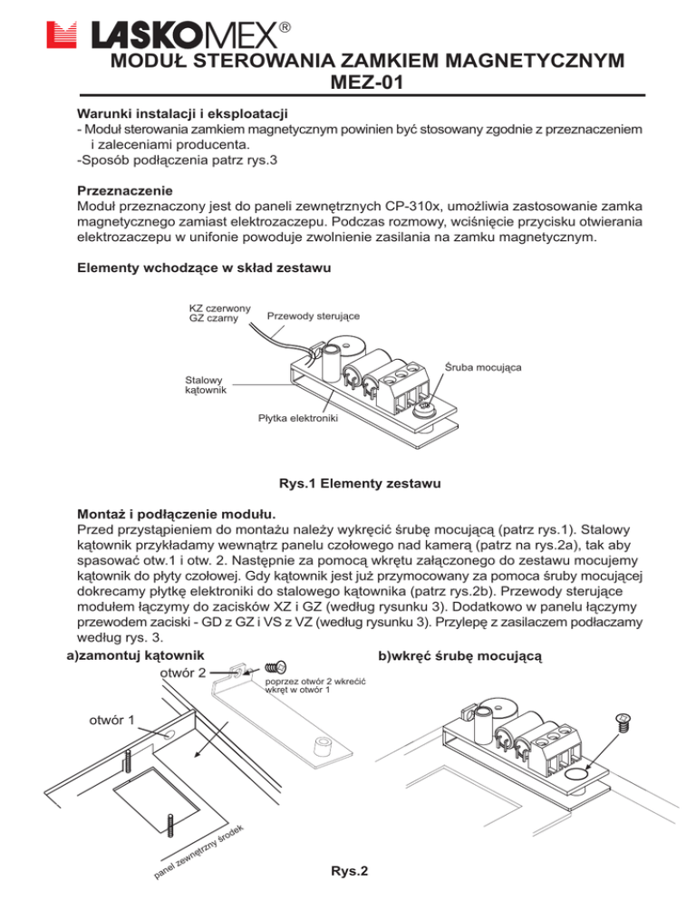 MODU£ STEROWANIA ZAMKIEM MAGNETYCZNYM MEZ-01 Warunki instalacji i eksploatacji - Modu³ sterowania zamkiem magnetycznym powinien byæ stosowany zgodnie z przeznaczeniem i zaleceniami producenta. -Sposób pod³¹czenia patrz rys.3 Przeznaczenie Modu³ przeznaczony jest do paneli zewnêtrznych CP-310x, umo¿liwia zastosowanie zamka magnetycznego zamiast elektrozaczepu. Podczas rozmowy, wciniêcie przycisku otwierania elektrozaczepu w unifonie powoduje zwolnienie zasilania na zamku magnetycznym. Elementy wchodz¹ce w sk³ad zestawu KZ czerwony GZ czarny Przewody steruj¹ce ruba mocuj¹ca Stalowy k¹townik P³ytka elektroniki Rys.1 Elementy zestawu Monta¿ i pod³¹czenie modu³u. Przed przyst¹pieniem do monta¿u nale¿y wykrêciæ rubê mocuj¹c¹ (patrz rys.1). Stalowy k¹townik przyk³adamy wewn¹trz panelu czo³owego nad kamer¹ (patrz na rys.2a), tak aby spasowaæ otw.1 i otw. 2. Nastêpnie za pomoc¹ wkrêtu za³¹czonego do zestawu mocujemy k¹townik do p³yty czo³owej. Gdy k¹townik jest ju¿ przymocowany za pomoca ruby mocuj¹cej dokrecamy p³ytkê elektroniki do stalowego k¹townika (patrz rys.2b). Przewody steruj¹ce modu³em ³¹czymy do zacisków XZ i GZ (wed³ug rysunku 3). Dodatkowo w panelu ³¹czymy przewodem zaciski - GD z GZ i VS z VZ (wed³ug rysunku 3). Przylepê z zasilaczem pod³aczamy wed³ug rys. 3. a)zamontuj k¹townik b)wkrêæ rubê mocuj¹c¹ otwór 2 poprzez otwór 2 wkreæiæ wkrêt w otwór 1 otwór 1 ek rod êt wn n pa e e lz y rzn Rys.2 GND EM +12/EP GZ KZ PANEL CP310x GZ VZ PR Uwaga! Zacisk VZ nie pod³¹czaæ do MRL-1 VS GD MC MG SP SG Do MRL-1 T PRZYLEPA ELEKTROMAGNETYCZNA XZ ZASILACZ max. 24V DC/ 1A RYS. 3 : Schemat pod³¹czenia modu³u Opis zacisków: GZ masa sterowania z panelu KZ + sterowania z panelu EM sterowanie zasilania zamka mag. GND masa zasilania zamka mag. +12/EP +12V zasilanie zamka mag. Dane techniczne Zasilanie zamka magnetycznego (max 24V DC/ 1A) Wymiary: szer. 18mm, d³. 56mm, wys. 19mm Sterowanie modu³u - tylko z panelu CP310x zaciski GZ-GZ, KZ-XZ. WSKAZÓWKI DOTYCZ¥CE OCHRONY RODOWISKA Produkt zosta³ oznaczony symbolem przekrelonego kosza, zgodnie z europejsk¹ dyrektyw¹ 2002/96/WE o zu¿ytym sprzêcie elektrycznym i elektronicznym. Po jego zu¿yciu lub zakoñczeniu u¿ytkowania nie mo¿e byæ umieszczony wraz z innymi, zwyk³ymi odpadami pochodz¹cymi z gospodarstw domowych. U¿ytkownik produktu jest zobowi¹zany do oddania go prowadz¹cym zbieranie zu¿ytego sprzêtu elektrycznego i elektronicznego, jak lokalne zbiórki, sklepy, punkty wytypowane przez producenta oraz odpowiednie gminne jednostki zbierania odpadów. Lista punktów zbierania zu¿ytego sprzêtu firmy LASKOMEX dostêpna jest na www.laskomex.com.pl lub pod nr telefonicznym 42 671 88 68. Opakowanie produktu nale¿y usuwaæ zgodnie z przepisami ochrony rodowiska. Pamiêtaj! Selektywne przekazywanie do utylizacji zu¿ytego sprzêtu elektrycznego i elektronicznego znacznie przyczynia siê do ochrony zdrowia i ¿ycia ludzi oraz ochrony rodowiska naturalnego. Zwrot materia³ów opakowaniowych do obiegu materia³owego oszczêdza surowce i zmniejsza powstawanie odpadów. V1.0 (2013-20-23) ul. D¹browskiego 249, 93-231 £ód, tel. (0-42) 671 88 00, fax 671 88 88 e-mail: [email protected], http://www.laskomex.com.pl MODU£ STEROWANIA ZAMKIEM MAGNETYCZNYM MEZ-01 Warunki instalacji i eksploatacji - Modu³ sterowania zamkiem magnetycznym powinien byæ stosowany zgodnie z przeznaczeniem i zaleceniami producenta. -Sposób pod³¹czenia patrz rys.3 Przeznaczenie Modu³ przeznaczony jest do paneli zewnêtrznych CP-310x, umo¿liwia zastosowanie zamka magnetycznego zamiast elektrozaczepu. Podczas rozmowy, wciniêcie przycisku otwierania elektrozaczepu w unifonie powoduje zwolnienie zasilania na zamku magnetycznym. Elementy wchodz¹ce w sk³ad zestawu KZ czerwony GZ czarny Przewody steruj¹ce ruba mocuj¹ca Stalowy k¹townik P³ytka elektroniki Rys.1 Elementy zestawu Monta¿ i pod³¹czenie modu³u. Przed przyst¹pieniem do monta¿u nale¿y wykrêciæ rubê mocuj¹c¹ (patrz rys.1). Stalowy k¹townik przyk³adamy wewn¹trz panelu czo³owego nad kamer¹ (patrz na rys.2a), tak aby spasowaæ otw.1 i otw. 2. Nastêpnie za pomoc¹ wkrêtu za³¹czonego do zestawu mocujemy k¹townik do p³yty czo³owej. Gdy k¹townik jest ju¿ przymocowany za pomoca ruby mocuj¹cej dokrecamy p³ytkê elektroniki do stalowego k¹townika (patrz rys.2b). Przewody steruj¹ce modu³em ³¹czymy do zacisków XZ i GZ (wed³ug rysunku 3). Dodatkowo w panelu ³¹czymy przewodem zaciski - GD z GZ i VS z VZ (wed³ug rysunku 3). Przylepê z zasilaczem pod³aczamy wed³ug rys. 3. a)zamontuj k¹townik b)wkrêæ rubê mocuj¹c¹ otwór 2 poprzez otwór 2 wkreæiæ wkrêt w otwór 1 otwór 1 ek rod êt wn n pa e e lz y rzn Rys.2 GND EM +12/EP GZ KZ PANEL CP310x GZ VZ PR Uwaga! Zacisk VZ nie pod³¹czaæ do MRL-1 VS GD MC MG SP SG Do MRL-1 T PRZYLEPA ELEKTROMAGNETYCZNA XZ ZASILACZ max. 24V DC/ 1A RYS. 3 : Schemat pod³¹czenia modu³u Opis zacisków: GZ masa sterowania z panelu KZ + sterowania z panelu EM sterowanie zasilania zamka mag. GND masa zasilania zamka mag. +12/EP +12V zasilanie zamka mag. Dane techniczne Zasilanie zamka magnetycznego (max 24V DC/ 1A) Wymiary: szer. 18mm, d³. 56mm, wys. 19mm Sterowanie modu³u - tylko z panelu CP310x zaciski GZ-GZ, KZ-XZ. WSKAZÓWKI DOTYCZ¥CE OCHRONY RODOWISKA Produkt zosta³ oznaczony symbolem przekrelonego kosza, zgodnie z europejsk¹ dyrektyw¹ 2002/96/WE o zu¿ytym sprzêcie elektrycznym i elektronicznym. Po jego zu¿yciu lub zakoñczeniu u¿ytkowania nie mo¿e byæ umieszczony wraz z innymi, zwyk³ymi odpadami pochodz¹cymi z gospodarstw domowych. U¿ytkownik produktu jest zobowi¹zany do oddania go prowadz¹cym zbieranie zu¿ytego sprzêtu elektrycznego i elektronicznego, jak lokalne zbiórki, sklepy, punkty wytypowane przez producenta oraz odpowiednie gminne jednostki zbierania odpadów. Lista punktów zbierania zu¿ytego sprzêtu firmy LASKOMEX dostêpna jest na www.las