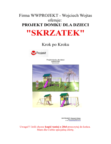 Firma WWPROJEKT - Wojciech Wojtas oferuje: PROJEKT DOMKU DLA DZIECI "SKRZATEK" Krok po Kroku Uwaga!!! Jeśli chcesz kupić taniej o 20zł przeczytaj do końca. Mam dla Ciebie specjalną ofertę. DRODZY RODZICE, dzięki tej aukcji plany budowy domku dla Waszych pociech zaczną nabierać zdecydowanie szybszego tempa. Czy chcielibyście mieć niesamowitą satysfakcję z wybudowania domku w Waszym ogrodzie? A przy tym uznanie w oczach dziecka i jego wdzięczność? Otóż posłuchajcie: Jeszcze nigdy nie było to takie proste! Projekt wykonany w Sytemie WWPROJEKT to gotowy przepis jak solidnie, szybko i w atrakcyjnej cenie wykonać piękny, bezpieczny i funkcjonalny domek, który posiada: zjeżdżalnię huśtawkę piaskownicę pokoik na piętrze z otwieranymi okiennicami taras stoliczek do zabaw na parterze i drabinkę wejściową. Czy jesteś gotowy na MEGA oszczędność? To sprawdź teraz proszę w ofertach internetowych ile kosztuje solidny, gotowy domek o podobnej funkcjonalności, a nawet pozbawiony stoliczka i piaskownicy. Ceny dochodzą do kilku tysięcy złotych? Otóż gwarantuję Ci, że z projektem i własnym zaangażowaniem jesteś w stanie obniżyć tę kwotę minimum... o połowę! PARAMETRY TECHNICZNE DOMKU: Wymiary konstrukcji, wysokość i szerokość przejść zaprojektowano tak, by zapewnić możliwość korzystania z domku nawet nieco starszym pociechom. - wymiary po obrysie zewnętrznym (ze zjeżdżalnią) 5,0 x2,4 m - powierzchnia dachu 4,5m2 - wysokość 3,5 m - materiał: najlepiej suche drewno jodłowe lub świerkowe. ZAMAWIAJĄC PROJEKT otrzymujesz dwie listy: Lista 1: Zestawienie elementów drewnianych z dokładnością do 1mm (przekrój, długość, liczba, ilość mb Z nią zakupisz całe niezbędne drewno. Lista 2: Lista zakupów. Zestawienie ilości niezbędnych wkrętów, śrub, gwoździ, kotew do betonu. Każdy łą przedstawi ci rysunek. Z tą listą idziesz do sklepu metalowego. Na tej liście znajdziesz również kompletne zestawienie akcesoriów, które będziesz mógł zamówić na moic pozostałych aukcjach. Ale nie to jest najważniejsze w całym projekcie… najlepsze jest to że przez wszystkie strony prowadzę Cię krok po kroku za pomocą przejrzystych przestrze rysunków. Nie tracisz ani minuty swojego drogocennego czasu, ponieważ wszystkie szczegóły konstrukcji już są rozwi odpowiednie łączniki dobrane. Stosując się do instrukcji projektu nie musisz zastanawiać się: - jaki dobrać bezpieczny przekrój, - ile danego materiału należy kupić, - ile wkrętów, ile śrub, jaką długość, jak to przykręcić, jak najlepiej , jak najszybciej, a przede wszystkim nie tracisz czasu: - na poprawki i naprawianie niepotrzebnych błędów, - na dodatkowe kursy po drewno, po łączniki, po brakującą ilość pokrycia dachowego. p.s. Możesz bezpiecznie pracować "po godzinach", bez obaw , że staniesz po pół godziny pracy bo nie posia jakiegoś materiału, ponieważ cały materiał skompletowałeś już wcześniej! a w dodatku zyskasz oszczędności drewna, ponieważ żaden element nie jest ani mniejszy ani większy niż powinien. Szacowany czas budowy domku (przy średnim zaangażowaniu 2-3 tyg). Efekt gwarantowany! Uwaga!!! Mam dla Ciebie ofertę specjalną! Twoja opinia jest dla mnie bardzo ważna i jestem za nią gotów zapłacić. Kup teraz projekt domku w formacie pdf. Projekt wyślę na Twój adres e-mail. Jeśli w ciągu 2 dni napiszesz mi szczerą opinię o projekcie (wystarczą 3 konkretne zdania), po otrzymaniu wiadomości od Ciebie zwrócę Ci na konto aż 20,00zł! ps. Uwaga! to jeszcze nie koniec ważnych wiadomości. Musisz wiedzieć, że projekt zrobiłem wg swojej najlepszej wiedzy, z największa starannością i dbałością o szczegóły. Ofertę projektów cały czas doskonalę i zwiększam. Wierzę głęboko, że docenisz wysoką jakość tego opracowania. Dlatego zamiast pisać za Art 15 ustawy o prawach konsumenta i informować Cię: "Charakter produktu jakim są treści cyfrowe, powoduje utratę prawa odstąpienia od umowy", chcę Cię zapewnić, że jeżeli projekt nie spełni Twoich oczekiwań i powiesz mi o tym, ja w takim przypadku zwrócę Ci pieniądze. Wykonaj to więc solidniej, szybciej, taniej i zakup projekt z mojej oferty! GALERIA ZDJĘĆ