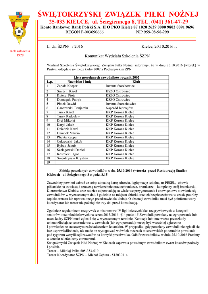 ŚWIĘTOKRZYSKI ZWIĄZEK PIŁKI NOŻNEJ 25-033 KIELCE, ul. Ściegiennego 8, TEL. (041) 361-47-29 Konto Bankowe: Bank Polski S.A. II O PKO Kielce 87 1020 2629 0000 9802 0091 9696 REGON P-003690666 NIP 959-08-98-299 L. dz. ŚZPN/ / 2016 Rok założenia 1928 Kielce, 20.10.2016 r. Komunikat Wydziału Szkolenia ŚZPN Wydział Szkolenia Świętokrzyskiego Związku Piłki Nożnej informuje, że w dniu 25.10.2016 (wtorek) w Pustyni odbędzie się mecz kadry 2002 z Podkarpackim ZPN L.p. 1 2 3 4 5 6 7 8 9 10 11 12 13 14 15 16 17 18 19 Lista powołanych zawodników rocznik 2002 Nazwisko i Imię Klub Zapała Kacper Juventa Starchowice Śmiech Karol Kutera Piotr Domagała Patryk Płatek Dawid Ganczarski Benjamin Turek Karol Turek Radosłąw Drej Mikołaj Karyś Jakub Dziedzic Karol Dziubek Marcin Plichta Kacper Cukrowski Jakub Rybus Jakub Szelągowski Daniel Kośmicki Igor Smerdzyński Krystian KSZO Ostrowiec KSZO Ostrowiec KSZO Ostrowiec Juventa Starachowice Naprzód Jędrzejów KKP Korona Kielce KKP Korona Kielce KKP Korona Kielce KKP Korona Kielce KKP Korona Kielce KKP Korona Kielce KKP Korona Kielce KKP Korona Kielce KKP Korona Kielce KKP Korona Kielce KKP Korona Kielce KKP Korona Kielce Zbiórka powołanych zawodników w dn. 25.10.2016 (wtorek) przed Restauracją Stadion Kielcach ul. Ściegiennego 8 o godz. 8.15 Zawodnicy powinni zabrać ze sobą: aktualną kartę zdrowia, legitymacje szkolną, nr PESEL, obuwie piłkarskie na trawiastą i sztuczną nawierzchnię oraz ochraniacze, bramkarze – kompletny strój bramkarski. Kierownictwo Klubów oraz rodzice odpowiadają za właściwe przygotowanie i obowiązkowe stawienie się zawodników w wyznaczonym dniu i godzinie na miejscu zbiórki oraz ich bezpieczeństwo w czasie podróży (opieka trenera lub uprawnionego przedstawiciela klubu). O absencji zawodnika musi być poinformowany koordynator lub trener nie później niż trzy dni przed konsultacją. Zgodnie z regulaminem rozgrywek o mistrzostwo IV ligi i niższych klas rozgrywkowych w kategorii seniorów oraz młodzieżowych na sezon 2015/2016. §14 punkt 15 Zawodnik powołany na zgrupowanie lub mecz kadry ŚZPN musi zgłosić się w wyznaczonym terminie. Kontuzja lub inne ważne przeszkody uniemożliwiające uczestnictwo w zawodach (lub zgrupowaniu) muszą być wcześniej zgłoszone i potwierdzone stosownym zaświadczeniem lekarskim. W przypadku, gdy powołany zawodnik nie zgłosił się bez usprawiedliwienia, nie może on występować w dwóch meczach mistrzowskich po terminie powołania pod rygorem weryfikacji zawodów na korzyść przeciwnika. Odbiór zawodników w dniu 25.10.2016 Prosimy o kontakt telefoniczny z trenerami. Świętokrzyski Związek Piłki Nożnej w Kielcach zapewnia powołanym zawodnikom zwrot kosztów podróży i posiłek. Trener – Mikołaj Pełka 505-353-510 Trener Koordynator ŚZPN – Michał Gębura - 512030114