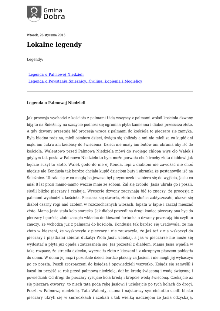 Wtorek, 26 stycznia 2016 Lokalne legendy Legendy: Legenda o Palmowej Niedzieli Legenda o Powstaniu Śnieżnicy, Ćwilina, Łopienia i Mogielicy Legenda o Palmowej Niedzieli Jak procesja wychodzi z kościoła z palmami i idą wszyscy z palmami wokół kościoła dzwony biją to na Śnieżnicy na szczycie podnosi się ogromna płyta kamienna i diaboł przesusza złoto. A gdy dzwony przestają bić procesja wraca z palmami do kościoła to pieczara się zamyka. Była biedna rodzina, mieli ośmioro dzieci, święta się zbliżały a oni nie mieli za co kupić ani mąki ani cukru ani kiełbasy do święcenia. Dzieci nie miały ani butów ani ubrania aby iść do kościoła. Walentowo przed Palmową Niedzielą mówi do swojego chłopa wiys cło Walek i gdybym tak posła w Palmowo Niedzielo to bym może porwała choć trochy złota diabłowi jak będzie susył to złoto. Walek godo do nie ej Konda, lepi z diabłom nie zawożać nie choć nigdzie ale Kondusia tak bardzo chciała kupić dzieciom buty i ubranka że postanowiła iść na Śnieżnice. Ubrała się w co mogłą bo jeszcze był przymrozek i zabiero się do wyjścio, Jasiu co miał 8 lat prosi mamo-mamo wezcie mnie ze sobom. Żal się zrobiło Jasia ubrała go i poszli, siedli blizko pieczary i czakają. Wreszcie dzwony zaczynają bić to znaczy, że procesja z palmami wychodzi z kościoła. Pieczara się otwarła, złoto do słońca zabłyszczało, ukazał się diaboł czarny rogi nad czołem w rozczochranych włosach, łopata w łapie i zaczął mieszać złoto. Mama Jasia stała koło smrecka. Jak diaboł poszedł na drugi koniec pieczary ona hyc do pieczary i garścią złoto zaczęła wkładać do kieszeni fartucha a dzwony przestają bić czyli to znaczy, że wchodzą już z palmami do kościoła. Kondusia tak bardzo się uradowała, że ma złoto w kieszeni, że wyskoczyła z pieczary i nie zauważyła, że Jaś też z nią wskoczył do pieczary i piąstkami zbierał dukaty: Woła Jasiu uciekaj, a Jaś w pieczarze nie może się wydostać a płyta już opada i zatrzasnęła się. Jaś pozostał z diabłem. Mama Jasia wpadła w taką rozpacz, że straciła dziecko, wyrzuciła złoto z kieszeni i z okropnym płaczem pobiegła do domu. W domu jej mąż i pozostałe dzieci bardzo płakały za Jasiem i nie mogli jej wybaczyć po co poszła. Poszli zrozpaczeni do księdza i opowiedzieli wszystko. Ksiądz się zamyślił i kazał im przyjść za rok przed palmową niedzielą, dał im kredę święconą i wodę święconą i powiedział: Od drogi do pieczary rysujcie koła kredą i kropcie wodą święconą. Czekajcie aż się pieczara otworzy to niech tata poda rękę Jasiowi i uciekajcie po tych kołach do drogi. Poszli w Palmową niedzielę. Tata Walenty, mama i najstarszy syn cichutko siedli blisko pieczary ukryli się w smreczkach i czekali z tak wielką nadziejom że Jasia odzyskają. Wreszcie dzwony zaczynały bić to znak że procesja wychodzi z palmami z kościoła, za chwilę usłyszeli dziwny jakby grzmot. Pieczara się otwarła ukazał się diaboł z łopatą w osomolonej łapie i zaczoł mieszać złoto. Koło niego Jaś wychudzony czarny w rączce trzymał małą łopatkę i miesza złoto ale – zerkał oczami w tę stronę gdzie byli rodzice widać czekał cały rok na tę chwilę. Wierzył sam sobie, że na pewno przyjdą aby go ratować, Jak diabeł oddalił się na drugi koniec pieczary tata Walenty jednym susem skoczył do pieczary porwał Jasia na ręce i z trudem ale udało mu się wyskoczyć z pieczary. Zaczęli biec po kołach narysowanych kredą święconą na dół ku drodze, diabeł za nimi zaczął biec ale co wpadł na koło narysowane kredą święconą to kopyrtka postawił i nic mu drogi nie ubywało. Dzwon w Dobrej zaczoł ciszej bić, to znak, że procesja z palmami wróciła do kościoła. Diaboł wściekły jednym susem wrócił do skarbu ze złotem, wówczas olbrzymia płyta z hukiem się zatrzasła. Jaś z rodzicami szczęśliwy wracał do domu. Tata Walenty niósł go na rękach. W domu radość była ogromna siedmioro rodzeństwa witało brata. Te święta były najpiękniejsze w tej rodzinie, chociaż chleba i kołaczy było mało, ale odzyskali brata, który cały rok był na służbie u diabła. Pytaniom nie było końca, a Jaś na pytania odpowiadał „modlijcie się abyście nigdy diabłu nie służyli”, widać bardzo cierpiał przez ten rok. Poszli całą rodziną do Księdza Staruszka, dziękowali mu za dobrą radę w odzyskaniu Jasia. Na podstawie opowiadań Pani Marii Markiewicz Nie wszyscy dziś wiedzą kim była Śnieżnica to córka Łopienia Matka Mogielica Matka jej nie dała poślubić Ćwilina więc serce jej pękło z wielkiego cierpienia Ojciec Łopień cierpiał po stracie swej córki usypał mogiłę dla swej jedynaczki. Mogiła Śnieżnica zarosła drzewami lisy sarny i zające są jej mieszkańcami. Szumi nam Śnieżnica śpiewem drzew iglastych i opowiada dzieje o praojcach naszych. Jak ciężko im było lasy karczowali żeby chociaż trochę więcej pola mieli. Bo tym się żywili co urosło w polu siali jęczmień, owies i trochę ziemniaków Na halach się pasły owce kozy i barany mieli mleko mięso masło i wyborne sery. Ks. Józef Winkowski zwiedził oną górę jak z Rajskiego świata urocza jest ona. Wyrzekł takie słowa był to rok 1930sty sudalicję Mariańską dla młodzieży tu założył Odtąd na Śnieżnicy Boga wysławiamy Ośrodek wyciszenia modlitwy i skupienia mamy. Po tym przyszła wojna okrutna światowa śnieżnica służyła za dom dla podziemia. Niemcy odwet wzięli srodze się zemścili naszą wieś Porąbkę w zgliszcza zamienili. Śnieżnica wówczas bardzo cierpiała nad losem Porąbki gorzkimi łzami się zalała. Trzynaście osób od kul Hitlerowców zginęło a sześdziesiąt siedem zabudowań w popiół się zamieniło Śnieżnica teraz jest oazą na duchowe sił wzmocnienie Ośrodek Rekolekcyjno-Rekreacyjny dla szukających spokoju otwier