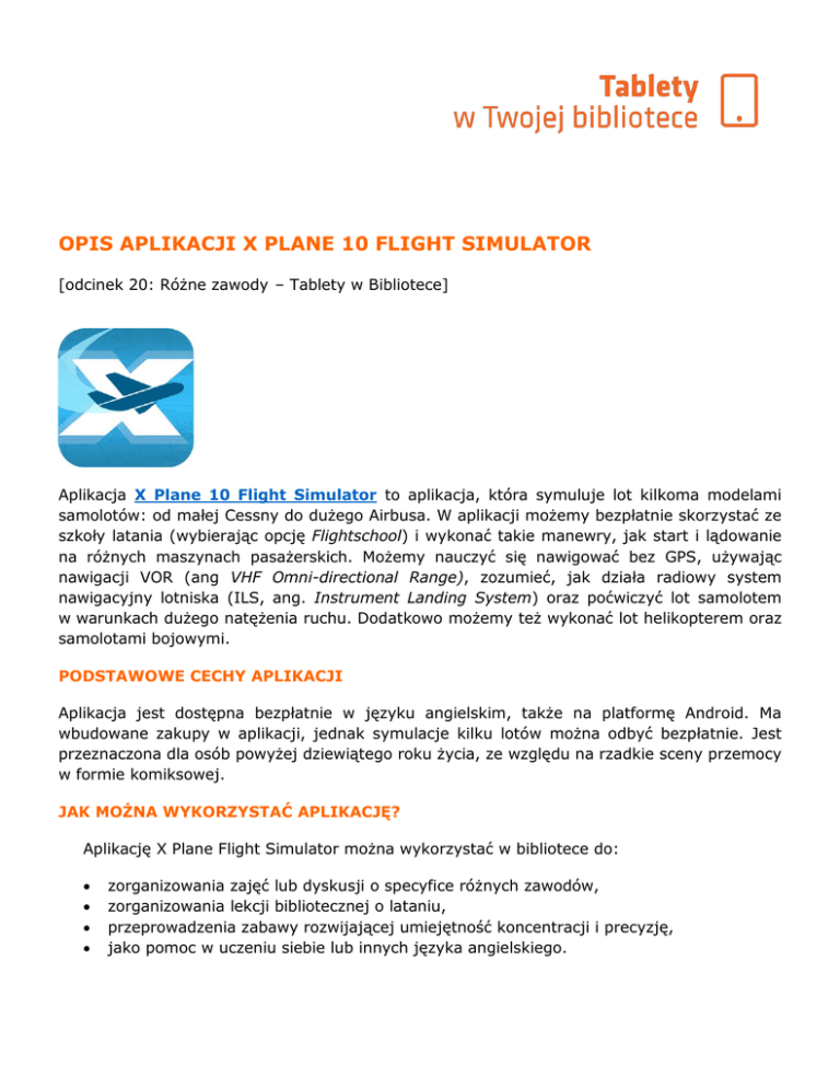 OPIS APLIKACJI X PLANE 10 FLIGHT SIMULATOR [odcinek 20: Różne zawody – Tablety w Bibliotece] Aplikacja X Plane 10 Flight Simulator to aplikacja, która symuluje lot kilkoma modelami samolotów: od małej Cessny do dużego Airbusa. W aplikacji możemy bezpłatnie skorzystać ze szkoły latania (wybierając opcję Flightschool) i wykonać takie manewry, jak start i lądowanie na różnych maszynach pasażerskich. Możemy nauczyć się nawigować bez GPS, używając nawigacji VOR (ang VHF Omni-directional Range), zozumieć, jak działa radiowy system nawigacyjny lotniska (ILS, ang. Instrument Landing System) oraz poćwiczyć lot samolotem w warunkach dużego natężenia ruchu. Dodatkowo możemy też wykonać lot helikopterem oraz samolotami bojowymi. PODSTAWOWE CECHY APLIKACJI Aplikacja jest dostępna bezpłatnie w języku angielskim, także na platformę Android. Ma wbudowane zakupy w aplikacji, jednak symulacje kilku lotów można odbyć bezpłatnie. Jest przeznaczona dla osób powyżej dziewiątego roku życia, ze względu na rzadkie sceny przemocy w formie komiksowej. JAK MOŻNA WYKORZYSTAĆ APLIKACJĘ? Aplikację X Plane Flight Simulator można wykorzystać w bibliotece do: zorganizowania zajęć lub dyskusji o specyfice różnych zawodów, zorganizowania lekcji bibliotecznej o lataniu, przeprowadzenia zabawy rozwijającej umiejętność koncentracji i precyzję, jako pomoc w uczeniu siebie lub innych języka angielskiego. INSPIRACJE Obejrzyj film o tym, jak używać aplikacji X Plane Flight Simulator: https://www.youtube.com/watch?v=DhN1YwezBBU Kurs „Tablety w Bibliotece" powstał w ramach Programu Rozwoju Bibliotek. Program wspiera tysiące bibliotek publicznych w całej Polsce w pełnieniu roli lokalnych centrów aktywności społecznej. W takich placówkach ludzie spędzają czas, rozwijają swoje zainteresowania, zdobywają nowe umiejętności i wspólnie działają. Program Rozwoju Bibliotek to przedsięwzięcie Polsko-Amerykańskiej Fundacji Wolności prowadzone przez Fundację Rozwoju Społeczeństwa Informacyjnego. W latach 2009-2015 było realizowane w ramach partnerstwa z Fundacją Billa i Melindy Gatesów. Ten materiał edukacyjny dostępny jest na licencji Creative Commons CC BY-SA 3.0 Polska. Pełna treść licencji znajduje się na stronie: http://creativecommons.org/licenses/by-sa/3.0/pl/