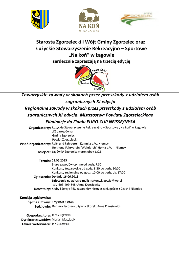 Starosta Zgorzelecki i Wójt Gminy Zgorzelec oraz Łużyckie Stowarzyszenie Rekreacyjno – Sportowe „Na koń” w Łagowie serdecznie zapraszają na trzecią edycję Towarzyskie zawody w skokach przez przeszkody z udziałem osób zagranicznych XI edycja Regionalne zawody w skokach przez przeszkody z udziałem osób zagranicznych XI edycja. Mistrzostwa Powiatu Zgorzeleckiego Eliminacje do Finału EURO-CUP NEISSE/NYSA Organizatorzy: Łużyckie Stowarzyszenie Rekreacyjno – Sportowe „Na koń” w Łagowie JKS Jaroszówka Gmina Zgorzelec Powiat Zgorzelecki Współorganizatorzy: Reit- und Fahrverein Kemnitz e.V., Niemcy Reit- und Fahrverein "Wehrkirch" Horka e.V. , Niemcy Miejsce: Łagów k/ Zgorzelca (teren obok Ł.O.Ś) Termin: 21.06.2015 Biuro zawodów czynne od godz. 7.30 Konkursy towarzyskie od godz. 8:30 do godz. 10:00 Konkursy regionalne od godz. 10:00 do godz. ok. 17:00 Zgłoszenia: Do dnia 16.06.2015 Zgłoszenia na adres e-mail: [email protected] tel. 603-499-848 (Anna Krzesiewicz) Kluby i Sekcje PZJ, zawodnicy niezrzeszeni, goście z Czech i Niemiec Uczestnicy: Komisja sędziowska: Sędzia Główny: Krzysztof Ksztoń Sędziowie: Barbara Jacoszek , Sylwia Skorek, Anna Krzesiewicz Gospodarz toru: Jacek Pękalski Dyrektor zawodów: Marian Matyjasik Lekarz weterynarii: Jan Żurowski Program Zawodów: Zawody towarzyskie „debiuty”: 1. LL 40 cm „krzyżaczki” – konkurs dokładności z niespodzianką 2. LL 60 -70 cm (stacjonaty z jednym okserem) – konkurs dokładności 3. LL 90 cm konkurs dokładności (238.1.1) Zawody regionalne: 1. LL 90 cm konkurs dokładności (238.1.1) Seria A: KUCE, dzieci do lat 16. Seria B: Pozostałe konie i zawodnicy 2. L 100 cm dokładności z rozgrywką – rozgrywka na czas (art. 238 1.2) Mistrzostwa Powiatu Zgorzeleckiego 3. P 110 cm konkurs dwufazowy (art. 274 5.2) - ELIMINACJE Pucharu EURO_CUP NEISSE NYSA (Pierwsza faza konkurs dokładności, druga faza konkurs zwykły) 4. N 120 cm o wzrastającym stopniu trudności(z Jokerem) (art. 269.5) 5. C 130 cm zwykły (art. 238.2.1) Rodzaj podłoża: Parkur i rozprężania – trawiaste podłoże Konkursy towarzyskie: 1, 2 - 20zł / 5 EUR, 3 - 40zł / 10 EUR Konkursy regionalne: 1, 2, 3 - 40zł / 10 EUR 4, 5 - 50zł / 12 EUR Wpisowe: Zawodnicy zobowiązani są do uiszczenia opłaty w gotówce na minimum 1 godzinę przed rozpoczęciem konkursu. Członkowie Stowarzyszenia NA KOŃ z zapłaconą składką członkowską za 2015 rok do dnia 18 czerwca są zwolnieni z opłaty startowej. Listy będą widoczne na stronie: www.nakonwlagowie.pl najpóźniej 19.06.2015 (pt.) od godz. 18.00 Listy startowe: Sprawy organizacyjne: Zgłoszenia powinny zawierać nr PZJ konia i nr PZJ zawodnika a także nr konkursu. Zmiany na listach startowych po terminie zgłoszeń lub w dniu zawodów: opłata 20 zł. Dla osób, które chcą brać udział w polsko-niemieckim Pucharze EURO-CUP NEISSE NYSA (oddzielny regulamin dostępny na www.nakonwlagowie.pl) wymagane jest osobne zgłoszenie na e-mail: [email protected] do dnia 16 czerwca 2015. Organizator nie zapewnia boksów dla koni. Dokumentacja zgodnie z przepisami PZJ. Obowiązują aktualne badania weterynaryjne koni oraz szczepienia. Bez w/w dokumentów konie nie będą dopuszczone do startów! Obowiązuje zgoda od lekarza na start zawodnika, także w konkursach towarzyskich! Osoby nieletnie proszone są o przedstawienie pisemnej zgody rodziców na start w zawodach. Na całym terenie zawodów, wszystkie osoby dosiadające koni obowiązuje noszenie prawidłowo zapiętego ochronnego nakrycia głowy (kask, toczek) Organizator nie ponosi odpowiedzialności za wypadki, szkody i kradzieże podczas zawodów. Organizator zastrzega sobie prawo do zmiany w programie zawodów, a w przypadku niewystarczającej liczby zgłoszeń - do odwołania niektórych konkursów lub ograniczenia puli nagród finansowych. Mistrzem Powiatu Zgorzeleckiego może zostać zawodnik zamieszkały na terenie powiatu zgorzeleckiego (osobna dekoracja). NAGRODY W KONKURSACH Konkursy towarzyskie Nr. 1. Konkurs LL-40 cm Nagrody za czyste przejazdy Flot’s, drobne nagrody rzeczowe! 2. LL-60-70 cm Flot’s, drobne nagrody rzeczowe! 3. LL-90 cm Seria A, Seria B Flot’s, drobne nagrody rzeczowe! Konkursy regionalne Nr. Konkurs 1. 2. LL-90 cm Seria A, Seria B L-100 cm 3. 4. 5. P-110 cm N-120 cm C-130 cm 1.miejsce Puchar, 200zł Puchar, 300zł Puchar, 400zł 2.miejsce Flot’s, nagrody rzeczowe! Pozostałe czyste przejazdy - Flot’s, nagrody rzeczowe! - Puchar 150zł Puchar 250zł Puchar 300zł 3.miejsce Puchar 100zł Puchar 200zł Puchar 250zł Flot’s - Organizator zastrzega sobie możliwość obniżenia nagród o 50% w przypadku małej frekwencji KODEKS POSTĘPOWANIA Z KONIEM: Polski Związek Jeździecki prosi wszystkie osoby zaangażowane w jakikolwiek sposób w sporty konne, o przestrzeganie poniżej przedstawionego kodeksu oraz zasady, że dobro konia jest najważniejsze. Dobro konia musi być zawsze i wszędzie uwzględniane w sportach konnych i nie może być podporządkowane współzawodnictwu sportowemu ani innym celom np. komercyjnym. I. Na wszystkich etapach treningu i przygotowań konia do startu w zawodach, dobro konia musi stać ponad wszelkimi innymi wymaganiami. Dotyczy to stałej opieki, metod treningu, starannego obrządku, kucia i transportu. II. Konie i jeźdźcy muszą być wytrenowani, kompetentni i zdrowi zanim wezmą udział w zawodach. Odnosi się to także do podawania leków i środków medycznych, zabiegów chirurgicznych zagrażających dobru konia lub ciąży klaczy, oraz do przypadków nadużywania pomocy. III. Zawody nie mogą zagrażać dobru konia. Wymaga to zwrócenia szczególnej uwagi na teren zawodów, powierzchnię podłoża, pogodę, warunki stajenne, kondycję koni i ich bezpieczeństwo także podczas podróży powrotnej z zawodów. IV. Należy dołożyć wszelkich starań, aby zapewnić koniom staranną opiekę po zakończeniu zawodów, a także humanitarne traktowanie po zak