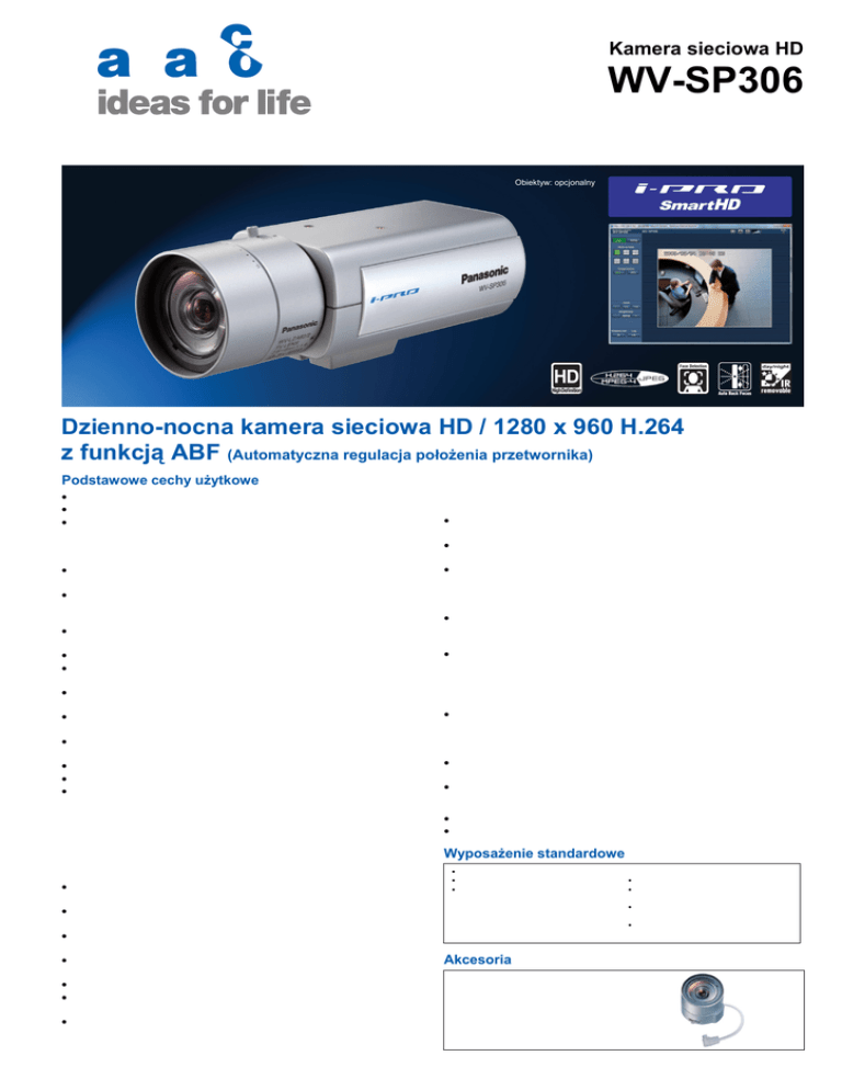 Kamera sieciowa HD WV-SP306 Obiektyw: opcjonalny Dzienno-nocna kamera sieciowa HD / 1280 x 960 H.264 z funkcją ABF (Automatyczna regulacja położenia przetwornika) Podstawowe cechy użytkowe • Obraz w rozdzielczości 720p HD o częstotliwości odświeżania maks. 30 obrazów/s. • Nowo opracowany przetwornik MOS 1,3 megapiksela o wysokiej czułości. • Kilka strumieni H.264 (High profile) oraz strumienie JPEG zapewniają jednoczesne monitorowanie w czasie rzeczywistym oraz wysoką rozdzielczość zapisu dzięki platformie systemowej LSI „UniPhier®” będącej własnym opracowaniem firmy Panasonic. • Transmisja pełnej ramki (maks. 30 obrazów/s) przy rozdzielczości obrazu 1280 x 960. • Technologie Wide Dynamic Range (Szeroki zakres dynamiki) oraz ABS (Adaptacyjne rozszerzanie czerni) zapewniają szerszy zakres dynamiki w porównaniu do konwencjonalnych kamer. • Technologia Face Wide Dynamic Range (Szeroki zakres dynamiki twarzy) zapewnia wyraźny obraz twarzy. • Możliwy wybór standardu H.264 lub MPEG-4 w celu migracji systemu. • Wysoka czułość dzięki funkcji pracy dzienno-nocnej: 0,3 lx (kolor), 0,05 lx (czarnobiały) przy przysłonie F1.4. • Automatyczna regulacja położenia przetwornika (ABF) zapewniająca łatwą instalację i stabilne ogniskowanie w trybie kolorowym i czarno-białym. • Cyfrowa redukcja szumów: całkowanie 3D-DNR zapewnia zmniejszony poziom szumów w różnych warunkach. • Progresywne skanowanie zapewnia klarowne obrazy z mniejszym rozmyciem ruchu i bez poszarpanych krawędzi poruszającego się obiektu. • Polepszona reprodukcja kolorów dzięki filtrowi barw podstawowych (RGB). • Elektroniczne zwiększenie czułości: automatyczne (maks. 16x) / wył. • Tryby pracy automatycznej przysłony: Outdoor / Indoor / ELC / stała migawka elektroniczna. Outdoor / Indoor: elektroniczna migawka i automatyczna przysłona obiektywu są automatycznie sterowane w zależności od trybu i poziomu oświetlenia. ELC (Elektroniczna migawka): stosowana jest migawka elektroniczna maks. 1/10 000 w przypadku obiektywów ze stałą przysłoną. Stała migawka elektroniczna: możliwość wyboru stałej elektronicznej migawki maks. 1/10 000. • Wizyjna detekcja ruchu (VMD) z 4 programowalnymi obszarami detekcji, 15 poziomami czułości i 10 wielkościami detekcji. • Funkcja wykrywania twarzy wykrywa twarz w obrazie z kamery i przesyła tę informację przez XML lub w strumieniu wizyjnym. • Uzupełnieniem wizyjnej detekcji ruchu (VMD) są metadane służące do współpracy z funkcją odtwarzania VMD w rejestratorze WJ-ND400. • Strefa prywatności może maskować maks. 2 obszary w rodzaju okien domu czy wejść / wyjść. • Cyfrowy zoom 2x, 4x obsługiwany przez przeglądarkę. • Wyświetlanie nazwy kamery: maks. 20 znaków alfanumerycznych w przeglądarce, maks. 16 znaków alfanumerycznych nakładanych na obraz. • Źródła sygnałów alarmowych zawierające 1 wejście zaciskowe, wizyjną detekcję ruchu (VMD) oraz polecenia alarmowe Panasonic mogą uruchamiać działania w rodzaju zapisu w pamięci SDHC / SD, przesyłania obrazów na serwer FTP, • • • • • • • • powiadamiania e-mail, wskazania w przeglądarce, podania sygnału na wyjście alarmowe i wyjście z protokołem Panasonic. W pełni dupleksowe, dwukierunkowe przesyłanie dźwięku zapewnia interaktywną komunikację z lokalizacją kamery i monitorowanym obszarem. Po otrzymaniu sygnału alarmowego można zmienić współczynnik kompresji JPEG, co umożliwi przesyłanie obrazów o wyższej jakości. Sterowanie priorytetowym strumieniem: jeśli kilka rejestratorów lub klientów PC dostaje się jednocześnie do kamery, jeden ze strumieni może posiadać priorytet, dzięki czemu dany rejestrator lub klient PC otrzymuje strumień o niepogorszonej częstotliwości odświeżania. Gniazdo karty pamięci SDHC / SD do zapisu sterowanego ręcznie (H.264 / JPEG), zapisu alarmowego (H.264 / JPEG) i zapisu awaryjnego na wypadek awarii sieci (JPEG). Sterowanie maks. przepływnością w standardach H.264 / MPEG-4 dla każdego klienta i całkowitą przepływnością binarną zapewnia elastyczne zarządzanie ruchem w sieci. Tryb priorytetowy częstotliwości odświeżania umożliwia sterowanie przepływnością i współczynnikiem kompresji w celu zapewnienia ustawionej częstotliwości odświeżania. Rejestr alarmów, rejestr zapisu uruchamianego ręcznie oraz rejestr błędów FTP zapisywane na karcie SDHC / SD są wyświetlane w oknie interfejsu użytkownika przeglądarki i mogą być pobrane do klienta PC (komputer PC). Poprzez rejestr możliwe jest również pobieranie obrazów lub ich odtwarzanie. Tryb internetowy: obrazy H.264 / MPEG-4 mogą być transmitowane przy pomocy protokołu HTTP. Wielojęzyczny interfejs użytkownika i menu konfiguracyjne: jęz. angielski, francuski, włoski, hiszpański, niemiecki, rosyjski (PAL) / angielski, francuski (NTSC). * Wymagana instalacja z wyjątkiem jęz. angielskiego • Obsługa protokołów IPv4 / IPv6. • Wyjście monitora analogowego ułatwiające instalację. Wyposażenie standardowe y Płyta CD-ROM ............................................ 1 szt. y Instrukcja instalacji ..................................... 1 szt. y Etykieta kodowa ......................................... 1 szt. Akcesoria Obiektyw zmiennoogniskowy 1/3", wysoka rozdzielczość, 2x WV-LZA62/2 2,8 - 6 mm F1.4 (szerokokątny) F2.1 (teleobiektyw) Do instalacji używane są następujące elementy: y Wtyk kabla zasilającego ................................ 1 szt. y Płyta do linki zabezpieczającej (do montażu sufitowego) ................................................... 1 szt. y Oczko linki zabezpieczającej (do montażu ściennego) .................................................... 1 szt. y Wkręty mocujące do wspornika montażowego (M2.5 x 8) ..2 szt. (łącznie z wkrętem zapasowym) Dane techniczne System TV Kamera Przetwornik obrazu Liczba efektywnych pik