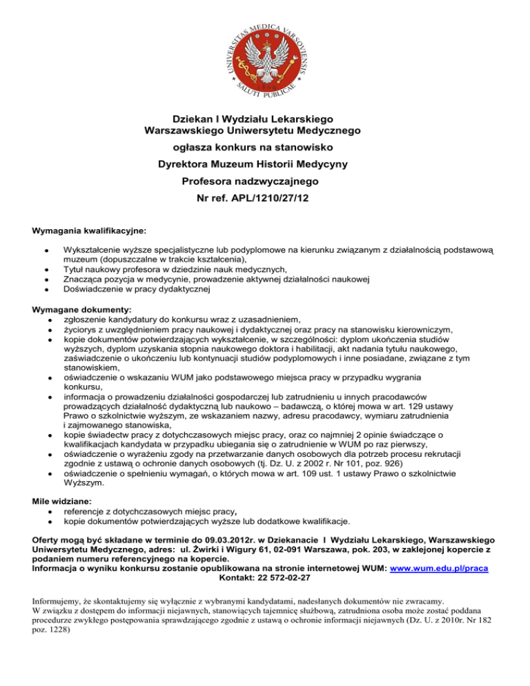 Dziekan I Wydziału Lekarskiego Warszawskiego Uniwersytetu Medycznego ogłasza konkurs na stanowisko Dyrektora Muzeum Historii Medycyny Profesora nadzwyczajnego Nr ref. APL/1210/27/12 Wymagania kwalifikacyjne: Wykształcenie wyższe specjalistyczne lub podyplomowe na kierunku związanym z działalnością podstawową muzeum (dopuszczalne w trakcie kształcenia), Tytuł naukowy profesora w dziedzinie nauk medycznych, Znacząca pozycja w medycynie, prowadzenie aktywnej działalności naukowej Doświadczenie w pracy dydaktycznej Wymagane dokumenty: zgłoszenie kandydatury do konkursu wraz z uzasadnieniem, życiorys z uwzględnieniem pracy naukowej i dydaktycznej oraz pracy na stanowisku kierowniczym, kopie dokumentów potwierdzających wykształcenie, w szczególności: dyplom ukończenia studiów wyższych, dyplom uzyskania stopnia naukowego doktora i habilitacji, akt nadania tytułu naukowego, zaświadczenie o ukończeniu lub kontynuacji studiów podyplomowych i inne posiadane, związane z tym stanowiskiem, oświadczenie o wskazaniu WUM jako podstawowego miejsca pracy w przypadku wygrania konkursu, informacja o prowadzeniu działalności gospodarczej lub zatrudnieniu u innych pracodawców prowadzących działalność dydaktyczną lub naukowo – badawczą, o której mowa w art. 129 ustawy Prawo o szkolnictwie wyższym, ze wskazaniem nazwy, adresu pracodawcy, wymiaru zatrudnienia i zajmowanego stanowiska, kopie świadectw pracy z dotychczasowych miejsc pracy, oraz co najmniej 2 opinie świadczące o kwalifikacjach kandydata w przypadku ubiegania się o zatrudnienie w WUM po raz pierwszy, oświadczenie o wyrażeniu zgody na przetwarzanie danych osobowych dla potrzeb procesu rekrutacji zgodnie z ustawą o ochronie danych osobowych (tj. Dz. U. z 2002 r. Nr 101, poz. 926) oświadczenie o spełnieniu wymagań, o których mowa w art. 109 ust. 1 ustawy Prawo o szkolnictwie Wyższym. Mile widziane: referencje z dotychczasowych miejsc pracy, kopie dokumentów potwierdzających wyższe lub dodatkowe kwalifikacje. Oferty mogą być składane w terminie do 09.03.2012r. w Dziekanacie I Wydziału Lekarskiego, Warszawskiego Uniwersytetu Medycznego, adres: ul. Żwirki i Wigury 61, 02-091 Warszawa, pok. 203, w zaklejonej kopercie z podaniem numeru referencyjnego na kopercie. Informacja o wyniku konkursu zostanie opublikowana na stronie internetowej WUM: www.wum.edu.pl/praca Kontakt: 22 572-02-27 Informujemy, że skontaktujemy się wyłącznie z wybranymi kandydatami, nadesłanych dokumentów nie zwracamy. W związku z dostępem do informacji niejawnych, stanowiących tajemnicę służbową, zatrudniona osoba może zostać poddana procedurze zwykłego postępowania sprawdzającego zgodnie z ustawą o ochronie informacji niejawnych (Dz. U. z 2010r. Nr 182 poz. 1228)