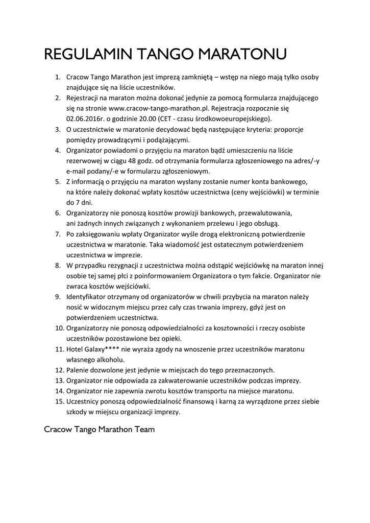 REGULAMIN TANGO MARATONU 1. Cracow Tango Marathon jest imprezą zamkniętą – wstęp na niego mają tylko osoby znajdujące się na liście uczestników. 2. Rejestracji na maraton można dokonać jedynie za pomocą formularza znajdującego się na stronie www.cracow-tango-marathon.pl. Rejestracja rozpocznie się 02.06.2016r. o godzinie 20.00 (CET - czasu środkowoeuropejskiego). 3. O uczestnictwie w maratonie decydować będą następujące kryteria: proporcje pomiędzy prowadzącymi i podążającymi. 4. Organizator powiadomi o przyjęciu na maraton bądź umieszczeniu na liście rezerwowej w ciągu 48 godz. od otrzymania formularza zgłoszeniowego na adres/-y e-mail podany/-e w formularzu zgłoszeniowym. 5. Z informacją o przyjęciu na maraton wysłany zostanie numer konta bankowego, na które należy dokonać wpłaty kosztów uczestnictwa (ceny wejściówki) w terminie do 7 dni. 6. Organizatorzy nie ponoszą kosztów prowizji bankowych, przewalutowania, ani żadnych innych związanych z wykonaniem przelewu i jego obsługą. 7. Po zaksięgowaniu wpłaty Organizator wyśle drogą elektroniczną potwierdzenie uczestnictwa w maratonie. Taka wiadomość jest ostatecznym potwierdzeniem uczestnictwa w imprezie. 8. W przypadku rezygnacji z uczestnictwa można odstąpić wejściówkę na maraton innej osobie tej samej płci z poinformowaniem Organizatora o tym fakcie. Organizator nie zwraca kosztów wejściówki. 9. Identyfikator otrzymany od organizatorów w chwili przybycia na maraton należy nosić w widocznym miejscu przez cały czas trwania imprezy, gdyż jest on potwierdzeniem uczestnictwa. 10. Organizatorzy nie ponoszą odpowiedzialności za kosztowności i rzeczy osobiste uczestników pozostawione bez opieki. 11. Hotel Galaxy**** nie wyraża zgody na wnoszenie przez uczestników maratonu własnego alkoholu. 12. Palenie dozwolone jest jedynie w miejscach do tego przeznaczonych. 13. Organizator nie odpowiada za zakwaterowanie uczestników podczas imprezy. 14. Organizator nie zapewnia zwrotu kosztów transportu na miejsce maratonu. 15. Uczestnicy ponoszą odpowiedzialność finansową i karną za wyrządzone przez siebie szkody w miejscu organizacji imprezy. Cracow Tango Marathon Team