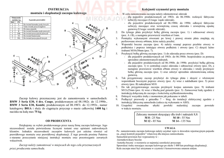 INSTRUKCJA montaŜu i eksploatacji zaczepu kulowego Oznaczenie zacisku wg ISO PN 1 L 2 + 3 31 4 R 5 58R 6 54 7 58L Kolejność czynności przy montaŜu 1. Łączenie przewodów 4 Do świateł kierunku jazdy lewych Tylne światła przeciwmgłowe Do masy pojazdu Do świateł kierunku jazdy prawych Do świateł pozycyjnych prawych Do świateł hamowania Do świateł pozycyjnych lewych B 8 C 7 4 1 5 6 D B C 7 A D 9 3 2 Zaczep kulowy przeznaczony jest do zamontowania w samochodach: BMW 3 Seria E30, 4 drz. Coupe, produkowanym od 08.1982r. do 12.1990r., BMW 3 Seria E30, Kombi, produkowanym od 08.1987r. do 12.1993r., numer katalogowy B01A i słuŜy do ciągnięcia przyczep o masie całkowitej 1400 kg i nacisku na kulę max 75 kg. OD PRODUCENTA Dziękujemy za wybór produkowanego przez naszą firmę zaczepu kulowego. Jego niezawodność została potwierdzona licznymi testami oraz opiniami zadowolonych klientów. JednakŜe niezawodność zaczepów kulowych jest zaleŜna równieŜ od prawidłowego montaŜu oraz prawidłowej eksploatacji. Z tego powodu prosimy Państwa o staranne przeczytanie niniejszej instrukcji montaŜu oraz przestrzeganie zawartych wskazówek. Zaczep naleŜy zamontować w miejscach do tego celu przeznaczonych przez producenta samochodu. W celu zamontowania zaczepu naleŜy zdemontować zderzak - dla pojazdów produkowanych od 1983r. do 06.1988r. rozkręcić fabryczne uchwyty mocujące (Uwaga: wąski zderzak). - dla pojazdów produkowanych od 06.1988r. do 1990r. odkręcić fabryczne uchwyty mocujące oraz wewnętrzną czaszę zderzaka i zewnętrzną opaskę gumową (Uwaga: szeroki zderzak). 2. Do tylnego płata przyłoŜyć belkę główną zaczepu (poz. 1) i odtrasować otwory (poz. A i B), a następnie przewiercić wiertłem ø11mm. 3. Pomiędzy wykonanymi otworami po lewej i prawej stronie płata znajdują się perforowane otwory ø46mm, które naleŜy przebić. 4. Wsporniki boczne zaczepu (poz. 4) naleŜy wsunąć poprzez przebite otwory w podłuŜnice i poprzez istniejące otwory podłuŜnic i otwory (poz. C) skręcić luźno śrubami M10x30mm (poz. 7). 5. Przykręcić belkę główną zaczepu (poz. 1) do zderzaka przez otwory (poz. D) - dla pojazdów produkowanych od 1983r. do 06.1988r. bezpośrednio za pomocą uprzednio zdemontowanych nakrętek. - dla pojazdów produkowanych od 06.1988r. do 1990r. przyłoŜyć belkę główną zaczepu (poz. 1) w centralnej części zderzaka i odtrasować otwory (poz. D), a następnie przewiercić wiertłem ø9mm otwory w zderzaku i wtedy przykręcić belkę główną zaczepu (poz. 1) oraz załoŜyć uprzednio zdemontowaną osłonę gumową. 6. Tak przygotowany zaczep przyłoŜyć do tylnego płata i skręcić z włoŜonymi wspornikami bocznymi poprzez otwory (poz. A) wraz z nakładkami (poz. 5) przez otwory (poz. B) nakrętkami M10. 7. Do tak przygotowanego zaczepu przykręcić korpus automatu (poz. 9) śrubami M12x25mm (poz. 6) wraz z blachą pod gniazdo (poz. 3). Zamocować kulę zgodnie z instrukcją dołączaną do zaczepu z końcówką szybkodemontowalną. 8. Dokręcić wszystkie śruby z momentem jak pokazano w tabeli. 9. Podłączyć przewody z gniazdka 7 – bieg. do instalacji elektrycznej zgodnie z instrukcją fabryczną samochodu (zaleca się wykonanie w ASO). 10. Uzupełnić ewentualne ubytki powłoki malarskiej zaczepu powstałe w trakcie montaŜu. Zalecany moment skręcający dla śrub i nakrętek 8,8: M 8 - 25 Nm M 10 - 55 Nm M 12 - 85 Nm M 14 - 135 Nm UWAGA Po zamontowaniu zaczepu kulowego naleŜy uzyskać wpis w dowodzie rejestracyjnym pojazdu na „stacji kontroli pojazdów” właściwej dla miejsca zamieszkania. Samochód powinien być wyposaŜony w : -kierunkowskazy boczne -lusterka boczne o rozstawie co najmniej szerokości przyczepy Sprawdzać śruby mocujące zaczepu kulowego po około 1 000 km przebiegu eksploatacji. Kula zaczepu musi być utrzymana w czystości i konserwowana smarem stałym. WyposaŜenie zaczepu: PPUH AUTO-HAK S.J. Produkcja Haków Holowniczych Henryk & Zbigniew Nejman 76-200 SŁUPSK ul. Słoneczna 16K tel/fax (059) 8-414-414; 8-414-413 e-mail: [email protected] www. autohak.com.pl Zaczep kulowy bez wyposaŜenia elektrycznego Klasa: A50-X Nr kat. B01A Przeznaczony do zamontowania w samochodzie: Producent: BMW Model: SERIA 3 (E30) Typ: 4drz., COUPE produkowanym od 08.1982r. do 12.1990r. Typ: KOMBI produkowanym od 08.1987r. do 12.1993r. KARTA GWARANCYJNA Producent udziela gwarancji niniejszą kartą gwarancyjną na okres 24 miesięcy licząc od dnia zakupu zaczepu kulowego do samochodu: Dane techniczne: Wartość siły D : 7,53 kN maksymalna masa przyczepy: 1400 kg maksymalny nacisk na kulę: 75 kg Numer homologacji zgodnie z dyrektywą 94/20/WE: e20*94/20*0368*00 BMW 3 Seria E30, 4 drz. Coupe – produkowanego od 08.1982r. do 12.1990r. 3 Seria E30, Kombi – produkowanego od 08.1987r. do 12.1993r. Data produkcji .............................. Data zakupu............................................. Zakres gwarancji obejmuje wyłącznie wady jakościowe wynikające z winy producenta. Gwarancja nie obejmuje natomiast uszkodzeń zawinionych przez nabywcę, wynikających z niewłaściwego montaŜu, uŜytkowania lub konserwacji, uszkodzeń mechanicznych, normalnego zuŜycia podczas eksploatacji itp. Gwarancja udzielona na zakupiony towar nie wyłącza, nie ogranicza ani nie zawiesza uprawnień kupującego wynikających z niezgodności towaru z umową. Reklamacje naleŜy zgłaszać w punkcie sprzedaŜy, składając jednocześnie kartę gwarancyjną. Usunięcie "wady" następuje po stwierdzeniu przez punkt sprzedaŜy wspólnie z producentem słuszności złoŜonej reklamacji. Reklamacja powinna być załatwiona w ciągu 14 dni od dnia uznania reklamacji. Karta gwarancyjna jest niewaŜna jeŜeli nie jest wypełniona i podpisana. Data zgłoszenia reklamacji: ................................................................... INFORMACJA WSTĘPNA Zaczep kulowy jest skonstruowany zgodnie z zasadami bezpieczeńs