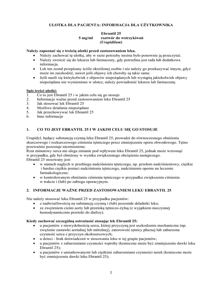 ULOTKA DLA PACJENTA: INFORMACJA DLA UŻYTKOWNIKA 5 mg/ml Ebrantil 25 roztwór do wstrzykiwań (Urapidilum) Należy zapoznać się z treścią ulotki przed zastosowaniem leku. Należy zachować tę ulotkę, aby w razie potrzeby można było ponownie ją przeczytać. Należy zwrócić się do lekarza lub farmaceuty, gdy potrzebna jest rada lub dodatkowa informacja. Lek ten został przepisany ściśle określonej osobie i nie należy go przekazywać innym, gdyż może im zaszkodzić, nawet jeśli objawy ich choroby są takie same. Jeśli nasili się którykolwiek z objawów niepożądanych lub wystąpią jakiekolwiek objawy niepożądane nie wymienione w ulotce, należy powiadomić lekarza lub farmaceutę. Spis treści ulotki: 1. Co to jest Ebrantil 25 i w jakim celu się go stosuje 2. Informacje ważne przed zastosowaniem leku Ebrantil 25 3. Jak stosować lek Ebrantil 25 4. Możliwe działania niepożądane 5. Jak przechowywać lek Ebrantil 25 6. Inne informacje 1. CO TO JEST EBRANTIL 25 I W JAKIM CELU SIĘ GO STOSUJE Urapidyl, będący substancją czynną leku Ebrantil 25, prowadzi do równoczesnego obniżenia skurczowego i rozkurczowego ciśnienia tętniczego przez zmniejszenie oporu obwodowego. Tętno przeważnie pozostaje niezmienione. Rzut minutowy serca nie ulega zmianie pod wpływem leku Ebrantil 25, jednak może wzrosnąć w przypadku, gdy był obniżony w wyniku zwiększonego obciążenia następczego. Ebrantil 25 stosowany jest: w stanach nagłych w przebiegu nadciśnienia tętniczego, np. przełom nadciśnieniowy, ciężkie i bardzo ciężkie postaci nadciśnienia tętniczego, nadciśnienie oporne na leczenie farmakologiczne; w kontrolowanym obniżaniu ciśnienia tętniczego w przypadku zwiększenia ciśnienia w trakcie i (lub) po zabiegu operacyjnym. 2. INFORMACJE WAŻNE PRZED ZASTOSOWANIEM LEKU EBRANTIL 25 Nie należy stosować leku Ebrantil 25 w przypadku pacjentów: z nadwrażliwością na substancję czynną i (lub) pozostałe składniki leku; ze zwężeniem cieśni aorty lub przetoką tętniczo-żylną (z wyjątkiem nieczynnej hemodynamicznie przetoki do dializy). Kiedy zachować szczególną ostrożność stosując lek Ebrantil 25: u pacjentów z niewydolnością serca, której przyczyną jest uszkodzenie mechaniczne (np. zwężenie zastawki aortalnej lub mitralnej), zatorowość tętnicy płucnej lub zaburzona czynność serca z przyczyn okołosercowych; u dzieci - brak doświadczeń w stosowaniu leku w tej grupie pacjentów; u pacjentów z zaburzeniami czynności wątroby (konieczne może być zmniejszenie dawki leku Ebrantil 25); u pacjentów z umiarkowanymi lub ciężkimi zaburzeniami czynności nerek (konieczne może być zmniejszenie dawki leku Ebrantil 25); 1 u pacjentów w podeszłym wieku. Ze względu na zmienioną wrażliwość osób w podeszłym wieku, leki obniżające ciśnienie należy stosować początkowo w mniejszych dawkach; u pacjentów leczonych równocześnie cymetydyną (patrz również: Stosowanie innych leków). Jeśli podano wcześniej inny lek zmniejszający ciśnienie tętnicze, przed podaniem leku Ebrantil 25 należy czekać na uwidocznienie wpływu podanego leku na wartość ciśnienia, a następnie odpowiednio zmniejszyć dawkowanie leku Ebrantil 25. Nadmiernie szybki spadek ciśnienia krwi może prowadzić do zwolnienia lub zatrzymania akcji serca. Ciąża i karmienie piersią Przed zastosowaniem każdego leku należy poradzić się lekarza lub farmaceuty. Nie zaleca się stosowania leku Ebrantil 25 w czasie ciąży, chyba że ze wskazań doraźnych. Karmienie piersią Ebrantil 25 nie może być stosowany u kobiet karmiących piersią. Prowadzenie pojazdów i obsługa maszyn: Ze względu na indywidualną reakcję na lek, zdolność prowadzenia pojazdów mechanicznych i obsługiwania urządzeń mechanicznych w ruchu może być upośledzona. Może to się zdarzyć zwłaszcza na początku leczenia, przy zwiększeniu dawki leku, zmianie leku na inny oraz w przypadku spożywania alkoholu w trakcie stosowania leku. Stosowanie leku Ebrantil 25 z innymi lekami Należy poinformować lekarza o wszystkich przyjmowanych ostatnio lekach, nawet tych, które wydawane są bez recepty. Działanie urapidylu zmniejszające ciśnienie krwi może być nasilone: przez jednoczesne stosowanie antagonistów receptorów alfa-adrenergicznych (np. klonidyna), leków rozszerzających naczynia oraz innych leków obniżających ciśnienie; przez odwodnienie organizmu spowodowane np. wymiotami lub biegunką; alkohol. Równoczesne stosowanie cymetydyny (lek przeciw nadkwasocie) może spowodować wzrost stężenia urapidylu w surowicy o 15%. Ze względu na brak wystarczających danych dotyczących wzajemnego oddziaływania leku Ebrantil 25 i inhibitorów konwertazy angiotensyny (leki stosowane w nadciśnieniu i chorobach serca), nie należy stosować tych leków równocześnie. 3. JAK STOSOWAĆ LEK EBRANTIL 25 Stany nagłe w przebiegu nadciśnienia tętniczego np. przełom nadciśnieniowy, ciężkie i bardzo ciężkie postaci nadciśnienia tętniczego, nadciśnienie oporne na leczenie farmakologiczne. 1) Wstrzyknięcia dożylne 10 do 50 mg urapidylu należy powoli podawać dożylnie z jednoczesnym monitorowaniem ciśnienia krwi. Obniżenie ciśnienia występuje zwykle w ciągu 5 minut po podaniu leku. W zależności od reakcji, podanie leku Ebrantil 25 można powtórzyć. 2) Wlew kroplowy dożylny lub wlew ciągły z użyciem pompy infuzyjnej W celu utrzymania poziomu ciśnienia tętniczego uzyskanego po wstrzyknięciu, należy przygotować w następujący sposób wlew kroplowy roztworu: do 500 ml roztworu do infuzji np. 0,9% roztworu chlorku sodu, 5% lub 10% roztworu glukozy, należy dodać 250 mg urapidylu (10 ampułek leku Ebrantil 25). Jeżeli dawkę podtrzymującą podaje się przy użyciu pompy infuzyjnej, należy 100 mg urapidylu (4 ampułki leku Ebrantil 25) rozcieńczyć w strzykawce pompy infuzyjnej jednym z podanych wyżej roztworów infuzyjnych do objętości 50 
