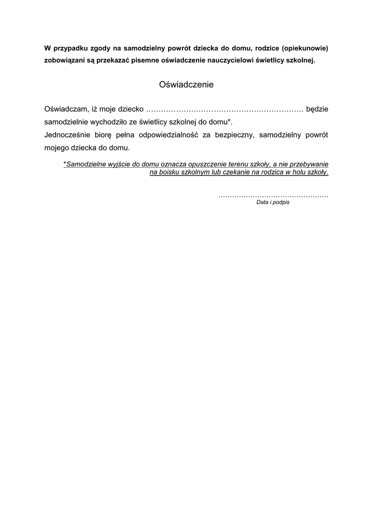 W przypadku zgody na samodzielny powrót dziecka do domu, rodzice (opiekunowie) zobowiązani są przekazać pisemne oświadczenie nauczycielowi świetlicy szkolnej. Oświadczenie Oświadczam, iż moje dziecko ……………………………………………………… będzie samodzielnie wychodziło ze świetlicy szkolnej do domu*. Jednocześnie biorę pełna odpowiedzialność za bezpieczny, samodzielny powrót mojego dziecka do domu. *Samodzielne wyjście do domu oznacza opuszczenie terenu szkoły, a nie przebywanie na boisku szkolnym lub czekanie na rodzica w holu szkoły. ………………………………………… Data i podpis