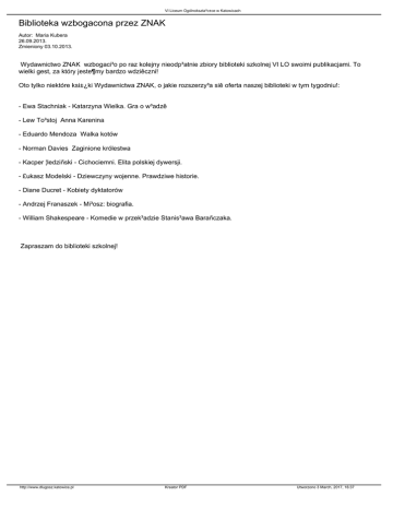 VI Liceum Ogólnokszta³c±ce w Katowicach Biblioteka wzbogacona przez ZNAK Autor: Maria Kubera 26.09.2013. Zmieniony 03.10.2013. Wydawnictwo ZNAK wzbogaci³o po raz kolejny nieodp³atnie zbiory biblioteki szkolnej VI LO swoimi publikacjami. To wielki gest, za który jeste¶my bardzo wdziêczni! Oto tylko niektóre ksi±¿ki Wydawnictwa ZNAK, o jakie rozszerzy³a siê oferta naszej biblioteki w tym tygodniu!: - Ewa Stachniak - Katarzyna Wielka. Gra o w³adzê - Lew To³stoj Anna Karenina - Eduardo Mendoza Walka kotów - Norman Davies Zaginione królestwa - Kacper ¦ledziñski - Cichociemni. Elita polskiej dywersji. - £ukasz Modelski - Dziewczyny wojenne. Prawdziwe historie. - Diane Ducret - Kobiety dyktatorów - Andrzej Franaszek - Mi³osz: biografia. - William Shakespeare - Komedie w przek³adzie Stanis³awa Barañczaka. Zapraszam do biblioteki szkolnej! http://www.dlugosz.katowice.pl Kreator PDF Utworzono 3 March, 2017, 16:37