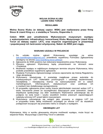 WOLNA SCENA KLUBU LIZARD KING TORUŃ REGULAMIN Wolna Scena Klubu (w dalszej części: WSK) jest realizowana przez firmę Sioux & Lizard King s.c. z siedzibą w Toruniu, Kopernika 3. Celem WSK jest umożliwienie Wykonawcom muzycznym występu z wykorzystaniem infrastruktury koncertowej Klubu Muzycznego Lizard King Toruń (w dalszej części: LKT), oraz wsparcie organizacyjne w prezentacji i popularyzacji ich twórczości artystycznej. Nabór do WSK jest ciągły. WARUNKI UDZIAŁU W PROJEKCIE 1. Do 2. 3. 4. 5. 6. 7. 8. udziału można zgłosić Wykonawcę, wysyłając na adres [email protected] prawidłowo wypełniony Formularz Zgłoszeniowy (dostępny na stronie www.lizardking-torun.pl/blog). Zgłoszenie do WSK powinno być dokonane bezpośrednio przez Wykonawcę. Wszyscy zgłoszeni Wykonawcy będą prezentowani na stronach www i Facebook. Możliwość występu w najbliższym dostępnym terminie otrzyma Wykonawca, który podeśle prawidłowo wypełnione zgłoszenie. Wysłanie Formularza Zgłoszeniowego oznacza zapoznanie się treścią Regulaminu i jego akceptację. Wykonawcy oświadczają, iż posiadają majątkowe prawa autorskie do przekazywanych LKT materiałów promocyjnych i udzielają bezterminowej, nieodpłatnej i niewyłącznej licencji na wykorzystywanie ich w celach marketingowych, informacyjnych, statystycznych oraz publikacji ich w mediach bez dodatkowego wynagrodzenia. W przypadku zgłoszenia przez osoby trzecie jakichkolwiek roszczeń wobec LKT z tytułu naruszenia prawa (w szczególności dotyczących praw autorskich, zasad współżycia społecznego czy dóbr osobistych) Wykonawca zobowiązuje się do podjęcia na swój koszt i ryzyko wszelkich kroków prawnych zapewniających należytą ochronę LKT przed takimi roszczeniami. Wykonawca zobowiązuje się wstąpić jako pozwany w miejsce LKT lub w przypadku braku takiej możliwości przystąpić po stronie LKT do wszelkich postępowań toczących się przeciwko niemu w związku z występem. OBOWIĄZKI LKT Wykonawca, który w wyniku głosowania otrzyma możliwość występu, może liczyć na wsparcie Klubu Muzycznego Lizard King Toruń w zakresie: Klub Muzyczny Lizard King | 87-100 Toruń, ulica Kopernika 3 (56) 621 0 234 www.lizardking-torun.pl e-mail: [email protected] telefon: 1. Udostępnienie infrastruktury Koncertowej LKT: • • scena oraz dostęp do garderoby nagłośnienie wraz z obsługą 2. Wsparcie Organizacyjne: • • • Koordynacja działań związanych z koncertem. Promocja dostępnymi kanałami Udostępnienie nagrania audio z występu w formie niezmiksowanego zapisu z konsolety pod warunkiem wcześniejszego uprzedzenia organizatora. OBOWIĄZKI WYKONAWCY 1. Wykonawca zobowiązuje się do punktualnego rozpoczęcia występu zachowania należytej staranności w trakcie jego realizacji. 2. Wykonawca wyznaczy 1 osobę do kontaktu z LKT (osoba wysyłająca Formularz Zgłoszeniowy), która zobowiązuje się do przekazywania wszystkich informacji od koordynatora LKT, pozostałym osobom mającym występować. 3. Wykonawca zobowiązuje się zapewnić obecność wszystkich występujących w dniu koncertu na próbie (od godziny 15:00) oraz zorganizować własny backline. 4. Wykonawca we współpracy z koordynatorem LKT będzie promował koncert dostępnymi kanałami takimi jak własna strona www, Facebook i inne. 5. W dniu koncertu Wykonawca będzie stosował się do wskazówek koordynatora LKT, mających na celu zapewnienie prawidłowego przebiegu i bezpieczeństwa koncertu oraz nie będzie przekazywał ze sceny treści naruszających prawo lub dobre obyczaje. 6. Wykonawcy korzystający z infrastruktury LKT (garderoby, sprzętu) odpowiadają za stan tej infrastruktury i w razie zniszczeń lub uszkodzeń zobowiązują się pokryć szkodę. 7. Wykonawca zobowiązuje się dostarczyć najpóźniej w dniu występu wydrukowaną listę wykonywanych utworów, składającą się z nazwy wykonawcy, tytułu utworu, autora muzyki i autora tekstu. 8. Wykonawca zobowiązuje się, że podczas występu nie będzie przekazywał treści komercyjnych, reklamowych bądź promocyjnych oraz treści naruszających prawo lub dobre obyczaje. POSTANOWIENIA KOŃCOWE 1. LKT zastrzega prawo do zmian w Regulaminie oraz jego ostatecznej interpretacji. 2. LKT zastrzega prawo do odrzucenia zgłoszeń zespołów, bez podania przyczyny. 3. LKT zastrzega prawo do przesunięcia terminu występu lub jego odwołania z uwagi na wystąpienie wcześniej nieprzewidzianych okoliczności oraz przerwania występu w przypadku naruszenia przez Wykonawcę postanowień Regulaminu. 4. Kontakt z Koordynatorem WSK odbywa się przez tel. 668 963 904 oraz e-mail: [email protected] Klub Muzyczny Lizard King | 87-100 Toruń, ulica Kopernika 3 (56) 621 0 234 www.lizardking-torun.pl e-mail: [email protected] telefon: