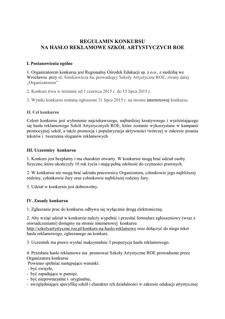 REGULAMIN KONKURSU NA HASŁO REKLAMOWE SZKÓŁ ARTYSTYCZYCH ROE I. Postanowienia ogólne 1. Organizatorem konkursu jest Regionalny Ośrodek Edukacji sp. z o.o., z siedzibą we Wrocławiu przy ul. Sienkiewicza 8a, prowadzący Szkoły Artystyczne ROE, zwany dalej „Organizatorem”. 2. Konkurs trwa w terminie od 1 czerwca 2015 r. do 15 lipca 2015 r. 3. Wyniki konkursu zostaną ogłoszone 31 lipca 2015 r. na stronie internetowej konkursu. II. Cel konkursu Celem konkursu jest wyłonienie najciekawszego, najbardziej kreatywnego i wyróżniającego się hasła reklamowego Szkół Artystycznych ROE, które zostanie wykorzystane w kampanii promocyjnej szkół, a także promocja i popularyzacja aktywności twórczej w zakresie pisania tekstów i tworzenia sloganów reklamowych III. Uczestnicy konkursu 1. Konkurs jest bezpłatny i ma charakter otwarty. W konkursie mogą brać udział osoby fizyczne, które ukończyły 18 rok życia i mają pełną zdolność do czynności prawnych. 2. W konkursie nie mogą brać udziału pracownicy Organizatora, członkowie jego najbliższej rodziny, członkowie Jury oraz członkowie najbliższej rodziny Jury. 3. Udział w konkursie jest dobrowolny. IV. Zasady konkursu 1. Zgłaszanie prac do konkursu odbywa się wyłącznie drogą elektroniczną. 2. Aby wziąć udział w konkursie należy wypełnić i przesłać formularz zgłoszeniowy (wraz z oświadczeniami) dostępny na stronie internetowej konkursu http://szkolyartystyczne.roe.pl/konkurs-na-haslo-reklamowe oraz dołączyć do niego tekst hasła reklamowego, zgłaszanego na konkurs. 3. Uczestnik ma prawo wysłać maksymalnie 3 propozycje hasła reklamowego. 4. Przesłane hasło reklamowe ma promować Szkoły Artystyczne ROE prowadzone przez Organizatora konkursu Powinno spełniać następujące warunki: - być zwięzłe, - być zapadające w pamięć, - być niepowtarzalne i oryginalne, - uwzględniające specyfikę szkół i charakter ich działalności w zakresie edukacji artystycznej - nawiązujące m.in. do takich skojarzeń jak: profesjonalny, nowoczesny, artystyczny, kreatywny, twórczy, wyjątkowy. 5. Uczestnik konkursu, któremu zostanie przyznana nagroda , zobowiązany jest do przesłania wypełnionego i podpisanego formularza zgłoszeniowego (wraz z oświadczeniami) pocztą tradycyjną na adres: ul. Sienkiewicza 8a , 50-335 Wrocław z dopiskiem ” konkurs hasło reklamowe”, w ciągu 7 dni od ogłoszenia wyników konkursu. Formularz zgłoszeniowy w wersji edytowalnej można pobrać na stronie konkursowej od dnia 1 czerwca 2015 r. Zwycięzca konkursu zobowiązany jest dodatkowo do podpisania z Organizatorem umowy przeniesienia autorskich praw majątkowych do hasła reklamowego Szkół Artystycznych ROE. Niedopełnienie powyższych formalności przez zwycięzcę konkursu i uczestnika, któremu zostanie przyznana nagroda skutkuje utratą przez niego prawa do odbioru nagrody oraz upoważnia Organizatora to przekazania nagrody innemu uczestnikowi konkursu. 6. Uczestnictwo w konkursie warunkowane jest złożeniem oświadczeń o treści zamieszczonej w formularzu zgłoszeniowym. 7. Wszelkie koszty związane z przygotowaniem oraz dostarczeniem prac konkursowych ponoszą uczestnicy konkursu. 8. Organizator konkursu ma prawo wyłączyć z udziału w konkursie teksty, które nie spełniają warunków Regulaminu lub naruszają przepisy prawa. V. Prawa autorskie 1. Uczestnik konkursu oświadcza że: a) przysługują mu autorskie prawa osobiste i nieograniczone prawa majątkowe do tekstu zgłaszanego w konkursie, b) przyjmuje na siebie odpowiedzialność za wszelkie roszczenia osób trzecich związane z naruszeniem ich praw autorskich. 2. Uczestnik konkursu udziela Organizatorowi nieodpłatnej licencji niewyłącznej, uprawniającej Organizatora do korzystania przez czas nieoznaczony, oraz bez ograniczeń terytorialnych z przesłanych tekstów na wszystkich polach eksploatacji do działań promujących konkurs. 3. Uczestnik udziela Organizatorowi zgody na publikację tekstów na stronach internetowych, portalach społecznościowych oraz materiałach drukowanych Organizatora w ramach działań promujących konkurs. 4. Zwycięzca konkursu przenosi na Organizatora konkursu majątkowe prawa autorskie do korzystania i rozporządzania zwycięskim hasłem reklamowym na wszystkich polach eksploatacji wskazanych w ustawie z dnia 4 lutego 1994 r. o prawie autorskim i prawach pokrewnych. Organizator będzie uprawniony do dalszego rozporządzania autorskimi prawami majątkowymi. W związku przeniesieniem autorskich praw majątkowych do zwycięskiego hasła reklamowego – zwycięzcy konkursu , poza uprawnieniem do uzyskania nagród określonych w Regulaminie, nie przysługują żadne inne roszczenia do Organizatora oraz do osób trzecich, które te prawa nabyły. VI. Rozstrzygnięcie konkursu i nagrody 1. Jury konkursowe powoływane jest przez organizatora i liczy 4 osoby. 3. Nagrody zostaną przyznane autorom tekstów najbardziej kreatywnych, najlepiej oddających charakter działalności Szkół Artystycznych ROE, wyróżniających się oryginalnym pomysłem. 4. Decyzje Jury są niepodważalne. 5. W konkursie zostaną przyznane następujące nagrody: a) I miejsce: - bezpłatna nauka w Szkołach Artystycznych ROE, na dowolnym kierunku, który zostanie uruchomiony w roku szkolnym 2015/2016. Zwycięzca konkursu może wybrać miasto, w którym podejmie naukę ( do wyboru: Wrocław, Poznań, Warszawa, Katowice). - książka: „Magia słów. Jak pisać teksty, które porwą tłumy”, autor: Joanna WryczaBekier - zestaw gadżetów reklamowych Szkół Artystycznych ROE b) II miejsce: - 50 % rabatu na naukę w Szkołach Artystycznych ROE , na dowolnym kierunku , który zostanie uruchomiony w roku szkolnym 2015/2016. Zwycięzca konkursu może wybrać miasto, w którym podejmie naukę (do wyboru: Wrocław, Poznań, Warszawa). - książka : „Copywriting. Jak sprzedawać słowem” autorzy: Dorota Jędrzejewska i Rafał Niemczyk, 