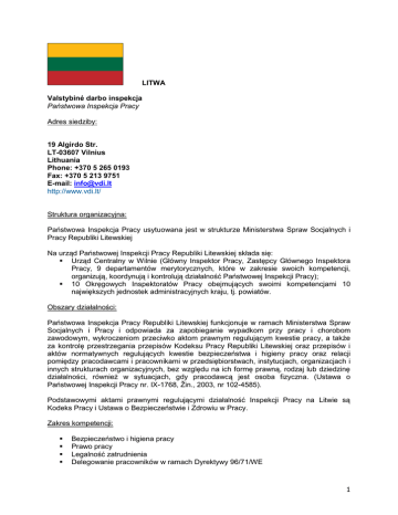 LITWA Valstybinė darbo inspekcja Państwowa Inspekcja Pracy Adres siedziby: 19 Algirdo Str. LT-03607 Vilnius Lithuania Phone: +370 5 265 0193 Fax: +370 5 213 9751 E-mail: [email protected] http://www.vdi.lt/ Struktura organizacyjna: Państwowa Inspekcja Pracy usytuowana jest w strukturze Ministerstwa Spraw Socjalnych i Pracy Republiki Litewskiej Na urząd Państwowej Inspekcji Pracy Republiki Litewskiej składa się: Urząd Centralny w Wilnie (Główny Inspektor Pracy, Zastępcy Głównego Inspektora Pracy, 9 departamentów merytorycznych, które w zakresie swoich kompetencji, organizują, koordynują i kontrolują działalność Państwowej Inspekcji Pracy); 10 Okręgowych Inspektoratów Pracy obejmujących swoimi kompetencjami 10 największych jednostek administracyjnych kraju, tj. powiatów. Obszary działalności: Państwowa Inspekcja Pracy Republiki Litewskiej funkcjonuje w ramach Ministerstwa Spraw Socjalnych i Pracy i odpowiada za zapobieganie wypadkom przy pracy i chorobom zawodowym, wykroczeniom przeciwko aktom prawnym regulującym kwestie pracy, a także za kontrolę przestrzegania przepisów Kodeksu Pracy Republiki Litewskiej oraz przepisów i aktów normatywnych regulujących kwestie bezpieczeństwa i higieny pracy oraz relacji pomiędzy pracodawcami i pracownikami w przedsiębiorstwach, instytucjach, organizacjach i innych strukturach organizacyjnych, bez względu na ich formę prawną, rodzaj lub dziedzinę działalności, również w sytuacjach, gdy pracodawcą jest osoba fizyczna. (Ustawa o Państwowej Inspekcji Pracy nr. IX-1768, Žin., 2003, nr 102-4585). Podstawowymi aktami prawnymi regulującymi działalność Inspekcji Pracy na Litwie są Kodeks Pracy i Ustawa o Bezpieczeństwie i Zdrowiu w Pracy. Zakres kompetencji: Bezpieczeństwo i higiena pracy Prawo pracy Legalność zatrudnienia Delegowanie pracowników w ramach Dyrektywy 96/71/WE 1 Krajowy punkt kontaktowy Europejskiej Agencji Bezpieczeństwa i Zdrowia w Pracy z siedzibą w Bilbao Porozumienie: Protokół o współpracy pomiędzy Państwową Inspekcja Pracy w Polsce i Państwową Inspekcją Pracy Republiki Litewskiej zawarte 25 maja 2005 r. W dniu 13 listopada 1012 oba urzędy podpisały Aneks rozszerzający dotychczasową współpracę o zagadnienia związane z legalnością zatrudnienia. Współpraca dwustronna: Współpraca z litewską inspekcją pracy realizowana jest na podstawie porozumienia bilateralnego poprzez udział w konferencjach i seminariach, wizyty studyjne i spotkania robocze oraz wymianę inspektorów na szczeblu centralnym (Główny Inspektorat Pracy) i na szczeblu okręgowych inspektoratów pracy Polski (Olsztyn, Gdańsk i Białystok) i Litwy (Mariampol, Wilno, Kłajpeda). 2