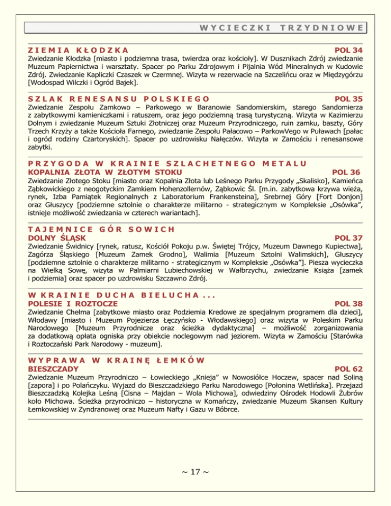 WYCIECZKI TRZYDNIOWE ZIEMIA KŁODZKA POL 34 SZLAK RENESANSU POLSKIEGO POL 35 Zwiedzanie Kłodzka [miasto i podziemna trasa, twierdza oraz kościoły]. W Dusznikach Zdrój zwiedzanie Muzeum Papiernictwa i warsztaty. Spacer po Parku Zdrojowym i Pijalnia Wód Mineralnych w Kudowie Zdrój. Zwiedzanie Kapliczki Czaszek w Czermnej. Wizyta w rezerwacie na Szczelińcu oraz w Międzygórzu [Wodospad Wilczki i Ogród Bajek]. Zwiedzanie Zespołu Zamkowo – Parkowego w Baranowie Sandomierskim, starego Sandomierza z zabytkowymi kamieniczkami i ratuszem, oraz jego podziemną trasą turystyczną. Wizyta w Kazimierzu Dolnym i zwiedzanie Muzeum Sztuki Złotniczej oraz Muzeum Przyrodniczego, ruin zamku, baszty, Góry Trzech Krzyży a także Kościoła Farnego, zwiedzanie Zespołu Pałacowo – ParkowVego w Puławach [pałac i ogród rodziny Czartoryskich]. Spacer po uzdrowisku Nałęczów. Wizyta w Zamościu i renesansowe zabytki. PRZYGODA W KRAINIE SZLACHETNEGO METALU KOPALNIA ZŁOTA W ZŁOTYM STOKU POL 36 Zwiedzanie Złotego Stoku [miasto oraz Kopalnia Złota lub Leśnego Parku Przygody „Skalisko], Kamieńca Ząbkowickiego z neogotyckim Zamkiem Hohenzollernów, Ząbkowic Śl. [m.in. zabytkowa krzywa wieża, rynek, Izba Pamiątek Regionalnych z Laboratorium Frankensteina], Srebrnej Góry [Fort Donjon] oraz Głuszycy [podziemne sztolnie o charakterze militarno - strategicznym w Kompleksie „Osówka”, istnieje możliwość zwiedzania w czterech wariantach]. TAJEMNICE GÓR SOWICH DOLNY ŚLĄSK POL 37 W KRAINIE DUCHA BIELUCHA ... POLESIE I ROZTOCZE POL 38 Zwiedzanie Świdnicy [rynek, ratusz, Kościół Pokoju p.w. Świętej Trójcy, Muzeum Dawnego Kupiectwa], Zagórza Śląskiego [Muzeum Zamek Grodno], Walimia [Muzeum Sztolni Walimskich], Głuszycy [podziemne sztolnie o charakterze militarno - strategicznym w Kompleksie „Osówka”]. Piesza wycieczka na Wielką Sowę, wizyta w Palmiarni Lubiechowskiej w Wałbrzychu, zwiedzanie Książa [zamek i podziemia] oraz spacer po uzdrowisku Szczawno Zdrój. Zwiedzanie Chełma [zabytkowe miasto oraz Podziemia Kredowe ze specjalnym programem dla dzieci], Włodawy [miasto i Muzeum Pojezierza Łęczyńsko - Włodawskiego] oraz wizyta w Poleskim Parku Narodowego [Muzeum Przyrodnicze oraz ścieżka dydaktyczna] – możliwość zorganizowania za dodatkową opłata ogniska przy obiekcie noclegowym nad jeziorem. Wizyta w Zamościu [Starówka i Roztoczański Park Narodowy - muzeum]. WYPRAWA W KRAINĘ ŁEMKÓW BIESZCZADY POL 62 Zwiedzanie Muzeum Przyrodniczo – Łowieckiego „Knieja” w Nowosiółce Hoczew, spacer nad Soliną [zapora] i po Polańczyku. Wyjazd do Bieszczadzkiego Parku Narodowego [Połonina Wetlińska]. Przejazd Bieszczadzką Kolejka Leśną [Cisna – Majdan – Wola Michowa], odwiedziny Ośrodek Hodowli Żubrów koło Michowa. Ścieżka przyrodniczo – historyczna w Komańczy, zwiedzanie Muzeum Skansen Kultury Łemkowskiej w Zyndranowej oraz Muzeum Nafty i Gazu w Bóbrce. ~ 17 ~ WYCIECZKI TRZYDNIOWE PRZEMYŚL I OKOLICE POL 65 WROCŁAW POL 88 Zwiedzanie Starego Miasta i zabytków Przemyśla [rynek, kamieniczki, zamek, katedra łacińska, katedra greckokatolicka]. Przejazd do pobliskich Bolestraszyc [arboretum, fort z czasów I Wojny Światowej]. Zwiedzanie Kalwarii Pacławskiej [klasztor oo.Franciszkanów, Posada Rybotycka – cerkiew], Krasiczyna z parkiem i zamkiem oraz barokowy kościół parafialny. Zwiedzanie muzeum i podziemnej trasy turystycznej w Jarosławiu. Zwiedzanie kompleksu pałacowo-hotelowego w Sieniawie. Wizyta w Leżajsku połączona ze zwiedzaniem miasta oraz słynnych organów. W Tarnowskich Górach wyprawa do Zabytkowej Kopalni Srebra [Muzeum Górnictwa i Skansen Maszyn Parowych oraz za dodatkową opłatą zorganizowanie spotkania ze Skarbnikiem i pokaz pracy gwarków] w Sztolni Czarnego Pstrąga [podziemny rejs łodziami]. Zwiedzanie Wrocławia [stare miasto z rynkiem, ratuszem, Kościół św. Elżbiety oraz barokowy gmach Uniwersytetu Wrocławskiego ze słynną aulą Leopoldina]. Widok na Panoramę Racławicką oraz zwiedzanie Muzeum Narodowego, ZOO i Ogrodu Japońskiego. Wizyta na Górze św. Anny – Amfiteatr i Pomnik Czynu Powstańczego. WIZYTA W WARSZAWIE I TWIERDZY MODLIN POL 90 Pobyt w Twierdzy Modlin - ,,dla każdego coś miłego” –[zajęcia do wyboru min. program edukacyjnohistoryczny, program edukacyjny - nauka poprzez zabawę, program przygodowy – survival]. Zwiedzanie Zamku Królewskiego, wizyta w sejmie i senacie, zwiedzanie Muzeum Powstania Warszawskiego, spacer po Starówce. Wizyta w Muzeum Sportu i Turystyki, w Łazienkach Królewskich [do wyboru min. Pałac na Wodzie, Pałac Myśliwiecki,] oraz pałac w Wilanowie [park i ogród]. Możliwość wzbogacenia programu lub zamiany, za dodatkową opłata, o następujące elementy : Pałac Kultury i Nauki - Muzeum Techniki, wizyta w ZOO, Rejs gondolą po Łazienkach, Muzeum Teatru Wielkiego, Fort Legionów, przejazd metrem oraz Międzynarodowy Port Lotniczy im. Fryderyka Chopina. ~ 18 ~