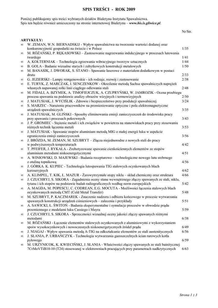 spis treści - rok 2009 - Biuletyn Instytutu Spawalnictwa