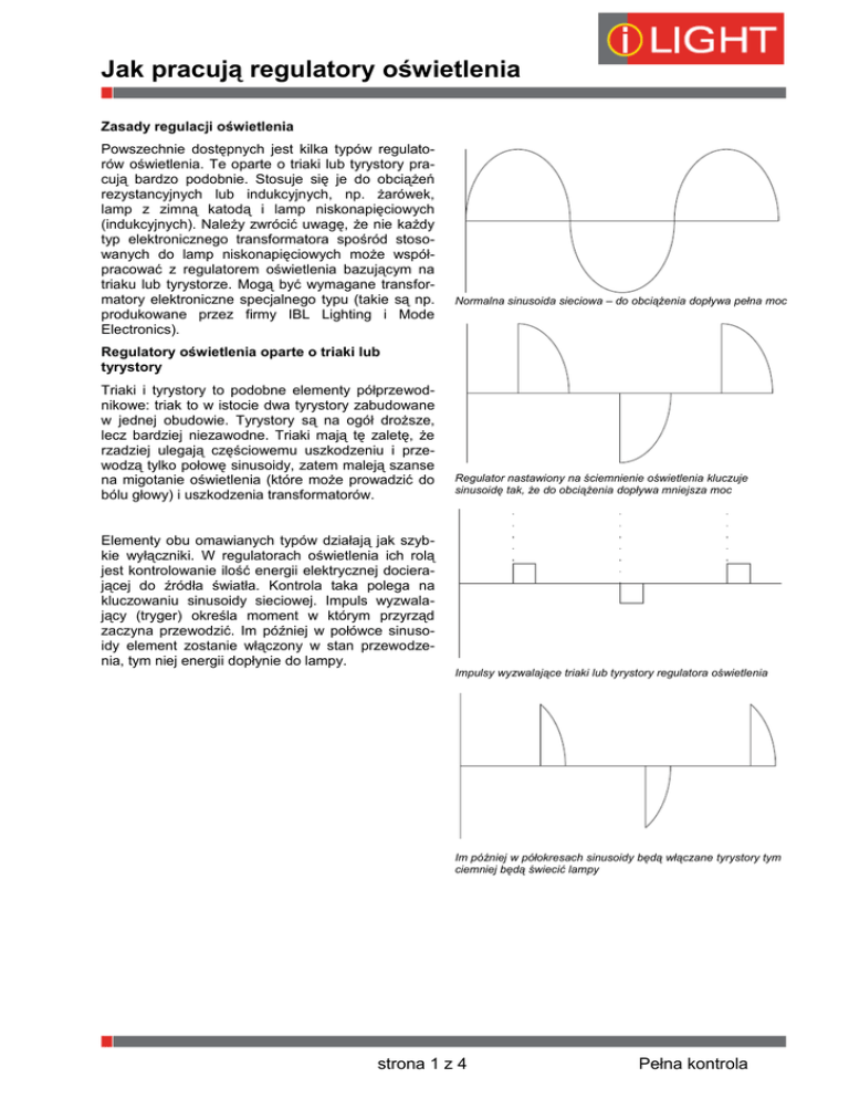 Jak pracują regulatory oświetlenia Zasady regulacji oświetlenia Powszechnie dostępnych jest kilka typów regulatorów oświetlenia. Te oparte o triaki lub tyrystory pracują bardzo podobnie. Stosuje się je do obciążeń rezystancyjnych lub indukcyjnych, np. żarówek, lamp z zimną katodą i lamp niskonapięciowych (indukcyjnych). Należy zwrócić uwagę, że nie każdy typ elektronicznego transformatora spośród stosowanych do lamp niskonapięciowych może współpracować z regulatorem oświetlenia bazującym na triaku lub tyrystorze. Mogą być wymagane transformatory elektroniczne specjalnego typu (takie są np. produkowane przez firmy IBL Lighting i Mode Electronics). Normalna sinusoida sieciowa – do obciążenia dopływa pełna moc Regulatory oświetlenia oparte o triaki lub tyrystory Triaki i tyrystory to podobne elementy półprzewodnikowe: triak to w istocie dwa tyrystory zabudowane w jednej obudowie. Tyrystory są na ogół droższe, lecz bardziej niezawodne. Triaki mają tę zaletę, że rzadziej ulegają częściowemu uszkodzeniu i przewodzą tylko połowę sinusoidy, zatem maleją szanse na migotanie oświetlenia (które może prowadzić do bólu głowy) i uszkodzenia transformatorów. Elementy obu omawianych typów działają jak szybkie wyłączniki. W regulatorach oświetlenia ich rolą jest kontrolowanie ilość energii elektrycznej docierającej do źródła światła. Kontrola taka polega na kluczowaniu sinusoidy sieciowej. Impuls wyzwalający (tryger) określa moment w którym przyrząd zaczyna przewodzić. Im później w połówce sinusoidy element zostanie włączony w stan przewodzenia, tym niej energii dopłynie do lampy. Regulator nastawiony na ściemnienie oświetlenia kluczuje sinusoidę tak, że do obciążenia dopływa mniejsza moc Impulsy wyzwalające triaki lub tyrystory regulatora oświetlenia Im później w półokresach sinusoidy będą włączane tyrystory tym ciemniej będą świecić lampy strona 1 z 4 Pełna kontrola Jak pracują regulatory oświetlenia Obciążenia indukcyjne Transformatory elektroniczne Wyżej pokazane przykładowe przebiegi odpowiadają realnej sytuacji gdy obciążeniem są żarówki. W instalacjach z żarówkami na napięcie sieciowe tj. w przypadku obciążeń czysto rezystancyjnych, przebiegi napięć praktycznie pokrywają się z przebiegami prądów. Jednak w instalacjach oświetleniowych niskonapięciowych występują transformatory, które powodują, że obciążenie jest bardziej złożone. Nawijane drutem transformatory stanowią obciążenie indukcyjne, które powoduje, że prąd opóźnia się w stosunku do napięcia. Jak wiadomo, od momentu wyzwolenia triaka lub tyrystora jego przewodzenie zależy od płynącego przez niego prądu: gdy spadnie on poniżej wartości progowej, przyrząd przestaje przewodzić. Skoro przy obciążeniu indukcyjnym prąd opóźnia się w stosunku do napięcia, to istnieje możliwość, że przed końcem impulsu wyzwalającego prąd przepływający przez triak nie wzrośnie powyżej progu koniecznego do podtrzymania przewodzenia i triak „zgaśnie” natychmiast po ustaniu impulsu wyzwalającego. Wynikająca z takiego zachowania charakterystyka regulacji oświetlenia byłaby nie do przyjęcia. Aby tego uniknąć, w regulatorach oświetlenia przeznaczonych do współpracy z transformatorami nawiniętymi drutem stosuje się technikę tzw. hard firing. Poprzez podtrzymywanie impulsu wyzwalającego aż prąd płynący przez przyrząd kluczujący przekroczy próg podtrzymywania przewodzenia technika ta gwarantuje prawidłową charakterystykę regulacji. Niepodobne do transformatorów nawijanych, które z samej swej natury mogą współpracować z regulatorami oświetlenia, transformatory elektroniczne mogą stwarzać problemy i przy ich doborze należy wybierać tylko typy zgodne z regulatorami. prąd Prawie wszystkie regulatory oświetlenia stosowane np. w W.Brytanii są oparte na triakach lub parach tyrystorów, którymi kluczuje się sinusoidę sieciową dla kontroli mocy podawanej na lampy, a zatem jasności z jaką lampy te świecą. Typowy przebieg napięcia na wyjściu tyrystorowego regulatora oświetlenia sterującego obciążeniem rezystancyjnym Regulatory oświetlenia wykorzystujące triaki załączają napięcie i są powszechnie znane jako regulatory typu leading edge. Natura obciążenia wnoszonego przez standardowe transformatory elektroniczne jest pojemnościowa. Przy współpracy regulatora leading edge z takimi pojemnościowymi obciążeniami mogą pojawić się przerzuty napięcia czyli napięcia między-szczytowe większe niż nominalne. Przebiegi napięcia i prądu w przypadku obciążenia indukcyjnego (prąd opóźnia się w stosunku do napięcia) W przebiegach na wyjściach tyrystorowych regulatorów oświetlenia współpracujących z elektronicznymi transformatorami nie projektowanymi specjalnie do takiej współpracy mogą pojawić się przerzuty napięcia Prąd nie osiąga progu podtrzymywania tyrystora W technice hard firing Impuls wyzwalający jest podtrzymywany tak długo aż prąd narośnie powyżej progu podtrzymywania Transformatory przeznaczone do współpracy z tyrystorowymi regulatorami oświetlenia powinny być zaprojektowane tak, aby przerzuty napięcia były wyeliminowane. Jeśli tak nie jest, po ściemnieniu oświetlenia transformator może emitować słyszalne buczenie. Jest to symptom wewnętrznych stresów, które szybko mogą doprowadzić do uszkodzenia transformatora. Problem jest tym istotniejszy im więcej opraw oświetleniowych jest zasilanych z danego transformatora. strona 2 z 4 Pełna kontrola Jak pracują regulatory oświetlenia Tranzystorowe regulatory oświetlenia Pewna liczba producentów produkuje tranzystorowe regulatory oświetlenia działające inaczej niż regulatory tyrystorowe. Takie regulatory nie muszą być specjalnie projektowane aby były zgodne z transformatorami elektronicznymi (obciążeniami pojemnościowymi). Tranzys