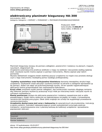 I-NET.PL Sp.J. o. GeoSklep Olsztyn, ul. Cementowa 3/301 Zapraszamy do sklepu www.sklep.geoezja.pl tel. +48 609 571 271, 89 670 11 00, 58 7 421 571 faks 89 670 11 11, 58 7421 871 e-mail [email protected] bezpłatna infolinia 800 70 30 31 elektroniczny planimetr biegunowy HA-300 kod produktu: 4835 kategoria: Kategorie > OSPRZĘT > POMIAROWY > PRZYMIARY/POZIOMNICE/KĄTOMIERZE Producent: HAFF Cena brutto: 4 268,00 zł Cena netto: 3 469,92 zł Kod QR: Planimetr biegunowy służący do pomiaru odległości, powierzchni i kubatury na planach, mapach, rysunkach, diagramach itp. Urządzenie automatycznie przelicza wielkości z mapy na wielkości rzeczywiste według żądanej skali. Uzyskane wyniki można zapisać w pamięci instrumentu. Można zapisać pięć takich pomiarów. Wysoka dokładność osiągana dzięki stabilnej pozycji urządzenia na mapie oraz prostota obsługi czyni z tego instrumentu niezbędną pomoc każdego profesjonalisty. Czytelny wyświetlacz oraz funkcjonalna klawiatura stanowią niewątpliwy atrybut tego urządzenia. Użytkownik może odczytać uzyskaną wartość na ekranie a następnie wprowadzić ją do pamięci, dodać lub odjąć od przechowywanego wyniku. W ten sposób najpotrzebniejsze obliczenia można przeprowadzać bez zastosowania kalkulatora. Krzyż nitek umożliwia szybki pomiar odległości, bez konieczności montażu długiego ramienia. Aby dokonać pomiaru wystarczy przesunąć krzyż nitek po mierzonej trasie i odczytać wynik na cyfrowym wyświetlaczu. Ramię pomiarowe służące do obliczania powierzchni i kubatury zaopatrzone jest w szkło powiększające. Dzięki niemu widoczne są najdrobniejsze szczegóły na mapie, a prowadzenie ramienia jest bardziej precyzyjne. Obok szkła znajduje sie uchwyt do wygodnego prowadzenia ramienia planimetru. Urządzenie dostarczane jest wraz z ładowarką do wewnętrznych akumulatorków, instrukcją w języku polskim, futerałem zabezpieczającym przed uszkodzeniem przyrządu podczas transportu i przechowywania oraz z planszą testową do kalibracji urządzenia i sprawdzania poprawności obliczeń. Dane techniczne elektronicznego planimetru biegunowego HA-300 Parametr Pomiar powierzchni Pomiar kubatury Planimetr HA-300 TAK TAK strona: 1/2 wydrukowano: 03-03-2017 http://www.sklep.geodezja.pl/elektroniczny-planimetr-biegunowy-ha-300.html Pomiar odległości 2 Dokładność (na powierzchni 100cm ) Dokładność wyświetlania Wybór skali Dostępne jednostki metryczne Dostępne jednostki niemetryczne Różne skale x/y Elektroniczne ustawienie zera Średnia pomiarów Pamięć wyników Dodawanie, odejmowanie wyników Elektroniczna kalibracja Zatrzymanie wyniku na wyświetlaczu Obszar pomiaru Wyświetlacz LCD Automatyczny wyłącznik Gniazdo do połączenia z komputerem Zasilanie Czas pracy na akumulatorku Wymiary futerału [cm] Masa TAK ± 0,1% powierzchnia 0,05cm2 odległość 0,1cm od 1000:1 do 1:9.999.900 mm / cm / m / ha / km inch / feet / acres / miles TAK TAK TAK TAK TAK TAK TAK ø 32,5cm 70x10cm 8 + 2 cyfry / 20 symboli TAK TAK akumulatorek 50 godzin nieprzerwanej pracy 30x15x6 1,25kg strona: 2/2 wydrukowano: 03-03-2017 http://www.sklep.geodezja.pl/elektroniczny-planimetr-biegunowy-ha-300.html