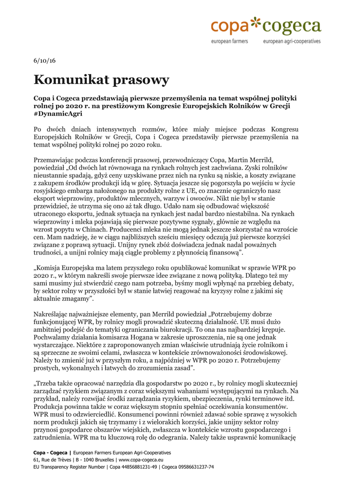 6/10/16 Komunikat prasowy Copa i Cogeca przedstawiają pierwsze przemyślenia na temat wspólnej polityki rolnej po 2020 r. na prestiżowym Kongresie Europejskich Rolników w Grecji #DynamicAgri Po dwóch dniach intensywnych rozmów, które miały miejsce podczas Kongresu Europejskich Rolników w Grecji, Copa i Cogeca przedstawiły pierwsze przemyślenia na temat wspólnej polityki rolnej po 2020 roku. Przemawiając podczas konferencji prasowej, przewodniczący Copa, Martin Merrild, powiedział „Od dwóch lat równowaga na rynkach rolnych jest zachwiana. Zyski rolników nieustannie spadają, gdyż ceny uzyskiwane przez nich na rynku są niskie, a koszty związane z zakupem środków produkcji idą w górę. Sytuacja jeszcze się pogorszyła po wejściu w życie rosyjskiego embarga nałożonego na produkty rolne z UE, co znacznie ograniczyło nasz eksport wieprzowiny, produktów mlecznych, warzyw i owoców. Nikt nie był w stanie przewidzieć, że utrzyma się ono aż tak długo. Udało nam się odbudować większość utraconego eksportu, jednak sytuacja na rynkach jest nadal bardzo niestabilna. Na rynkach wieprzowiny i mleka pojawiają się pierwsze pozytywne sygnały, głównie ze względu na wzrost popytu w Chinach. Producenci mleka nie mogą jednak jeszcze skorzystać na wzroście cen. Mam nadzieję, że w ciągu najbliższych sześciu miesięcy odczują już pierwsze korzyści związane z poprawą sytuacji. Unijny rynek zbóż doświadcza jednak nadal poważnych trudności, a unijni rolnicy mają ciągle problemy z płynnością finansową”. „Komisja Europejska ma latem przyszłego roku opublikować komunikat w sprawie WPR po 2020 r., w którym nakreśli swoje pierwsze idee związane z nową polityką. Dlatego też my sami musimy już stwierdzić czego nam potrzeba, byśmy mogli wpłynąć na przebieg debaty, by sektor rolny w przyszłości był w stanie łatwiej reagować na kryzysy rolne z jakimi się aktualnie zmagamy”. Nakreślając najważniejsze elementy, pan Merrild powiedział „Potrzebujemy dobrze funkcjonującej WPR, by rolnicy mogli prowadzić skuteczną działalność. UE musi dużo ambitniej podejść do tematyki ograniczania biurokracji. To ona nas najbardziej krępuje. Pochwalamy działania komisarza Hogana w zakresie uproszczenia, nie są one jednak wystarczające. Niektóre z zaproponowanych zmian właściwie utrudniają życie rolnikom i są sprzeczne ze swoimi celami, zwłaszcza w kontekście zrównoważoności środowiskowej. Należy to zmienić już w przyszłym roku, a najpóźniej w WPR po 2020 r. Potrzebujemy prostych, wykonalnych i łatwych do zrozumienia zasad”. „Trzeba także opracować narzędzia dla gospodarstw po 2020 r., by rolnicy mogli skuteczniej zarządzać ryzykiem związanym z coraz większymi wahaniami występującymi na rynkach. Na przykład, należy rozwijać środki zarządzania ryzykiem, ubezpieczenia, rynki terminowe itd. Produkcja powinna także w coraz większym stopniu spełniać oczekiwania konsumentów. WPR musi to odzwierciedlić. Konsumenci powinni również zdawać sobie sprawę z wysokich norm produkcji jakich się trzymamy i z wielorakich korzyści, jakie unijny sektor rolny przynosi gospodarce obszarów wiejskich, zwłaszcza w kontekście wzrostu gospodarczego i zatrudnienia. WPR ma tu kluczową rolę do odegrania. Należy także usprawnić komunikację Copa - Cogeca | European Farmers European Agri-Cooperatives 61, Rue de Trèves | B - 1040 Bruxelles | www.copa-cogeca.eu EU Transparency Register Number | Copa 44856881231-49 | Cogeca 09586631237-74 w tym temacie” - podkreślił. „Bycie rolnikiem nie ogranicza się jednak tylko do zdobywania rynków. Jest związane z możliwością prowadzenia wysokiej jakości życia na obszarach wiejskich, dzięki dostępowi do szkolnictwa, ośrodków zdrowia i zatrudnienia dla członków naszych rodzin. Tak jak wszyscy potrzebujemy dobrej infrastruktury i łączy szerokopasmowych, byśmy mogli rozwijać nasze przedsiębiorstwa i korzystać z technologii inteligentnego i precyzyjnego rolnictwa. Podczas warsztatów, mówcy podkreślili, że inteligentne i precyzyjne rolnictwo pozwala na zwiększenie produkcji przy ograniczeniu zużycia zasobów, dzięki czemu mogą również zaoszczędzić na środkach produkcji. Niestety jedynie 25% rolników stosuje techniki rolnictwa precyzyjnego. Należy rozprzestrzeniać te rozwiązania. Potrzebujemy wsparcia ze strony UE i szkoleń, a także infrastruktury łączy szerokopasmowych, by uwolnić potencjał jaki drzemie w rolnictwie cyfrowym. Potrzeba nam także badań nad innowacyjnymi narzędziami, które rolnicy będą mogli zastosować w praktyce. Co więcej, lepszy dostęp do rynków i wydajna gospodarka dostępnymi zasobami naturalnymi pozwolą nam stawić czoła jednemu z największych wyzwań kolejnej dekady, a mianowicie konieczności zwiększenia produkcji, by wyżywić rosnącą liczbę ludności na świecie. Co ważniejsze, działania te pozwalają nam na podjęcie walki ze zmianami klimatu, które zagrażają produkcji żywności” - dodał. „Czy możemy jednak tak zmienić WPR, by produkcja rolna wzrosła i stała się wydajniejsza pod względem klimatycznym? Nie ma sensu ograniczać wydajnej produkcji w UE, gdyż zostanie ona tylko przeniesiona gdzie indziej. Wspólnie z instytucjami UE musimy sprawić, by porozumienie paryskie było dla nas korzystne. Jestem przekonany, że uda nam się do tego doprowadzić. Jednak by było to możliwe, potrzebujemy stabilnej WPR podpartej odpowiednim budżetem po 2020 r., by nasi producenci wraz ze spółdzielniami mogli planować przyszłą produkcję i cieszyć się rentownością” - powiedział. Przewodniczący Cogeca, Thomas Magnusson również podkreślił pozytywny wpływ, jaki spółdzielnie rolnicze mają na sytuację swoich członków. „W wielu przypadkach spółdzielnie zapewniają swoim członkom stabilizację. Umożliwiają uzyskanie wyższych zysków ze sprzedaży produktó
