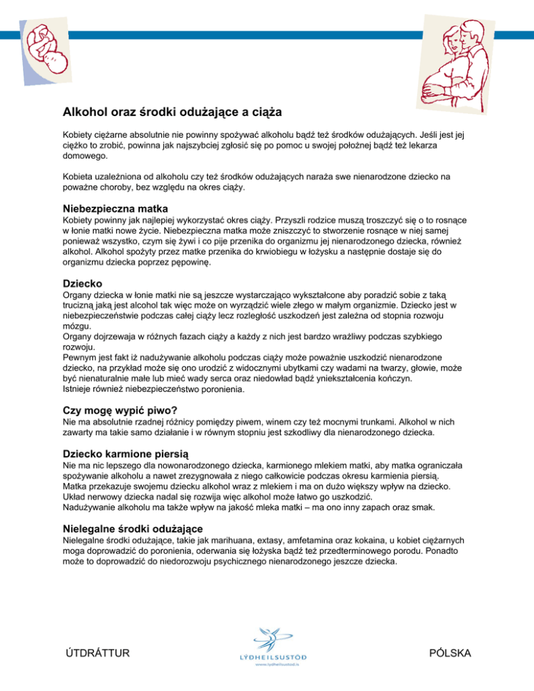 Alkohol oraz środki odużające a ciąża Kobiety ciężarne absolutnie nie powinny spożywać alkoholu bądź też środków odużających. Jeśli jest jej ciężko to zrobić, powinna jak najszybciej zgłosić się po pomoc u swojej położnej bądź też lekarza domowego. Kobieta uzależniona od alkoholu czy też środków odużających naraża swe nienarodzone dziecko na poważne choroby, bez względu na okres ciąży. Niebezpieczna matka Kobiety powinny jak najlepiej wykorzystać okres ciąży. Przyszli rodzice muszą troszczyć się o to rosnące w łonie matki nowe życie. Niebezpieczna matka może zniszczyć to stworzenie rosnące w niej samej ponieważ wszystko, czym się żywi i co pije przenika do organizmu jej nienarodzonego dziecka, również alkohol. Alkohol spożyty przez matke przenika do krwiobiegu w łożysku a następnie dostaje się do organizmu dziecka poprzez pępowinę. Dziecko Organy dziecka w łonie matki nie są jeszcze wystarczająco wykształcone aby poradzić sobie z taką trucizną jaką jest alcohol tak więc może on wyrządzić wiele złego w małym organizmie. Dziecko jest w niebezpieczeństwie podczas całej ciąży lecz rozległość uszkodzeń jest zależna od stopnia rozwoju mózgu. Organy dojrzewaja w różnych fazach ciąży a każdy z nich jest bardzo wrażliwy podczas szybkiego rozwoju. Pewnym jest fakt iż nadużywanie alkoholu podczas ciąży może poważnie uszkodzić nienarodzone dziecko, na przykład może się ono urodzić z widocznymi ubytkami czy wadami na twarzy, głowie, może być nienaturalnie małe lub mieć wady serca oraz niedowład bądź yniekształcenia kończyn. Istnieje również niebezpieczeństwo poronienia. Czy mogę wypić piwo? Nie ma absolutnie rzadnej różnicy pomiędzy piwem, winem czy też mocnymi trunkami. Alkohol w nich zawarty ma takie samo działanie i w równym stopniu jest szkodliwy dla nienarodzonego dziecka. Dziecko karmione piersią Nie ma nic lepszego dla nowonarodzonego dziecka, karmionego mlekiem matki, aby matka ograniczała spożywanie alkoholu a nawet zrezygnowała z niego całkowicie podczas okresu karmienia piersią. Matka przekazuje swojemu dziecku alkohol wraz z mlekiem i ma on dużo większy wpływ na dziecko. Układ nerwowy dziecka nadal się rozwija więc alkohol może łatwo go uszkodzić. Nadużywanie alkoholu ma także wpływ na jakość mleka matki – ma ono inny zapach oraz smak. Nielegalne środki odużające Nielegalne środki odużające, takie jak marihuana, extasy, amfetamina oraz kokaina, u kobiet ciężarnych moga doprowadzić do poronienia, oderwania się łożyska bądź też przedterminowego porodu. Ponadto może to doprowadzić do niedorozwoju psychicznego nienarodzonego jeszcze dziecka. ÚTDRÁTTUR PÓLSKA
