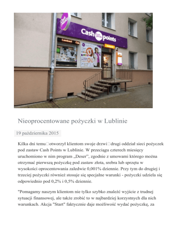 Nieoprocentowane pożyczki w Lublinie 19 października 2015 Kilka dni temu otworzył klientom swoje drzwi drugi oddział sieci pożyczek pod zastaw Cash Points w Lublinie. W przeciągu czterech miesięcy uruchomiono w nim program „Deser”, zgodnie z umowami którego można otrzymać pierwszą pożyczkę pod zastaw złota, srebra lub sprzętu w wysokości oprocentowania zaledwie 0,001% dziennie. Przy tym do drugiej i trzeciej pożyczki również stosuje się specjalne warunki - pożyczki udziela się odpowiednio pod 0,2% i 0,5% dziennie. "Pomagamy naszym klientom nie tylko szybko znaleźć wyjście z trudnej sytuacji finansowej, ale także zrobić to w najbardziej korzystnych dla nich warunkach. Akcja "Start" faktycznie daje możliwość wydać pożyczkę, za którą nie trzeba płacić. Wkrótce nieoprocentowane pożyczki od Cash Points będą dostępne jeszcze większej ilości mieszkańców Polski, ponieważ w najbliższym czasie planujemy otwarcie oddziałów w Rzeszowie i innych miastach w kraju" – mówi kierownik sieci Cash Points Juriy Powidayko. .Firma Cash Points Finanse (TM Cash Points) działa na polskim rynku od września 2015 roku. Jest częścią międzynarodowego holdingu finansowego BLG Aurum Limited, który zarządza przedsiębiorstwami mikrofinansowania w różnych krajach Europy Wschodniej. Adres i godziny pracy nowego oddziału: Lublin, ul. Lipowa 14/2, CHR Lublin Plaza, Pon.-Nd.: 8:00 - 20:00