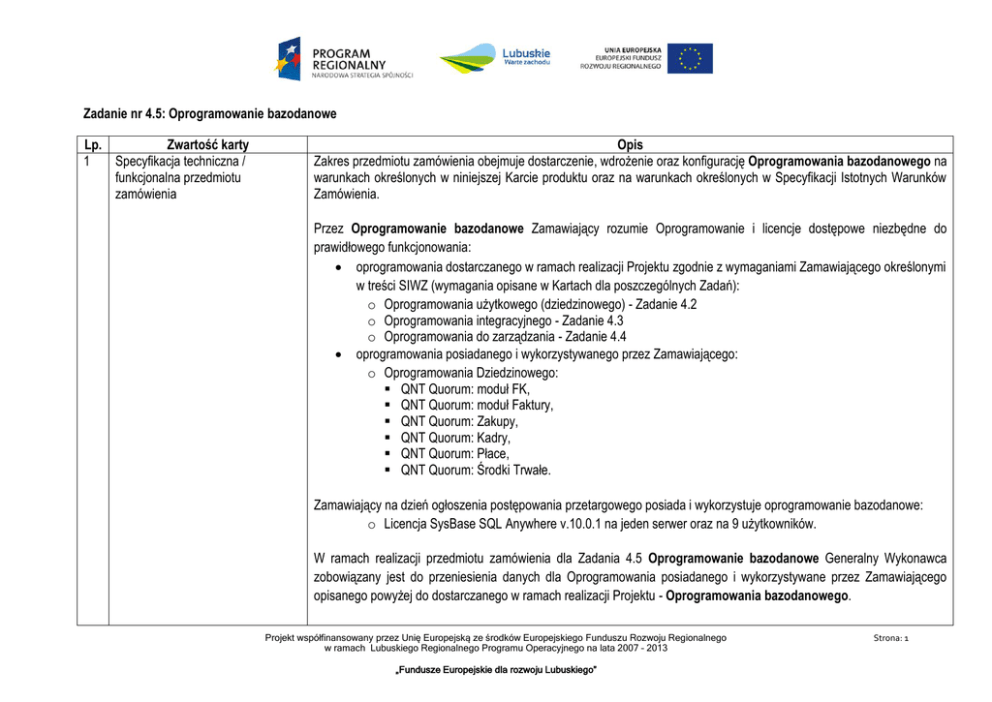 Zadanie nr 4.5: Oprogramowanie bazodanowe Lp. Zwartość karty 1 Specyfikacja techniczna / funkcjonalna przedmiotu zamówienia Opis Zakres przedmiotu zamówienia obejmuje dostarczenie, wdrożenie oraz konfigurację Oprogramowania bazodanowego na warunkach określonych w niniejszej Karcie produktu oraz na warunkach określonych w Specyfikacji Istotnych Warunków Zamówienia. Przez Oprogramowanie bazodanowe Zamawiający rozumie Oprogramowanie i licencje dostępowe niezbędne do prawidłowego funkcjonowania: oprogramowania dostarczanego w ramach realizacji Projektu zgodnie z wymaganiami Zamawiającego określonymi w treści SIWZ (wymagania opisane w Kartach dla poszczególnych Zadań): o Oprogramowania użytkowego (dziedzinowego) - Zadanie 4.2 o Oprogramowania integracyjnego - Zadanie 4.3 o Oprogramowania do zarządzania - Zadanie 4.4 oprogramowania posiadanego i wykorzystywanego przez Zamawiającego: o Oprogramowania Dziedzinowego: QNT Quorum: moduł FK, QNT Quorum: moduł Faktury, QNT Quorum: Zakupy, QNT Quorum: Kadry, QNT Quorum: Płace, QNT Quorum: Środki Trwałe. Zamawiający na dzień ogłoszenia postępowania przetargowego posiada i wykorzystuje oprogramowanie bazodanowe: o Licencja SysBase SQL Anywhere v.10.0.1 na jeden serwer oraz na 9 użytkowników. W ramach realizacji przedmiotu zamówienia dla Zadania 4.5 Oprogramowanie bazodanowe Generalny Wykonawca zobowiązany jest do przeniesienia danych dla Oprogramowania posiadanego i wykorzystywane przez Zamawiającego opisanego powyżej do dostarczanego w ramach realizacji Projektu - Oprogramowania bazodanowego. Projekt współfinansowany przez Unię Europejską ze środków Europejskiego Funduszu Rozwoju Regionalnego w ramach Lubuskiego Regionalnego Programu Operacyjnego na lata 2007 – 2013 „Fundusze Europejskie dla rozwoju Lubuskiego” Strona: 1 Oprogramowanie bazodanowe oczekiwane przez Zamawiającego: SysBase SQL ANYWHERE™ v.12 (licencja zgodna z warunkami opisanymi w pkt. 2. Ilość) – lub równoważne. Zamawiający dopuszcza zaproponowanie oprogramowania równoważnego - za oprogramowanie równoważne Zamawiający uznaje Oprogramowanie posiadające tożsamą funkcjonalność co wskazane w opisie przedmiotu zamówienia (Zadanie nr 4.5: Oprogramowanie bazodanowe) oraz możliwość pełnej integracji i współpracy z Oprogramowaniem dostarczanym w ramach realizacji Projektu jak również z Oprogramowaniem Dziedzinowym posiadanym i wykorzystywanym przez Zamawiającego. Zamawiający zastrzega sobie prawo do testów Oprogramowania równoważnego przed zawarciem Umowy. Oprogramowanie bazodanowe musi spełniać następujące wymagania minimalne: Wymagania systemowe i obsługiwane platformy o Windows x86 i x64 o Windows Mobile o Linux x86 i x64 o Sun Solaris SPARC i x64 o Mac OS X na platformie Intel o IBM AIX Protokoły komunikacji klient/serwer o TCP/IP o Pamięć współdzielona o Obsługa protokołu IPv6 w systemach Windows i Linux Funkcje bazy danych o Konfiguracje bazy danych tylko do odczytu, skalowalne poziomo o Monitorowanie serwerów baz danych poprzez sieć Web o Dane przestrzenne o Generator sekwencji o Wybór spośród poleceń DML o Blokada na poziomie wiersza o Wysoce wydajny, samodzielnie dostrajający się, oparty na kosztach optymalizator zapytań Projekt współfinansowany przez Unię Europejską ze środków Europejskiego Funduszu Rozwoju Regionalnego w ramach Lubuskiego Regionalnego Programu Operacyjnego na lata 2007 – 2013 „Fundusze Europejskie dla rozwoju Lubuskiego” Strona: 2 Zaawansowane algorytmy wykonywania zapytań Dynamiczna zmiana rozmiaru bufora Widoki zmaterializowane Izolacja migawek Wyszukiwanie pełno tekstowe Kompresja kolumn Wyzwalacze i procedury zapisane w językach SQL i Java Zewnętrzne procedury zapisane w językach ESQL, ODBC, Java, CLR(.NET), Perl i PHP Wsparcie dla dużych obiektów binarnych (BLOB) Eksport/import XML i funkcje związane z SQLX Tworzenie luster baz danych i wsparcie dla klastrów Defragmentacja tablic i indeksów w uruchomionej bazie Archiwizacja uruchomionej bazy Kolejkowanie i obsługa zdarzeń Tryb pracy w pamięci Produkcja i konsumpcja usług Web Silne szyfrowanie plików baz danych i komunikacji sieciowej Szyfrowanie tabel, audyty dopasowywane do użytkownika, reguły haseł, funkcje mieszające SH256, uwierzytelnianie protokołem Kerberos o Zintegrowany serwer HTTP o Zdalny dostęp danych do innych systemów RDBMS o Wsparcie przetwarzania analitycznego online (OLAP) Funkcje programistyczne o Dane przestrzenne o Graficzne zarządzanie bazami danych i narzędzia przeglądania o Szerokie wsparcie dla narzędzi programistycznych min. Sybase Power Builder, Microsoft Visual Studio, Borland Delphi, Eclipse o Wsparcie dla języka .NET 2.0 i późniejszych wersji o Wsparcie dla języków programowania: C#, VB.NET, C/C++, ASP, ASP.NET, JSP, Java, PHP i Perl DBD o Zaawansowana funkcjonalność OLAP, zwijanie, złożenia rekursywne oraz złożenia i przecięcia indeksów Statystyki bazy danych o Liczba baz danych na jednym serwerze: min. 255 o o o o o o o o o o o o o o o o o o Projekt współfinansowany przez Unię Europejską ze środków Europejskiego Funduszu Rozwoju Regionalnego w ramach Lubuskiego Regionalnego Programu Operacyjnego na lata 2007 – 2013 „Fundusze Europejskie dla rozwoju Lubuskiego” Strona: 3 o Wielkość baz danych: ograniczona tylko wielkością pamięci, pojemnością dysku i ograniczeniami platformy o Liczba znaków w nazwie obiektu bazy danych: min. 128 Statystyki tabel o Liczba indeksów w tabeli: min. do 2048 o Wielkość tabeli: ograniczona tylko wielkością pliku o Liczba tabel w bazie danych: min. do 4 miliardów o Liczba kolumn w tabeli: min. 45000 o Rozmiar pola: min. 2 GB o Liczba wierszy w tabeli: ograniczona tylko wielkością pliku o Rozmiar wiersza: ograniczony wielkością pliku Statystyki procedur zapisanych i wyzwalaczy o Maksymalna długość procedury zapisanej: min. 2 GB o Zagnieżdżanie: ograniczone pojemnością dysk