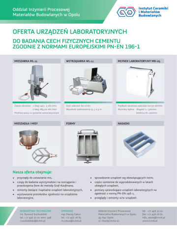 Oddział Inżynierii Procesowej Materiałów Budowlanych w Opolu OFERTA URZĄDZEŃ LABORATORYJNYCH DO BADANIA CECH FIZYCZNYCH CEMENTU ZGODNIE Z NORMAMI EUROPEJSKIMI PN-EN 196-1 MIESZARKA ML-11 WSTRZĄSARKA WL-11 MŁYNEK LABORATORYJNY MB-05 Zakres obrotów: 1 bieg 140± 5 obr./min Ilość uderzeń: 60 1/min Prędkość obrotowa walczaka nw=50 obr/min Wysokość podnoszenia 15 ± 0,3 m Wymiary bębna: długość L= 500mm 2 bieg 285±10 obr./min Możliwa praca w systemie automatycznym MIESZADŁA I MISY średnica D= 420mm FORMY NASADKI Nasza oferta obejmuje: • przyrządy do ustawiania mis, • sprawdzanie urządzeń wg obowiązujących norm, • czopy do badania wytrzymałości na rozciąganie i przezbrojenia form do metody Graf-Kaufmana, • części zamienne do wyprodukowanych w latach ubiegłych urządzeń, • remonty bieżące i kapitalne urządzeń laboratoryjnych, • pomiary sprawdzające urządzeń laboratoryjnych na zgodność z normą PN-EN 196-1, • wystawianie protokołów zgodności na urządzenia laboratoryjne, DORADZTWO TECHNICZNE inż. Ryszard Suchodolski tel. +77 456 32 01 wew. 348 [email protected] SPRZEDAŻ mgr Maciej Cekus tel. +77 456 26 61 [email protected] • przeglądy i remonty w/w urządzeń. Oddział Inżynierii Procesowej Materiałów Budowlanych w Opolu 45-641 Opole ul. Oświęcimska 21 tel. +77 456 32 01 fax: +77 456 26 61 [email protected] www.icimb.pl