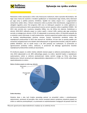 Sytuacja na rynku srebra 2014/11/07 Notowania srebra wyznaczyły w 2011 roku historyczne maksimum, które wynosiło 49,51USd/oz. Od tego czasu mamy do czynienia z trendem spadkowym w notowaniach tego metalu, który skierował już jego cenę w pobliże poziomu 15USD/oz. Spadek ten należy wiązać m.in. z pogorszeniem sentymentu wobec złota, z którym notowania srebra są bardzo silnie skorelowane, wygaszeniem w ubiegłym tygodniu przez Fed programu QE3 oraz ze słabnącym popytem na srebro (głównie w sektorze przemysłowym), który spowodował znaczny wzrost zapasów srebra na giełdzie COMEX. Od 2011 roku wzrosły one z poziomu niespełna 100tys. ton, do 181tys ton obecnie. Dodatkowo w okresie 2010-2013 całkowity popyt na srebro spadł o niemal 4,8%, podczas gdy jego produkcja wzrosła w analogicznym okresie o 9,2%. W odpowiedzi na przecenę srebra z III kwartału pojawiły się w ostatnim czasie informacje, iż część producentów zamierza ograniczyć podaż srebra w oczekiwaniu na bardziej satysfakcjonujące poziomy cenowe. Poziom rentowności produkcji srebra dla największych producentów w 2013 roku wynosił ok. 25USD/oz. W tym roku za sprawą spadku cen surowców energetycznych oraz działań ukierunkowanych na ograniczenie kosztów, próg ten spadł w pobliże 20USD/oz. Jest to wynik wciąż o ok 25% powyżej cen rynkowych, co przemawia za ograniczaniem produkcji srebra, zwłaszcza, iż przestrzeń do dalszego ograniczenia kosztów największych producentów została już wyczerpana. W strukturze popytu na srebro istotny odsetek stanowi popyt w sektorze przemysłowym, który w roku 2013 odpowiadał za ok. 60% całkowitego popytu na srebro. Spośród krajów o największym wykorzystaniu srebra w sektorze przetwórczym należy zwrócić uwagę na Chiny oraz Stany Zjednoczone, których przemysł jest odpowiedzialny odpowiednio za 17,9% oraz 12,2% całkowitego zapotrzebowania na srebro. Wykres: Struktura popytu na srebro wg. sektorów Silverware 5% Photography 5% Coins & Medals 12% Jewelry 20% Industrial Applications 58% Źródło: Bloomberg Ostatnie dane z obu tych krajów pozwalają patrzeć na przyszłość srebra z umiarkowanym optymizmem, ponieważ od początku roku można zauważyć pewne symptomy ożywienia popytu na srebro w sektorze przemysłowym, co przemawia za wyhamowaniem trwających od ponad trzech lat Klauzula ograniczenia odpowiedzialności znajduje się na ostatniej stronie. spadków w notowaniach tego metalu. Dane na temat importu srebra z do Chin wskazują na jego wzrost w pierwszych dziewięciu miesiącach tego roku o 3,6% w odniesieniu do analogicznego okresu w 2013 roku. Dodatkowo produkcja komputerów oraz półprzewodników, które odpowiadają za znaczną część popytu na srebro z chińskiego przemysłu, w pierwszych ośmiu miesiącach tego roku wzrosła odpowiednio o 9% oraz 17% w porównaniu do analogicznego okresu 2013 roku. Miliony 45,00 Miliardy Wykres: Chińska produkcja komputerów oraz półprzewodników (dane miesięczne) 40,00 35,00 50,00 45,00 40,00 35,00 30,00 30,00 25,00 25,00 20,00 20,00 15,00 15,00 10,00 paź 08 10,00 paź 09 paź 10 China Computer Output (units) paź 11 paź 12 paź 13 China Semi-Conductor Output (units) Źródło: Bloomberg Pozytywne sygnały płyną również z amerykańskiego przemysłu gdzie indeks ISM obrazujący koniunkturę w amerykańskim sektorze przetwórczym w październiku wzrósł do poziomu 59,0pkt., co potwierdza jego dalsze przyspieszanie. Dodatkowo coraz lepsza sytuacja na amerykańskim rynku pracy wraz z taniejącą ropą na światowych rynkach finansowych powinna oddziaływać w kierunku zwiększenia skłonności do konsumpcji Amerykanów, a w konsekwencji do wzrostu sprzedaży elektroniki w USA, również tej pochodzącej z Chin. Warto też zwrócić uwagę na stosunek cen złota do srebra, który w ostatnim czasie wzrósł do najwyższego poziomu od pięciu lat. Wykres: Stosunek ceny złota do ceny srebra 75 65 55 45 35 25 sty 09 sty 10 sty 11 sty 12 sty 13 Stosunek ceny złota do ceny srebra Źródło: Bloomberg sty 14 Ostatnie dane na temat sprzedaży złotych monet pokazują, iż część inwestorów również zauważyła, iż srebro jest najtańsze w stosunku do złota od 2009 roku. Październikowa sprzedaż srebrnych monet wzrosła do najwyższego poziomu od 21 miesięcy. Warto jednak zauważyć, iż popyt inwestycyjny na srebro nie jest czynnikiem tak silnie determinującym jego ceny tak jak to ma miejsce w przypadku złota. 8 7 6 Miliony Wykres: Sprzedaż srebrnych monet – Silver Eagle 5 4 3 2 1 0 sty 09 sty 10 sty 11 sty 12 Sprzedaż srebrnych monet - Silver Eagle sty 13 sty 14 12-miesięczna średnia Źródło: Bloomberg Obecnie głównym czynnikiem ryzyka dla notowań srebra jest siła dolara –korelacja pomiędzy indeksem dolara (który mierzy siłę USD wobec głównych walut) wynosi ok. -0,4, co przy oczekiwaniach na dalsze umocnienie dolara może ciążyć notowaniom srebra. Oczekujemy jednak, iż czynnik ten zostanie zneutralizowany przez rosnące zapotrzebowanie w przemyśle. Wykres: Notowania srebra USD za uncję. Źródło: Bloomberg Z perspektywy analizy technicznej notowania srebra znajdują się obecnie w bliskiej odległości od istotnego wsparcia przy poziomie 15USD/oz., które powinno ograniczać dalszą, głębszą przecenę srebra. W najbliższym czasie należy jednak oczekiwać odbicia, za czym przemawia silne wyprzedanie w jego notowaniach. Tabela Mediana prognoz rynkowych Mediana prognoz (Bloomberg) Spot Q4 14 Q1 15 Q2 15 Q3 15 15,38 19,00 18,88 18,63 18,88 2015 19,00 2016 19,96 2017 20,00 2018 17,88 Źródło: Bloomberg Reasumując, patrząc na fundamenty srebra w średnim terminie należy oczekiwać poprawy sentymentu wobec srebra. W przypadku tego metalu można również doszukiwać się pewnych analogii do sytuacji w notowaniach aluminium, którego ceny w ubiegłym roku znalazły się poniżej kosztów produkcji, co wywołało falę ograniczenia jego produkcji i