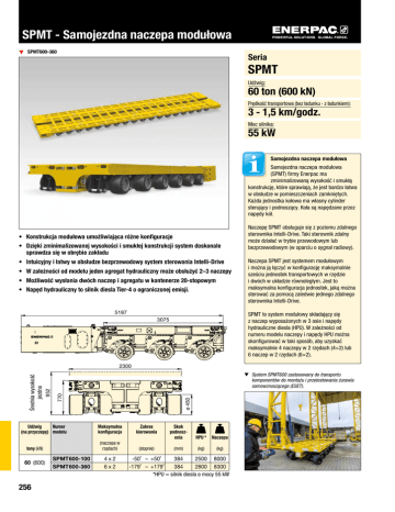 SPMT - Samojezdna naczepa modułowa ▼ SPMT600-360 Seria SPMT Udźwig: 60 ton (600 kN) Prędkość transportowa (bez ładunku - z ładunkiem): 3 - 1,5 km/godz. Moc silnika: 55 kW Samojezdna naczepa modułowa Samojezdna naczepa modułowa (SPMT) firmy Enerpac ma zminimalizowaną wysokość i smukłą konstrukcję, które sprawiają, że jest bardzo łatwa w obsłudze w pomieszczeniach zamkniętych. Każda jednostka kołowa ma własny cylinder sterujący i podnoszący. Koła są napędzane przez napędy kół. • Konstrukcja modułowa umożliwiająca różne konfiguracje • Dzięki zminimalizowanej wysokości i smukłej konstrukcji system doskonale sprawdza się w obrębie zakładu • Intuicyjny i łatwy w obsłudze bezprzewodowy system sterowania Intelli-Drive • W zależności od modelu jeden agregat hydrauliczny może obsłużyć 2–3 naczepy • Możliwość wysłania dwóch naczep i agregatu w kontenerze 20-stopowym • Napęd hydrauliczny to silnik diesla Tier-4 o ograniczonej emisji. 5187 Naczepę SPMT obsługuje się z poziomu zdalnego sterownika Intelli-Drive. Taki sterownik zdalny może działać w trybie przewodowym lub bezprzewodowym (w oparciu o sygnał radiowy). Naczepa SPMT jest systemem modułowym i można ją łączyć w konfigurację maksymalnie sześciu jednostek transportowych w rzędzie i dwóch w układzie równoległym. Jest to maksymalna konfiguracja jednostek, jaką można sterować za pomocą zaledwie jednego zdalnego sterownika Intelli-Drive. SPMT to system modułowy składający się z naczep wyposażonych w 3 osie i napędy hydrauliczne diesla (HPU). W zależności od numeru modelu naczepy i napędy HPU można skonfigurować w taki sposób, aby uzyskać maksymalnie 4 naczepy w 2 rzędach (4×2) lub 6 naczep w 2 rzędach (6×2). 3075 ® ▼ System SPMT600 zastosowany do transportu komponentów do montażu i przetestowania żurawia samowznoszącego (ESET). Udźwig Numer (na przyczepę) modelu tony (kN) 60 (600) 256 SPMT 600-100 SPMT 600-360 ø 450 770 952 Średnia wysokość jezdna 2300 Maksymalna konfiguracja Zakres kierowania (naczepa w rzędach) Skok podnoszenia HPU * Naczepa (stopnie) (mm) (kg) (kg) 4x2 6x2 -50˚ – +50˚ 384 2500 8000 -179˚ – +179˚ 384 2800 8300 *HPU = silnik diesla o mocy 55 kW