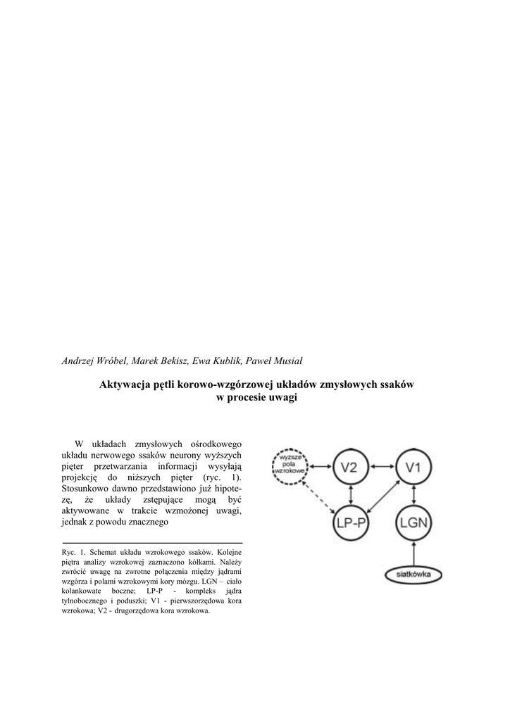 Andrzej Wróbel, Marek Bekisz, Ewa Kublik, Paweł Musiał Aktywacja pętli korowo-wzgórzowej układów zmysłowych ssaków w procesie uwagi W układach zmysłowych ośrodkowego układu nerwowego ssaków neurony wyższych pięter przetwarzania informacji wysyłają projekcję do niższych pięter (ryc. 1). Stosunkowo dawno przedstawiono już hipotezę, że układy zstępujące mogą być aktywowane w trakcie wzmożonej uwagi, jednak z powodu znacznego Ryc. 1. Schemat układu wzrokowego ssaków. Kolejne piętra analizy wzrokowej zaznaczono kółkami. Należy zwrócić uwagę na zwrotne połączenia między jądrami wzgórza i polami wzrokowymi kory mózgu. LGN – ciało kolankowate boczne; LP-P - kompleks jądra tylnobocznego i poduszki; V1 - pierwszorzędowa kora wzrokowa; V2 - drugorzędowa kora wzrokowa. NAUKI BIOLOGICZNE skomplikowania połączeń na wyższych piętrach analizy wzrokowej odpowiednie mechanizmy zbadano najpierw na poziomie połączeń korowowzgórzowych [1-3]. Wstępujące włókna komórek przekaźnikowych ciała kolankowatego bocznego (LGN) dają, kolaterale do komórek piramidowych warstwy szóstej kory wzrokowej (V1). Komórki te wysyłają, swoje aksony z powrotem do LGN, gdzie ich synapsy stanowią ponad połowę wszystkich synaps pobudzeniowych. Metodą rejestracji wewnątrzkomórkowych udało się pokazać, że u kota synapsy włókien korowowzgórzowych w LGN mają mechanizm wzmocnienia częstot1iwościowego, które osiąga maksyma1ną wartość przy częstot1iwości 20 Hz (zakres beta w widmie EEG). Odkrycie tego mechanizmu pozwoliło postawić hipotezę, według której aktywność w paśmie beta przekazywana włóknami drogi korowokolankowatej powoduje depolaryzację neuronów w LGN, a przez to wzmocnienie sygnału przekazywanego z siatkówki do kory wzrokowej [3]. Rola drogi korowo-kolankowatej nie była dotąd okreś1ona, gdyż badania prowadzono na zwierzętach uśpionych, a komórki piramidowe warstwy 6 zaczynają być aktywne dopiero przy wybudzaniu z narkozy. W celu sprawdzenia, czy aktywność w paśmie beta zwiększa się w stanie uwagi wzrokowej, przeprowadzono doświadczenie na kotach wykonujących naprzemiennie wzrokowe lub słuchowe zadanie warunkowe wymagające uwagi odpowiedniej moda1ności. W doświadczeniu tym koty umieszczano w małej drewnianej klatce, z dwiema parami półprzezroczystych drzwi w przedniej ścianie. Każda z prób (wzrokowa lub słuchowa) rozpoczynała się od bodźca przygotowawczego odpowiedniej moda1ności: błysku rozproszonego światła lub krótko trwającego białego szumu ze źródeł umieszczonych poza przednią ścianą. W próbie wzrokowej zadaniem zwierzęcia było zauważenie, na których drzwiach pojawi się bodziec różnicowy w postaci 1 s błysku plamki świet1nej. Bodziec ten wyświetlano po odroczeniu trwającym od 10 do 20 s, a naciśnięcie odpowiednich drzwi umoż1iwiało zwierzęciu dostęp do nagradzającego kawałka mięsa. Analogicznie, krótki (1 s) szum z głośników umieszczonych w bocznych Ryc. 2. A, średnie widma amplitudowe (fourierowskie) wyliczone z sygnałów rejestrowanych z kory wzrokowej kota w czasie wzmożonej uwagi wzrokowej (gruba linia) i słuchowej (cienka linia) podczas jednej sesji doświadczalnej. Każde widmo było liczone z 14 niezależnych próbek długości 2,5 s, w próbach zakończonych poprawną reakcją zwierzęcia; B, porównanie średnich widm amplitudowych potencjałów polowych w czasie poprzedzającym poprawne i błędne reakcje warunkowe, w tej samej sesji; C, D, widma amplitudowe obrazujące zawartość częstotliwościową sygnału rejestrowanego z pierwszorzędowej kory wzrokowej (C) i słuchowej (D) innego kota w czasie poprawnych prób różnicowych, w jednej sesji doświadcza1nej. W widmie aktywności kory wzrokowej rejestrowanym u obu kotów przed poprawną reakcją na bodziec wzrokowy pasmo beta ma istotnie większą amplitudę niż w widmach obliczonych dla prób słuchowych oraz błędnych prób wzrokowych. W widmie aktywności kory słuchowej amplituda pasma beta jest znacznie większa w próbach słuchowych niż wzrokowych. NAUKI BIOLOGICZNE ścianach pozwalał zwierzęciu rozwiązać zadanie różnicowania słuchowego. W opisanym schemacie doświadczalnym wzrokowy lub słuchowy bodziec przygotowawczy miał na celu wzbudzenie uwagi w odpowiednim układzie zmysłowym, która powinna utrzymywać się przez czas odroczenia aż do prezentacji bodźca różnicowego. Lokalne potencjały polowe (LFP tub mikro-EEG) rejestrowano za pomocą elektrod zaimplantowanych do różnych okolic kory wzrokowej (projekcyjnej i pozaprojekcyjnej), ciała kolankowatego bocznego (LGN) i kompleksu jądra tylnobocznego i poduszki (LP-P, ryc. 1) oraz projekcyjnej kory słuchowej [2, 3]. Fourierowska analiza LFP wykazała, że aktywność beta w specyficznym układzie (wzrokowym tub słuchowym) istotnie wzrasta w okresie między bodźcem przygotowawczym a różnicowym, kiedy koty oczekiwały na bodziec odpowiedniej modalności (ryc. 2). Co więcej, wzrost ten rejestrowano tylko w tych próbach, które kończyły się prawidłową reakcją zwierzęcia, co dowodzi, że stanowi ona podłoże mechanizmu uwagi w układzie wzrokowym (ryc. 2). Przy użyciu metody skierowanych funkcji przenoszenia oraz kroskorelacji pokazano również, że zgodnie z hipotezą aktywność beta w próbach wymagających uwagi wzrokowej, rozprzestrzenia się z kory wzrokowej do ciała kolankowatego bocznego [2, 3]. W doświadczeniach wykazano, że aktywność projekcyjnej kory wzrokowej, wyrażająca się zwiększeniem mocy widma fourierowskiego w paśmie beta, pojawia się w stanie uwagi również w innych obszarach kory wzrokowej oraz w integracyjnych jądrach wzgórza: kompleksie jądra tylnobocznego i poduszki (LP-P). Komórki tego kompleksu otrzymują projekcję z warstwy 5. pierwszorzędowej okolicy kory wzrokowej i przekazują pobudzenie zwrotne do warstw odbiorczych zarówno tej okolicy, jak równ