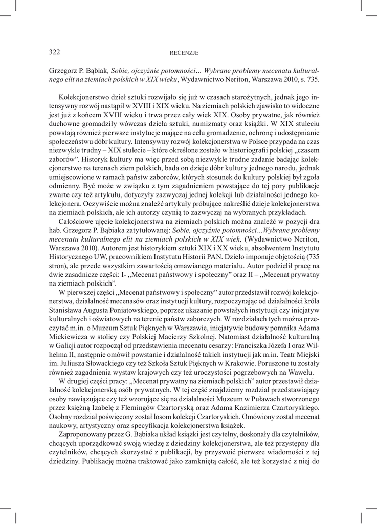 322 RECENZJE Grzegorz P. Bąbiak, Sobie, ojczyźnie potomności… Wybrane problemy mecenatu kulturalnego elit na ziemiach polskich w XIX wieku, Wydawnictwo Neriton, Warszawa 2010, s. 735. Kolekcjonerstwo dzieł sztuki rozwijało się już w czasach starożytnych, jednak jego intensywny rozwój nastąpił w XVIII i XIX wieku. Na ziemiach polskich zjawisko to widoczne jest już z końcem XVIII wieku i trwa przez cały wiek XIX. Osoby prywatne, jak również duchowne gromadziły wówczas dzieła sztuki, numizmaty oraz książki. W XIX stuleciu powstają również pierwsze instytucje mające na celu gromadzenie, ochronę i udostępnianie społeczeństwu dóbr kultury. Intensywny rozwój kolekcjonerstwa w Polsce przypada na czas niezwykle trudny – XIX stulecie – które określone zostało w historiografii polskiej „czasem zaborów”. Historyk kultury ma więc przed sobą niezwykle trudne zadanie badając kolekcjonerstwo na terenach ziem polskich, bada on dzieje dóbr kultury jednego narodu, jednak umiejscowione w ramach państw zaborców, których stosunek do kultury polskiej był zgoła odmienny. Być może w związku z tym zagadnieniem powstające do tej pory publikacje zwarte czy też artykułu, dotyczyły zazwyczaj jednej kolekcji lub działalności jednego kolekcjonera. Oczywiście można znaleźć artykuły próbujące nakreślić dzieje kolekcjonerstwa na ziemiach polskich, ale ich autorzy czynią to zazwyczaj na wybranych przykładach. Całościowe ujęcie kolekcjonerstwa na ziemiach polskich można znaleźć w pozycji dra hab. Grzegorz P. Bąbiaka zatytułowanej: Sobie, ojczyźnie potomności…Wybrane problemy mecenatu kulturalnego elit na ziemiach polskich w XIX wiek, (Wydawnictwo Neriton, Warszawa 2010). Autorem jest historykiem sztuki XIX i XX wieku, absolwentem Instytutu Historycznego UW, pracownikiem Instytutu Historii PAN. Dzieło imponuje objętością (735 stron), ale przede wszystkim zawartością omawianego materiału. Autor podzielił pracę na dwie zasadnicze części: I- „Mecenat państwowy i społeczny” oraz II – „Mecenat prywatny na ziemiach polskich”. W pierwszej części „Mecenat państwowy i społeczny” autor przedstawił rozwój kolekcjonerstwa, działalność mecenasów oraz instytucji kultury, rozpoczynając od działalności króla Stanisława Augusta Poniatowskiego, poprzez ukazanie powstałych instytucji czy inicjatyw kulturalnych i oświatowych na terenie państw zaborczych. W rozdziałach tych można przeczytać m.in. o Muzeum Sztuk Pięknych w Warszawie, inicjatywie budowy pomnika Adama Mickiewicza w stolicy czy Polskiej Macierzy Szkolnej. Natomiast działalność kulturalną w Galicji autor rozpoczął od przedstawienia mecenatu cesarzy: Franciszka Józefa I oraz Wilhelma II, następnie omówił powstanie i działalność takich instytucji jak m.in. Teatr Miejski im. Juliusza Słowackiego czy też Szkoła Sztuk Pięknych w Krakowie. Poruszone tu zostały również zagadnienia wystaw krajowych czy też uroczystości pogrzebowych na Wawelu. W drugiej części pracy: „Mecenat prywatny na ziemiach polskich” autor przestawił działalność kolekcjonerską osób prywatnych. W tej część znajdziemy rozdział przedstawiający osoby nawiązujące czy też wzorujące się na działalności Muzeum w Puławach stworzonego przez księżną Izabelę z Flemingów Czartoryską oraz Adama Kazimierza Czartoryskiego. Osobny rozdział poświęcony został losom kolekcji Czartoryskich. Omówiony został mecenat naukowy, artystyczny oraz specyfikacja kolekcjonerstwa książek. Zaproponowany przez G. Bąbiaka układ książki jest czytelny, doskonały dla czytelników, chcących uporządkować swoją wiedzę z dziedziny kolekcjonerstwa, ale też przystępny dla czytelników, chcących skorzystać z publikacji, by przyswoić pierwsze wiadomości z tej dziedziny. Publikację można traktować jako zamkniętą całość, ale też korzystać z niej do RECENZJE 323 zapoznania się z działalnością kolekcjonerską poszczególnych osób, instytucji lub inicjatywy, bowiem każdy rozdział poświecony tym zagadnieniom stanowi odrębną całość. Układ ten nadaje publikacji charakter swoistej encyklopedii. Każdy rozdział poświęcony osobie instytucji lub inicjatywie kolekcjonerskiej zwiera rozbudowany aparat naukowy (przypisy), dzięki czemu czytelnik może samodzielnie pogłębić swoją wiedzę dotyczącą kolekcjonerstwa w XIX wieku. Autor urozmaicił treść publikacji ciekawymi cytatami źródłowymi. Warto podkreślić również stronę graficzną publikacji. W tekście pojawiają się reprodukcje portretów osób, które omawiane są w poszczególnych rozdziałach, obrazów pochodzących z prezentowanych kolekcji oraz budowli, gdzie były one umiejscowione. Reprodukcje te pochodzą większości z XIX –wiecznych czasopism, co niewątpliwie podnosi walory publikacji. Książka zawiera również rozbudowaną bibliografią (liczącą 42 strony), w której obok opracowań zwartych i artykułów zamieszczonych w czasopismach prezentowane są również źródła z których korzystał autor. W celu ułatwienia korzystania czytelnikowi z tak rozbudowanego opracowania autor przygotował również znacznie rozbudowany indeks osobowy. Do książki dołączona jest płyta CD, na której prezentowane są zdjęcia ważniejszych instytucji, miejsc znajdujących się w ośrodkach miejskich (min. Warszawa, Łódź, Lwów). Wspomniane miasta można przeglądać po kątem umiejscowienia w nich kolekcji czy też instytucji: państwowych, prywatnych, społecznych. Zaznaczyć należy ich wszystkie zdjęcia na płycie wykonał autor prezentowanego dzieła. Oczywiście publikacja zawiera spis ilustracji znajdujących się na płycie (16 stron). Szczegółowa lektura poszczególnych rozdziałów nastręcza pewne wątpliwości. Autor, przedstawiając kolekcje stworzoną m.in. przez Jana Feliksa Tarnowskiego i Walerię ze Strojnowskich (str. 343-348), nie przedstawił na