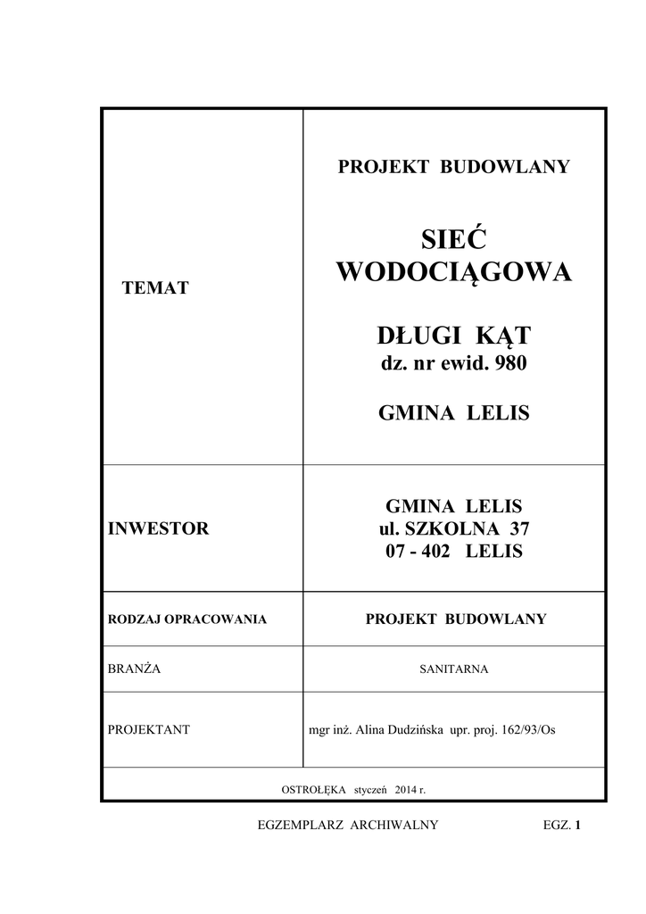 PROJEKT BUDOWLANY SIEĆ WODOCIĄGOWA TEMAT DŁUGI KĄT dz. nr ewid. 980 GMINA LELIS GMINA LELIS ul. SZKOLNA 37 07 - 402 LELIS INWESTOR RODZAJ OPRACOWANIA BRANŻA PROJEKTANT PROJEKT BUDOWLANY SANITARNA mgr inż. Alina Dudzińska upr. proj. 162/93/Os OSTROŁĘKA styczeń 2014 r. EGZEMPLARZ ARCHIWALNY EGZ. 1 ZAWARTOŚĆ OPRACOWANIA I. OPIS TECHNICZNY 1. 2. 3. 4. 5. 6. 7. 8. Materiały wyjściowe .................................................................................................str. S3 Zakres opracowania...................................................................................................str. S3 Geotechniczne warunki posadowienia obiektu ........................................................str. S3 Opis sieci wodociągowej ..........................................................................................str. S3 Roboty ziemne ..........................................................................................................str. S4 Próba szczelności, płukanie i dezynfekcja sieci .......................................................str. S4 Zabezpieczenie ruchu drogowego ............................................................................str. S4 Uwagi końcowe ........................................................................................................str. S5 II. CZĘŚĆ GRAFICZNA Rys. nr 1 Projekt zagospodarowania .............................................................................str. S6 Rys. nr 2 Schemat montażu hydrantu.............................................................................str. S7 Rys. nr 3 Schemat węzłów wodociągowych .................................................................str. S8 III. INFORMACJA BIOZ ...........................................................................................str. S9 IV. Oświadczenie ........................................................................................................str. S11 V. Przynależność do MOIIB i Uprawnienia .........................................................................str. (w egzemplarzu Archiwalnym) S12 OPIS TECHNICZNY DO PROJEKTU BUDOWLANEGO SIECI WODOCIĄGOWEJ w miejscowości DŁUGI KĄT dz. nr ewid. 980 Gmina LELIS 1. Materiały wyjściowe Do opracowania dokumentacji wykorzystano: - mapy sytuacyjno-wysokościowe do celów projektowych w skali 1:500 - wypis z tekstu planu zagospodarowania przestrzennego Gminy Lelis - warunki techniczne budowy sieci wodociągowej - uzgodnienie trasy sieci wodociągowej w Zespole Uzgadniania Dokumentacji Projektowej uzbrojenia podziemnego - wizja w terenie 2. Zakres opracowania Opracowanie obejmuje projekt budowlany ,,Sieci wodociągowej w miejscowości Długi Kąt na dz. nr ewid. 980 ” Gmina Lelis. Zaprojektowano sieć wodociągową w pasie drogowym drogi gminnej długości 269 m. Miejscem włączenia projektowanej sieci wodociągowej jest istniejąca końcówka sieci wodociągowej o średnicy ø 80 mm. Sieć wodociągową zakończyć naziemnym hydrantem p-poż o średnicy 80 mm. Zgodnie z Rozporządzeniem Rady Ministrów z 9 listopada 2010 poz. 1397 w sprawie przedsięwzięć mogących znacząco oddziaływać na środowisko §3.1 pkt. 68 Dz. U. Nr 213 budowa sieci wodociągowej w tej ulicy nie wymaga sporządzenia raportu oceny oddziaływania na środowisko oraz decyzji uwarunkowań środowiskowych. 3. Geotechniczne warunki posadowienia obiektu. Zgodnie z Rozporządzeniem Ministra Transportu Budownictwa i Gospodarki Morskiej z dnia 25 kwietnia 2012 poz. 463 Dz.U. z 2012 r. w sprawie ustalenia geotechnicznych warunków posadawiania obiektów budowlanych projektowaną instalację zakwalifikowano do drugiej kategorii geotechnicznej. Warunki gruntowe - proste z uwagi na występujące jednorodne warstwy gruntowe. Na podstawie wykorzystanych archiwalnych materiałów geologicznych na głębokości około 0,0 – 2,0 m występują piaski drobne miejscami z piaskami pylastymi oraz gliną częściowo piaski gliniaste. Około 2,2 – 4,0 m występują gliny zwałowe z ewentualnymi przewarstwieniami piasków drobnych i średnich z domieszką piasków pylastych. Woda gruntowa występuje w sposób nieregularny, zawieszona jest na stropie utworów nieprzepuszczalnych – gliny zwałowej i nie tworzy jednolitego poziomu. W okresie intensywnych opadów poziom wody może się podwyższyć o 0,5m. 4. Opis sieci wodociągowej Zaprojektowano sieć wodociągową z rur PCV litych wodociągowych o średnicy 90 x 4,3 mm z wydłużonymi kielichami i wtopioną uszczelką wargową PN 1,0 MPa Rury użyte do budowy wodociągu powinny być odpowiednio oznakowane i zawierać następujące informacje ( nadrukowane na rurze i zawarte w ateście producenta) – nazwę producenta – datę produkcji – numer serii – średnicę zewnętrzną i grubość ścianki – numer normy zgodnie z którą wyprodukowano rurę – słowo ,,woda”, ciśnienie Połączenie projektowanego wodociągu z istniejącym wykonać poprzez zabudowę nasuwki PCV o średnicy 90 mm . Połączenia w węzłach sieci wodociągowej zaprojektowano za pomocą kształtek i armatury żeliwnej kołnierzowej. Połączenia rur PCV z armaturą za pomocą kształtek żeliwnych kołnierzowych. Na trasie sieci wodociągowej zaprojektowano hydrant p-poż nadziemny ø 80 z zasuwą. Przy hydrancie należy montować wyłącznie zasuwę z wkładem miękkim z żeliwa, zakończyć skrzynka żeliwną o wym. 270x270 x157 mm. Jako osłonę obudowy zasuwy zastosować rurę PVC ø 160. Skrzynkę zabezpieczyć płytkami betonowymi i oznakować tabliczkami . Hydrant nadziemny oznakować tabliczkami informacyjnymi i pomalować na kolor czerwony. W celu stabilizacji ułożonego przewodu wodociągowego i zabezpieczenia go przed przesunięciem, należy w węzłach wykonać bloki oporowe.(w miejscach montażu hydrantu) Głębokość przykrycia sieci wodociągowej 1,7 m licząc od górnej krawędzi rury do powierzchni terenu. 5. Roboty ziemne Roboty ziemne prow