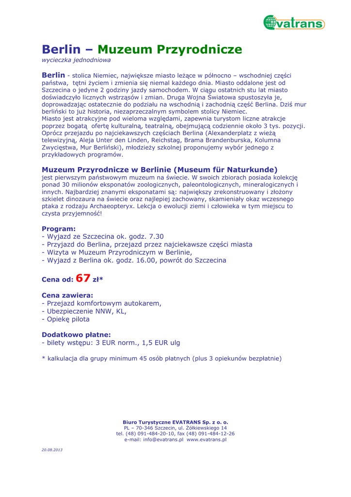 Berlin – Muzeum Przyrodnicze wycieczka jednodniowa Berlin - stolica Niemiec, największe miasto leŜące w północno – wschodniej części państwa, tętni Ŝyciem i zmienia się niemal kaŜdego dnia. Miasto oddalone jest od Szczecina o jedyne 2 godziny jazdy samochodem. W ciągu ostatnich stu lat miasto doświadczyło licznych wstrząsów i zmian. Druga Wojna Światowa spustoszyła je, doprowadzając ostatecznie do podziału na wschodnią i zachodnią część Berlina. Dziś mur berliński to juŜ historia, niezaprzeczalnym symbolem stolicy Niemiec. Miasto jest atrakcyjne pod wieloma względami, zapewnia turystom liczne atrakcje poprzez bogatą ofertę kulturalną, teatralną, obejmującą codziennie około 3 tys. pozycji. Oprócz przejazdu po najciekawszych częściach Berlina (Alexanderplatz z wieŜą telewizyjną, Aleja Unter den Linden, Reichstag, Brama Brandenburska, Kolumna Zwycięstwa, Mur Berliński), młodzieŜy szkolnej proponujemy wybór jednego z przykładowych programów. Muzeum Przyrodnicze w Berlinie (Museum für Naturkunde) jest pierwszym państwowym muzeum na świecie. W swoich zbiorach posiada kolekcję ponad 30 milionów eksponatów zoologicznych, paleontologicznych, mineralogicznych i innych. Najbardziej znanymi eksponatami są: największy zrekonstruowany i złoŜony szkielet dinozaura na świecie oraz najlepiej zachowany, skamieniały okaz wczesnego ptaka z rodzaju Archaeopteryx. Lekcja o ewolucji ziemi i człowieka w tym miejscu to czysta przyjemność! Program: - Wyjazd ze Szczecina ok. godz. 7.30 - Przyjazd do Berlina, przejazd przez najciekawsze części miasta - Wizyta w Muzeum Przyrodniczym w Berlinie, - Wyjazd z Berlina ok. godz. 16.00, powrót do Szczecina Cena od: 67 zł* Cena zawiera: - Przejazd komfortowym autokarem, - Ubezpieczenie NNW, KL, - Opiekę pilota Dodatkowo płatne: - bilety wstępu: 3 EUR norm., 1,5 EUR ulg * kalkulacja dla grupy minimum 45 osób płatnych (plus 3 opiekunów bezpłatnie) Biuro Turystyczne EVATRANS Sp. z o. o. PL – 70-346 Szczecin, ul. śółkiewskiego 14 tel. (48) 091-484-20-10, fax (48) 091-484-12-26 e-mail: [email protected] www.evatrans.pl 20.08.2013