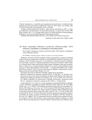 WIAD. ENTOMOL., 22 (1): POZNAŃ 2003 49 i Niemiec wskazują też, że niewielka część populacji może przeżyć zimę i w niektórych przypadkach przetrwać nawet kilka lat (BERNARD , SAMOLĄG 1997: Opusc. zool. flumin., 153: 1-12; B UCZYŃSKI 1999: Acta hydrobiol., 41, 3/4: 219-230). Na łąkach nadbużańskich koło Gródka A. affinis była już stwierdzana w 1995 r., w miejscu oddalonym o niecały kilometr od stanowiska podanego w tej pracy (B UCZYŃSKI 1996: Wiad. entomol., 15, 1: 5-11). Jednak trudno uznać to za dowód istnienia tu trwałej populacji. Wskazuje to raczej na rolę doliny Bugu jako drogi migracji owadów. Dziękuję Panu Rafałowi BERNARDOWI za cenne uwagi do pierwotnej wersji pracy. Paweł B UCZYŃSKI, Zakł. Zool. UMCS, Lublin 334. Nowe stanowisko Orthetrum coerulescens (FONSCOLOMBÉ , 1837) (Odonata: Libellulidae) w południowo-wschodniej Polsce New locality of Orthetrum coerulescens (FONSCOLOMBÉ, 1837) (Odonata: Libellulidae) in the southeastern Poland KEY WORDS: Dragonflies, Odonata, Orthetrum coerulescens, new locality, SE Poland. Orthetrum coerulescens (FONSCOLOMBÉ) rozwija się najczęściej w czystych, niewielkich wodach bieżących: strumieniach, źródłowych i przyźródłowych odcinkach mniejszych rzek, kanałach, rowach. W Polsce znany jest z ok. 50 stanowisk, w większości leżących w południowej części kraju: w górach i w regionach sąsiednich. Na niżu jest stosunkowo rzadki. Ponadto w ostatnich latach, mimo intensywnych badań, odkryto zaskakująco mało jego stanowisk. Może to sugerować, że omawiany gatunek znajduje się w regresie, i było powodem umieszczenia go w nowej edycji polskiej „Czerwonej listy ...” w kategorii DD (BERNARD i in. 2002: [W:] GŁOWACIŃSKI Z. (red.): Czerwona Lista Zwierząt Ginących i Zagrożonych w Polsce. Instytut Ochrony Przyrody PAN, Kraków: 125-127). Prowadząc obserwacje na Wyżynie Lubelskiej, odkryto nowe stanowisko: – Wieprzów Ordynacki ad Tomaszów Lubelski (FA79), 25 VIII 2001, 1%, złowiony wczesnym wieczorem na okresowych rozlewiskach na łąkach wokół Wieprzowego Jeziora (politroficznego źródłowego zbiornika rzeki Wieprz), leg. et coll. P. Z IĘBA, det. P. BUCZYŃSKI . Więcej osobników nie obserwowano. Gatunki towarzyszące: Sympetrum danae (SULZ.) – pojedynczo, Sympetrum sanguineum (O. F. MÜLL.) – bardzo licznie. Liczba doniesień o O. coerulescens z wyżyn południowo-wschodniej Polski jest zaskakująco mała. Z Roztocza wzmiankuje go jedynie URBAŃSKI (1948: Annls Univ. M. Curie-Skłodowska, Sec. C, 3, 11: 289-317), bez podania stanowiska. Później nie był tu stwierdzany (ŁABĘDZKI 1985: Parki nar. Rez. przyr., 6, 2: 85-91; Ł ABĘDZKI 1990: [W:] Fauna Roztocza. Instytut Zoologii PAN, Warszawa: 30). Także z Wyżyny Lubelskiej i Wyżyny Wołyńskiej znane są tylko dwa stanowiska (B UCZYŃSKI 1996: Wiad. entomol., 15, 1: 5-11; B UCZYŃSKI 1999: Acta hydrobiol., 41, 3/4: 219-230). Wprawdzie omawiany gatunek jest elementem śródziemnomorskim, ale w Polsce dochodzi aż do Pomorza (m.in. DOBBRICK 1994: Ber. Westpreuss. bot.-zool. Ver., 45/46: 21-24). Na omawianym obszarze powinien zatem znajdować korzystne warunki do rozwoju. Tym bardziej, że jego potencjalne siedliska występują tu w dużej liczbie. Można więc przypuszczać, że ubóstwo danych w piśmiennictwie jest odbiciem stanu 50 KRÓTKIE DONIESIENIA badań odonatologicznych w południowo-wschodniej Polsce, niewystarczająco uwzględniających siedliska zajmowane przez O. coerulescens. Rozstrzygnięcie tego problemu wymaga jednak dalszych badań. Dziękujemy Panu Rafałowi BERNARDOWI za cenne uwagi do pierwotnej wersji pracy. Paweł BUCZYŃSKI, Zakł. Zool. UMCS, Lublin Przemysław ZIĘBA, Lublin 335. Nowe dane o ważkach (Odonata) Pojezierza Mazurskiego * New data on dragonflies (Odonata) of the Masurian Lakelands KEY WORDS: Odonata, dragonflies, faunistics, Masurian Lakelands, NE Poland. Podczas urlopu spędzonego w 2001 r. w miejscowości Wikno (ad Nidzica), odbyłem wiele wypraw terenowych w celu obserwacji ważek. Oznaczałem je, obserwując imagines za pomocą lornetki. Pogoda była zwykle pochmurna, temperatury powietrza wynosiły od 14 do 18°C. Poniżej podaję penetrowane stanowiska i wykazane gatunki. – Rezerwat leśny „Koniuszanka II” (UTM: DE61), 4 VI 2001, naturalny, silnie ocieniony strumień: Calopteryx virgo (L.), Platycnemis pennipes (PALL.), Pyrrhosoma nymphula (SULZ.). – Jezioro Orłowskie i leżące obok małe jezioro bez nazwy (DE61), 6 i 10 VI 2001, wzdłuż brzegów: Platycnemis pennipes (PALL.), Ischnura elegans (VANDER L.), Enallagma cyathigerum (CHARP.), Pyrrhosoma nymphula (SULZ .), Coenagrion puella (L.), C. pulchellum (VANDER L.), Somatochlora metallica (VANDER L.), Onychogomphus forcipatus (L.), Libellula quadrimaculata L., Orthetrum cancellatum (L.). U O. forcipatus, S. metallica i O. cancellatum liczne larwy, wylinki i świeżo przeobrażone osobniki. Szczególnie liczny był O. cancellatum. – Jezioro Łuknajno (EE46), 7 VI 2001, w szuwarach trzcinowych: Platycnemis pennipes (PALL.), Ischnura elegans (VANDER L.), Coenagrion puella (L.), C. pulchellum (VANDER L.), Libellula quadrimaculata L., Leucorrhinia rubicunda (L.). Kolejny gatunek – Aeshna isosceles (O. F. MÜLL.), obserwowano nad oddaloną o ok. 500 m kwiecistą łąką, podczas polowania na drobne owady. – Rzeka Krutynia między wsiami Krutyń (EE25) i Ukta (EE34), 16 VI 2001 (obserwacje podczas spływu kajakowego): Calopteryx splendens (HARR.), C. virgo (L.), Platycnemis pennipes (PALL .), Pyrrhosoma nymphula (SULZ.), Coenagrion puella (L.), C. pulchellum (VANDER L.), Erythromma najas (HANSEM.), E. viridulum (CHARP.), Brachytron pratense (O. F. MÜLL.), Aeshna isosceles (O. F. MÜLL.), Gomphus vulgatissimus (L.), Somatochlora metallica (VANDER L.), Libellula quadrimaculata L. Szczególnie liczne były C. virgo i B. pratense. Mniej liczne były: C. splendens, C. puella, C. pulchellum, P. nymphula, P. pennipes 
