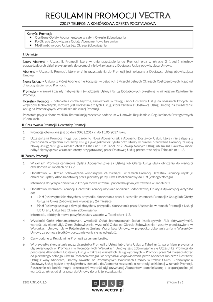 Z2017 TELEFONIA KOMÓRKOWA OFERTA PODSTAWOWA Korzyści Promocji: Obniżone Opłaty Abonamentowe w całym Okresie Zobowiązania Po Okresie Zobowiązania Opłata Abonamentowa bez zmian Możliwość wyboru Usług bez Okresu Zobowiązania I. Definicje Nowy Abonent – Uczestnik Promocji, który w dniu przystąpienia do Promocji oraz w okresie 3 (trzech) miesięcy poprzedzających dzień przystąpienia do promocji nie był związany z Dostawcą Usług obowiązującą Umową. Abonent – Uczestnik Promocji, który w dniu przystąpienia do Promocji jest związany z Dostawcą Usług obowiązującą Umową. Nowa Usługa – Usługa, z której Abonent nie korzystał w ostatnich 3 (trzech) pełnych Okresach Rozliczeniowych licząc od dnia przystąpienia do Promocji. Promocja – warunki i zasady nabywania i świadczenia Usług i Usług Dodatkowych określone w niniejszym Regulaminie Promocji. Uczestnik Promocji – pełnoletnia osoba fizyczna, zamieszkała w zasięgu sieci Dostawcy Usług na obszarach których, ze względów technicznych, możliwe jest korzystanie z tych Usług, która zawarła z Dostawcą Usług Umowę na świadczenie Usług na Promocyjnych Warunkach niniejszej Promocji. Pozostałe pojęcia pisane wielkimi literami mają znaczenie nadane im w Umowie, Regulaminie, Regulaminach Szczegółowych i Cennikach. II. Czas trwania Promocji i Uczestnicy Promocji 1. Promocja oferowana jest od dnia 30.01.2017 r. do 15.05.2017 roku. 2. Uczestnikami Promocji mogą być zarówno Nowi Abonenci jak i Abonenci Dostawcy Usług, którzy nie zalegają z płatnościami względem Dostawcy Usług z jakiegokolwiek tytułu oraz, którzy w okresie oferowania Promocji zakupią Nową Usługę/Usługi w ramach ofert z Tabeli nr 1 lub Tabeli nr 2. Zakup Nowych Usług lub zmiana Pakietów może odbyć się wyłącznie w ramach oferty przygotowanej przez Dostawcę Usług prezentowanej w Tabelach nr 1 i 2. III. Zasady Promocji 1. W ramach Promocji cennikowa Opłata Abonamentowa za Usługę lub Ofertę Usług ulega obniżeniu do wartości określonych w Tabelach nr 1 i 2. 2. Dodatkowo, w Okresie Zobowiązania wynoszącym 24 miesiące, w ramach Promocji Uczestnik Promocji uzyskuje obniżenie Opłaty Abonamentowej przez pierwszy pełny Okres Rozliczeniowy do 1 zł (jednego złotego). Informacja dotycząca obniżenia, o którym mowa w zdaniu poprzedzającym jest zawarta w Tabeli nr 1. 3. Dodatkowo, w ramach Promocji, Uczestnik Promocji uzyskuje obniżenie Jednorazowej Opłaty Aktywacyjnej karty SIM do: 19 zł (dziewiętnaście złotych) w przypadku skorzystania przez Uczestnika w ramach Promocji z Usługi lub Oferty Usług na Okres Zobowiązania wynoszący 24 miesiące. 99 zł (dziewięćdziesiąt dziewięć złotych) w przypadku skorzystania przez Uczestnika w ramach Promocji z Usługi lub Oferty Usług bez Okresu Zobowiązania. Informacje, o których mowa powyżej zostały zawarte w Tabelach nr 1-2. 4. Wysokość Opłat Abonamentowych, wysokość Opłat Jednorazowych (opłat instalacyjnych i/lub aktywacyjnych), wartość udzielonej Ulgi, Okres Zobowiązania, wysokość Opłat po Okresie Zobowiązania - zostały przedstawione w Warunkach Umowy lub w Potwierdzeniu Zmiany Warunków Umowy, w przypadku dokonania zmiany Warunków Umowy za pomocą środków porozumiewania się na odległość. 5. Ceny podane w Regulaminie Promocji są cenami brutto. 6. W przypadku skorzystania przez Uczestnika Promocji z Usługi lub oferty Usług z Tabeli nr 1, warunkiem przyznania ulg określonych w Promocji i w Promocyjnych Warunkach Umowy jest zobowiązanie się Uczestnika Promocji do pozostania Abonentem Dostawcy Usług w zakresie wszystkich Usług wybranych w Promocji przez 24 miesiące (licząc od pierwszego pełnego Okresu Rozliczeniowego). W przypadku wypowiedzenia przez Abonenta lub przez Dostawcę Usług z winy Abonenta, Umowy zawartej na Promocyjnych Warunkach Umowy w trakcie Okresu Zobowiązania Dostawcy Usług będzie przysługiwało w stosunku do Abonenta roszczenie o zwrot ulgi udzielonej w ramach Promocji. Roszczenie nie będzie mogło przekroczyć wartości ulgi przyznanej Abonentowi pomniejszonej o proporcjonalną jej wartość za okres od dnia zawarcia Umowy do dnia jej rozwiązania. Z2017_TK_OP_1.0 STRONA 1 z 2 Z2017 TELEFONIA KOMÓRKOWA OFERTA PODSTAWOWA 7. W przypadku gdy przed zawarciem Umowy na warunkach niniejszej Promocji Abonent posiadał ważną Umowę na świadczenie pozostałych Usług głównych ( tj. Telewizja, Internet stacjonarny, Telefon Stacjonarny, Internet Mobilny) warunkiem skorzystania z niniejszej Promocji jest posiadanie lub przedłużenie Umowy na posiadane Usługi na Warunkach Promocyjnych z Okresem Zobowiązania kończącym się nie wcześniej niż ten wynikający z niniejszej Promocji. 8. Wysokość roszczenia z tytułu jednostronnego rozwiązania umowy przez Abonenta lub przez Dostawcę Usług z winy Abonenta przed upływem terminu, na jaki Umowa została zawarta jest równa równowartości całej ulgi, pomnożonej przez liczbę pełnych miesięcy pozostałych do końca Okresu Zobowiązania, a następnie podzielonej przez liczbę miesięcy Okresu Zobowiązania Tabela nr 1: Telefonia Komórkowa – Okres Zobowiązania 24 miesiące Cennikowa Opłata Abonamentowa Promocyjna Opłata Abonamentowa w pierwszym pełnym Okresie Rozliczeniowym Promocyjna Opłata Abonamentowa do końca Okresu Zobowiązania Cennikowa Opłata za Aktywację karty SIM Promocyjna Opłata za Aktywację karty SIM Okres Zobowiązania Opłata Abonamentowa po Okresie Zobowiązania Plan Junior 25,00 zł 1 zł 15,00 zł 150,00 zł 19,00 24 m-ce 15,00 zł Plan Bez Limitu 5GB 45,00 zł 1 zł 29,90 zł 150,00 zł 19,00 24 m-ce 29,90 zł Plan Bez Limitu 10GB 55,00 zł 1 zł 39,90 zł 150,00 zł 19,00 24 m-ce 39,90 zł Plan Bez Limitu 15GB 65,00 zł 1 zł 49,90 zł 150,00 zł 19,00 24 m-ce 49,90 zł Plan Bez Limitu 25GB 75,00 zł 1 zł 59,90 zł 150,00 zł 19,00 24 m-ce 59,90 zł Plan Bez Limitu 100GB 120,00 zł 1 zł 99,90 zł 150,00 zł