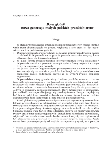 Krystyna PRZYBYLSKA* Born global – nowa generacja małych polskich przedsiębiorstw Wstęp W literaturze poświęconej internacjonalizacji przedsiębiorstw można spotkać wiele teorii objaśniających ten proces. Większość z nich stara się dać odpowiedzi na trzy podstawowe pytania: 1. Dlaczego przedsiębiorstwo wchodzi na ścieżkę umiędzynarodowienia swojej działalności? Odpowiedź na to pytanie pozwala zrozumieć motywy, które skłaniają firmy do internacjonalizacji. 2. W jakiej formie przedsiębiorstwo internacjonalizuje swoją działalność? Odpowiedź umożliwia poznanie strategii wyboru formy wejścia i rozwoju firmy na zagranicznych rynkach. 3. Na jakich rynkach zagranicznych przedsiębiorstwo działa? Odpowiedź koncentruje się na analizie czynników lokalizacji, które przedsiębiorstwo bierze pod uwagę, podejmując decyzje co do wyboru rynków ekspansji zagranicznej. Odpowiedzi na te trzy pytania zależą od wielu czynników, zarówno o charakterze mikroekonomicznym, a więc leżących po stronie przedsiębiorstwa podejmującego tak ważne decyzje z punktu widzenia jego rozwoju, jak i makroekonomiczne, zależne od otoczenia kraju macierzystego firmy i kraju goszczącego. Jednym z czynników mikroekonomicznych, który determinuje te odpowiedzi, jest wielkość internacjonalizującego się przedsiębiorstwa. Uwaga ta wydaje się być istotną, gdyż inne czynniki wpływają na motywy, formy i wybór rynków zagranicznych dużej korporacji, a inne małego przedsiębiorstwa. Przed globalizacją rynków można było zauważyć segmentację zakresu działalności przedsiębiorstw w zależności od ich wielkości, gdyż duże firmy konkurowały przede wszystkim na międzynarodowych rynkach, a małe – na lokalnych. Lecz powstanie globalnego konkurencyjnego otoczenia zmieniło ten obraz. Globalizacja usunęła wiele barier, które oddzielały krajowe od międzynarodowych rynków oraz obszar konkurencji małych i dużych firm. Niezależnie od wielkości, większość firm została zmuszona do konkurowania i stały się one regionalnymi lub globalnymi, aby przetrwać w nowym konkurencyjnym środowisku. Jeżeli nawet firma powstrzymuje się od wejścia na zagraniczny rynek, to z powodu * Autorka jest pracownikiem Katedry Mikroekonomii Uniwersytetu Ekonomicznego w Krakowie, e-mail: [email protected]. Artykuł wpłynął do redakcji w lipcu 2010 r. Born global – przedsiębiorstwa od początku globalne. 64 GOSPODARKA NARODOWA Nr 7-8/2010 działalności zagranicznych firm na jej krajowym rynku zmuszona jest stawić czoło konkurencji. Ten przymus konkurencji z zagranicznymi firmami w kraju i zagranicą spowodował, że mniejsze firmy przeszły nawet większe zmiany niż ich duzi konkurenci. Małe przedsiębiorstwa musiały dokonać restrukturyzacji organizacyjnej, produktowej i technologicznej, aby stworzyć warunki do rozwoju na zagranicznych rynkach i do sprostania panującej tam konkurencji. Często pozbawione są doświadczenia i wiedzy o zagranicznych rynkach, a brak potencjalnych wskazówek, dostarczonych przez badaczy zjawiska internacjonalizacji, nie ułatwia im wejścia i rozwoju na tych rynkach. Studiując literaturę przedmiotu, można zauważyć, że większość teorii międzynarodowego biznesu dotyczy internacjonalizacji dużych firm, przeważnie transnarodowych korporacji. Z wyjątkiem kilku modeli etapowej internacjonalizacji i ewentualnie koncepcji sieci biznesowych, inne teorie w niewielkim stopniu objaśniają to zjawisko w odniesieniu do małych przedsiębiorstw. Ale nawet etapowe podejście do procesu ekspansji zagranicznej nie wyjaśnia obecnie tego zjawiska, gdyż wiele małych i średnich firm internacjonalizuje swoją działalność niezgodnie z tą teorią. Zaobserwowano także coraz większy ich udział na międzynarodowych rynkach, przeważnie w formie eksportu, oraz coraz szybsze tempo ich umiędzynarodowienia. Tradycyjne a współczesne postrzeganie internacjonalizacji przedsiębiorstwa W literaturze ekonomicznej można zidentyfikować dwa tradycyjne obszary badań, które zaowocowały powstaniem następujących modeli etapowej internacjonalizacji: modelu uppsalskiego (Uppsala Model, U-M) [Johanson, Wiedersheim-Paul, 1975, s. 305-322], [Johanson, Vahlne, 1977, s. 23-32], [Luostarinen, Welch, 1988, s. 36], [Johanson, Vahlne, 1990, s. 11-24], [Johanson, Mattson, 1993] oraz modeli innowacyjnych (Innovation Model, I-M) [Bilkey, Tessar, 1997, s. 93-98], [Cavusgil, 1980, s. 273-281], [Reid, 1983, s. 45-56], [Czinkota, 1982], [Luostarinen, Hellman, 1994]. Oba ujęcia stwierdzają, że przedsiębiorstwa internacjonalizują się w sposób stopniowy, sekwencyjny, a więc wymagają długiego okresu, aby stać się międzynarodowymi, co jest spowodowane brakiem wiedzy o zagranicznych rynkach, niechęcią do podejmowania ryzyka i postrzeganiem wysokiego poziomu niepewności w działalności za granicą, szczególnie w krajach o dużym dystansie psychicznym. Model uppsalski traktuje internacjonalizację jako proces, w trakcie którego przedsiębiorstwo zdobywa coraz większą wiedzę o zagranicznych rynkach, co umożliwia mu przejście na kolejny, wyższy etap tego procesu, który związany jest z rosnącym zaangażowaniem się firmy. W modelu tym wyróżniono cztery etapy: • eksport sporadyczny, • eksport pośredni, • utworzenie zagranicznej filii handlowej (eksport bezpośredni), • utworzenie zagranicznej filii produkcyjnej. Krystyna Przybylska, Born global – nowa generacja małych polskich przedsiębiorstw 65 Sekwencyjność działania firmy, widoczną w jej przechodzeniu do kolejnego, bardziej rozwiniętego etapu, zaobserwowano także w przypadku podejmowania operacji w nowych krajach. Obszarem szczególnego zainteresowania był fakt, że kolejność czasowa tych działań jest powiązana z dystansem psychicznym dzielącym kraj macierzysty od krajów goszczących. Dystans psychiczny został zdefiniowany jako suma czynników utrudniających prz