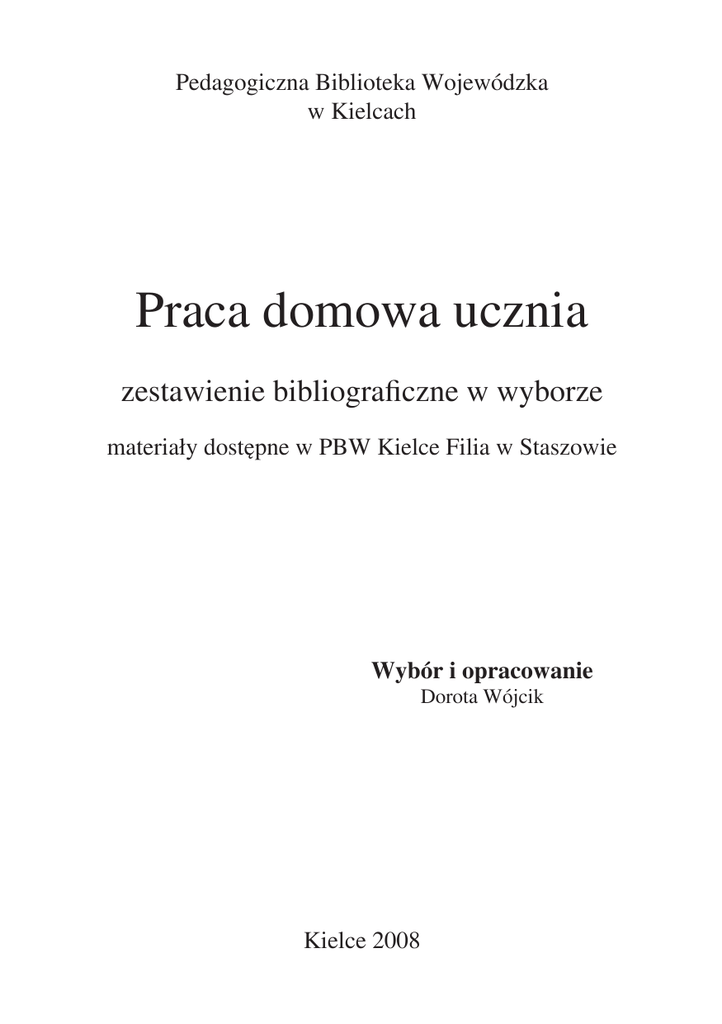 Pedagogiczna Biblioteka Wojewódzka w Kielcach Praca domowa ucznia zestawienie bibliograficzne w wyborze materiały dostępne w PBW Kielce Filia w Staszowie Wybór i opracowanie Dorota Wójcik Kielce 2008 2 Wstęp Zestawienie zostało opracowane w oparciu o księgozbiór PBW w Kielcach Filia w Staszowie. Zawiera materiały ogólne oraz szczegółową metodykę pracy domowej na poszczególnych przedmiotach i etapach nauczania. Przeznaczone jest dla nauczycieli i rodziców, którzy pomagają w odrabianiu zadań domowych. Wydawnictwa zwarte 1. KUJAWIŃSKI, Jerzy : Wdrażanie uczniów do samokształcenia indywidualnego i nieindywidualnego / Jerzy Kujawiński. – Poznań : Wydawnictwo Naukowe Uniwersytetu im. Adama Mickiewicza, 2000 Syg. 23796 Wypożyczalnia 2. KUJAWIŃSKI, Jerzy : Doskonalenie pracy lekcyjno - domowej w klasach początkowych / Jerzy Kujawiński. – Warszawa : Wydawnictwa Szkolne i Pedagogiczne, 1990 Syg. 16905 Wypożyczalnia 3. ŁUKAWSKA, Anna : Dydaktyczne przyczyny trudności w nauce domowej : na podstawie badań V i VIII klas szkół podstawowych / Anna Łukawska. – Warszawa : Państwowy Zakład Wydawnictw Szkolnych, 1973 Syg. 6211, 6212 Wypożyczalnia 4. RUDNIAŃSKI, Jarosław : Metody pracy umysłowej ucznia / Jarosław Rudniański. – Warszawa : Państwowy Zakład Wydawnictw Szkolnych, 1967 Syg. 3589 Wypożyczalnia 5. RUDNIAŃSKI, Jarosław : Uczeń w domu / Jarosłąw Rudniański. – Warszawa : Nasza Księgarnia, 1968 Syg. 3910, 3854 Wypożyczalnia 3 6. WUJEK, Tadeusz : Praca domowa i czynny wypoczynek ucznia / Tadeusz Wujek. – Warszawa : Państwowy Zakład Wydawnictw Szkolnych, 1969 Syg. 4563 Wypożyczalnia 7. ZBOROWSKI, Jan : Nauka domowa ucznia szkoły średniej / Jan Zborowski. – Warszawa : Państwowe Wydawnictwo Naukowe, 1972 Syg. 5632 Wypożyczalnia 8. ZBOROWSKI, Jan : Praca domowa ucznia szkoły podstawowej / Jan Zborowski. – Warszawa : Państwowy Zakład Wydawnictw Szkolnych, 1955 Syg. 113, 114, 257, 258 Wypożyczalnia 9. ZBOROWSKI, Jan : Proces nauki domowej ucznia / Jan Zborowski. – Warszawa : Państwowy Zakład Wydawnictw Szkolnych, 1961 Syg. 1815, 1816 Wypożyczalnia Wydawnictwa ciągłe 10. BENEDYK, Anna; Ocenianie pracy domowej / Anna Benedyk // „Nowe w Szkole”. – 2001/2002, nr 3, s. 7-12 Czytelnia 11. DROZD, Ewa : Zadawanie do domu / Ewa Drozd // „Edukacja i Dialog”. – 1999, nr 9, s. 58-63 Czytelnia 12. DUDZIŃSKA, Bogumiła : Praca domowa w procesie edukacji / Bogumiła Dudzińska // „Problemy Opiekuńczo-Wychowawcze”. – 2003, nr 10, s. 37-40 Czytelnia 13. GAJDA, Marek : Domowe zadania doświadczalne / Marek Gajda // „Fizyka w Szkole”. – 2003, nr 3, s. 161-165 Czytelnia 4 14. GAJEWSKA- GRELAK, Justyna : Traktowane po macoszemu / Justyna Gajewska- Grelak // „Matematyka”. – 2004, nr 1, s. 23 Czytelnia 15. GOLONKA, Elżbieta : Prace międzylekcyjne ucznia wiejskiego // „Nauczanie Początkowe : kształcenie zintegrowane”. – 1999/2000, nr 3, s. 95-103 Czytelnia 16. HEJDUK, Hanna : Drzewo genealogiczne bogów starożytnych / Hanna Hejduk // „Polonistyka”. – 1997, nr 2, s. 126 Czytelnia 17. JAKOWICKA, Maria : Organizacja pracy własnej uczniów jako problem wychowawczy w klasach początkowych // „Życie Szkoły”. – 1986, nr 12, s. 659-663 Czytelnia 18. KACZMAREK, Renata : Praca domowa – kula u nogi z edukacyjnego „betonu” // „Wychowanie na Co Dzień”. – 2006, nr 6, s. 21-22 Czytelnia 19. KILIANEK, Józef : Praca domowa uczniów / Józef Kilianek, Halina Czajkowska-Kilianek // „Nowa Szkoła”. – 1993, nr 2, s. 94-99 Czytelnia 20. KORDZIŃSKI, Jarosław : Nauka domowa bez kontrowersji / Jarosław Kordziński // „Życie Szkoły”. – 1997, nr 2, s. 120-121 Czytelnia 21. KORDZIŃSKI, Jarosław : Szkoła sukcesu / Jarosław Kordziński // „Nowa Szkoła”. – 1997, nr 2, s. 59-61 Czytelnia 5 22. KORDZIŃSKI, Jarosław : Szkoła sukcesu // „Nowa Szkoła”. – 1997, nr 2, s. 59-61 Czytelnia 23. KRUSZKO, Krzysztof : Nauka dodatkowa uczniów klas początkowych // „Życie Szkoły”. – 1995, nr 9, s. 522-526 Czytelnia 24. KRUSZKO, Krzysztof : Samodzielność uczniów klas początkowych w nauce domowej / Krzysztof Kruszko // „Życie Szkoły”. – 1996, nr 9, s. 528-530 Czytelnia 25. LENARD, Stanisław : O nowej formie pracy domowej w nauczaniu historii w szkole średniej / Stanisław Lenard // „Wiadomości Historyczne”. – 1996, nr 5, s. 290-294 Czytelnia 26. MICHALSKI, Jarosław : Bryk // „Nowa Szkoła”. – 1998, nr 5, s. 26-27 Czytelnia 27. MICHALSKI, Jarosław : Praca domowa / Jarosław Michalski // „Nowa Szkoła”. – 1997, nr 2, s. 27-28 Czytelnia 28. MICHALSKI, Jarosław : Przepisywanie / Jarosław Michalski // „Nowa Szkoła”. – 2000, nr 4, s. 27 Czytelnia 29. MIJAKOWSKA, Katarzyna : Azja – propozycja opracowania w szkole podstawowej / Katarzyna Mijakowska // „Geografia w Szkole”. – 1995, nr 1, s. 35-39 Czytelnia 6 30. MORDAL, Małgorzata : Ożywiać wypowiedzi / Małgorzata Mordal // „Polonistyka”. – 1995, nr 8, s. 573-574 Czytelnia 31. NOWAK, Ewa : Praca domowa ucznia w toku kształcenia polonistycznego / Ewa Nowak // „Język Polski w Szkole : dla klas IV-VIII”. – 1995/96, z. 6, s. 31-47 Czytelnia 32. PIEGDOŃ, Alicja : W sprawie zadań domowych / Alicja Piegdoń // „Geografia w Szkole”. – 1995, nr 5, s. 284-286 Czytelnia 33. PIERZCHAŁA, MARIA : Przewodnictwo elektryczne ciał stałych i cieczy: praca eksperymentalno - badawcza proponowana uczniowi gimnazjum do wykonania w domu / Maria Pierzchała // „Wychowanie na co Dzień. – 2002, nr 7-8, dod. "Wkładka Metodyczna", s. X-XII Czytelnia 34. PUŚLECKI, Władysław : Integracja a wspieranie rozwoju ucznia / Włądysłąw Puślecki // „Życie Szkoły”. – 2001, [nr] 10, s. 579-587 Czytelnia 35. SAWIŃSKI, Julian Piotr : Praca domowa z zakresu środowiska społeczno - przyrodniczego w klasie III Julian Piotr Sawiński // „Życie Szkoły”. – 1988, nr 6, s. 37