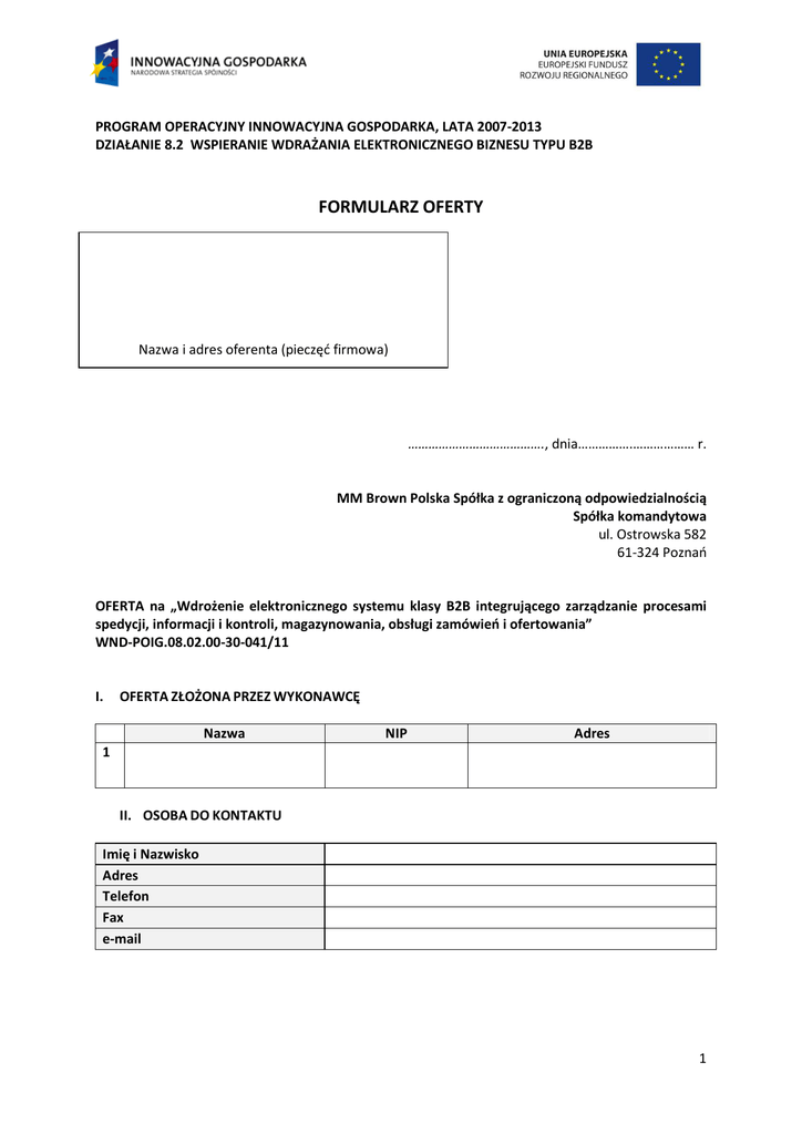 PROGRAM OPERACYJNY INNOWACYJNA GOSPODARKA, LATA 2007-2013 DZIAŁANIE 8.2 WSPIERANIE WDRAŻANIA ELEKTRONICZNEGO BIZNESU TYPU B2B FORMULARZ OFERTY Nazwa i adres oferenta (pieczęć firmowa) …………………………………., dnia…………….……………… r. MM Brown Polska Spółka z ograniczoną odpowiedzialnością Spółka komandytowa ul. Ostrowska 582 61-324 Poznań OFERTA na „Wdrożenie elektronicznego systemu klasy B2B integrującego zarządzanie procesami spedycji, informacji i kontroli, magazynowania, obsługi zamówień i ofertowania” WND-POIG.08.02.00-30-041/11 I. OFERTA ZŁOŻONA PRZEZ WYKONAWCĘ Nazwa NIP Adres 1 II. OSOBA DO KONTAKTU Imię i Nazwisko Adres Telefon Fax e-mail 1 III. TREŚĆ OFERTY: W odpowiedzi na ogłoszenie o postępowaniu prowadzonym w trybie konkurencyjnym – zapytanie ofertowe z 26.10.2011 r., oświadczamy, że: 1. oferujemy wykonanie zamówienia za całkowitą cenę netto: …………………………………………….. (słownie: ………………………………………………………………………………………..………………………………), zgodnie z poniższym kosztorysem: L.p. 1 2 3 4 5 Nazwa Usługi doradcze o charakterze informatycznym związane z projektem świadczone przez doradców zewnętrznych Kompletna stacja robocza obejmująca: komputer stacjonarny klasy PC 4 MB, procesor typu Intel Core i3 lub równoważny, system operacyjny Microsoft Windows Professional lub równoważny, monitor, drukarkę laserową Serwer (urządzenie) wraz z osprzętem obejmującym: pamięć operacyjną 8 MB, pamięć magazynową 2 x 200 GB, procesor typu Intel Xenon lub równoważny, monitor Oprogramowanie dedykowane do automatyzacji wymiany informacji handlowej między współpracującymi przedsiębiorstwami Szkolenie specjalistyczne niezbędne do wdrożenia rozwiązania elektronicznego biznesu typu B2B Jednostka miary Liczba jednostek (1) roboczogodzina 250 sztuka 1 sztuka 1 sztuka 1 dzień szkoleniowy 5 Stawka za jednostkę w zł (2) Całkowita cena w zł (3 = 1 x 2) Razem Informacja o wysokości podatku od towarów i usług VAT: ………………………………………………………………………………………………………………………………………………………… Informacja o terminie ważności oferty: ……………………………………………………………………., nie krócej niż 60 dni. 2 Część opisowa oferty (w tym informacje umożliwiające ocenę Oferty w odniesieniu do Kryteriów oceny ofert): …………………………………………………………………………………………………………………………………………………………… ……………………………………………………………………………………………………………………………………………………………. Oświadczenia oferenta: • Zapoznaliśmy się ze specyfikacją przedmiotu zamówienia i nie wnosimy do niej zastrzeżeń oraz zdobyliśmy informacje niezbędne do właściwego wykonania zamówienia. • Jesteśmy związani niniejszą ofertą na czas wskazany w specyfikacji przedmiotu zamówienia. • Zawarte w specyfikacji przedmiotu zamówienia warunki zostały przez nas zaakceptowane i zobowiązujemy się – w przypadku wybrania naszej oferty – do zawarcia umowy. ....................................................................................... (imię i nazwisko, stanowisko osoby reprezentującej wykonawcę, podpis) Do oferty zostały dołączone następujące załączniki: 1) Formularz oferty 2) ……… 3 Zapytanie ofertowe z dnia 26.09.2011 Kryteria oceny ofert – metodologia przyznawania punktów W kryterium „Cena” najwyższą liczbę punktów (50) otrzyma oferta zawierająca najniższą cenę PLN, a każda następna odpowiednio zgodnie ze wzorem: cena oferty najniżej x 50 Liczba punktów oferty = cena oferty ocenianej W kryterium „Czas realizacji” zostaną przyznane punkty w skali od 0 do 40, przy czym porównanie ofert nastąpi na podstawie części opisowej oferty. Skala ocen: 0 pkt – brak danych umożliwiających ocenę kryterium, 1 pkt – oferta najmniej korzystna (wykraczająca poza dookreślony w przedmiocie zamówienia sugerowany okres realizacji), 40 pkt – oferta najbardziej korzystna (mieszcząca się w dookreślonym w przedmiocie zamówienia sugerowanym okresie realizacji). W przypadku równej oceny przyznaje się identyczną liczbę punktów, równając do oceny najwyższej. W kryterium „Doświadczenie i referencje”: zastosowanie przedmiotowego kryterium nastąpi w przypadku, kiedy złożona oferta zawierać będzie wycenę przeprowadzenia szkoleń specjalistycznych niezbędnych do wdrożenia rozwiązania elektronicznego typu B2B (Poz. 4). W takim przypadku przewidziano, że zostaną przyznane punkty w skali od 0 do 10, przy czym porównanie ofert nastąpi na podstawie części opisowej oferty. Skala ocen: 0 pkt – brak danych umożliwiających ocenę kryterium, 10 pkt – wykazanie doświadczenia i referencji (minimum jeden projekt w zakresie rozwiązań ITC, B2B lub równoważnych). W pozostałych przypadkach zaplanowano zasadę, zgodnie z którą dla pozycji: zakup usług doradczych o charakterze informatycznym związanych z projektem świadczonych przez doradców zewnętrznych: 250 roboczogodzin (Poz. 1); zakup środków trwałych: kompletna stacja robocza (1 szt.) obejmująca: komputer stacjonarny klasy PC 4 MB, procesor typu Intel Core i3 lub równoważny, system operacyjny Microsoft Windows Professional lub równoważny, monitor, drukarkę laserową (Poz. 2a); serwer (urządzenie), 1 szt. – urządzenie wraz z osprzętem obejmującym: pamięć operacyjną 8 MB, pamięć magazynową 2 x 200 GB, procesor typu Intel Xenon lub równoważny, monitor (Poz. 2b); nabycie oprogramowania dedykowanego do automatyzacji wymiany informacji handlowej między współpra