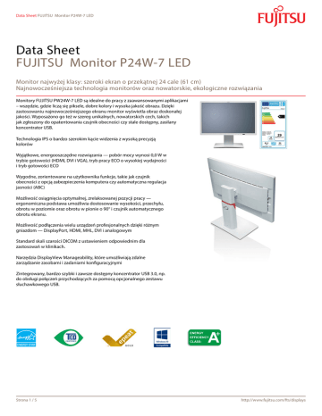 Data Sheet FUJITSU Monitor P24W-7 LED Data Sheet FUJITSU Monitor P24W-7 LED Monitor najwyżej klasy: szeroki ekran o przekątnej 24 cale (61 cm) Najnowocześniejsza technologia monitorów oraz nowatorskie, ekologiczne rozwiązania Monitory FUJITSU PW24W-7 LED są idealne do pracy z zaawansowanymi aplikacjami – wszędzie, gdzie liczą się piksele, dobre kolory i wysoka jakość obrazu. Dzięki zastosowaniu najnowocześniejszego ekranu monitor wyświetla obraz doskonałej jakości. Wyposażono go też w szereg unikalnych, nowatorskich cech, takich jak zgłoszony do opatentowania czujnik obecności czy stale dostępny, zasilany koncentrator USB. Technologia IPS o bardzo szerokim kącie widzenia z wysoką precyzją kolorów Wyjątkowe, energooszczędne rozwiązania — pobór mocy wynosi 0,0 W w trybie gotowości (HDMI, DVI i VGA), tryb pracy ECO o wysokiej wydajności i tryb gotowości ECO Wygodne, zorientowane na użytkownika funkcje, takie jak czujnik obecności z opcją zabezpieczenia komputera czy automatyczna regulacja jasności (ABC) Możliwość osiągnięcia optymalnej, zrelaksowanej pozycji pracy — ergonomiczna podstawa umożliwia dostosowanie wysokości, przechyłu, obrotu w poziomie oraz obrotu w pionie o 90° i czujnik automatycznego obrotu ekranu. Możliwość podłączenia wielu urządzeń profesjonalnych dzięki różnym gniazdom — DisplayPort, HDMI, MHL, DVI i analogowym Standard skali szarości DICOM z ustawieniem odpowiednim dla zastosowań w klinikach. Narzędzia DisplayView Manageability, które umożliwiają zdalne zarządzanie zasobami i zadaniami konfiguracyjnymi Zintegrowany, bardzo szybki i zawsze dostępny koncentrator USB 3.0, np. do obsługi połączeń przychodzących za pomocą opcjonalnego zestawu słuchawkowego USB. Strona 1 / 5 http://www.fujitsu.com/fts/displays Data Sheet FUJITSU Monitor P24W-7 LED Szczegóły techniczne Cechy specjalne Technologia przełącznika na pokładzie samolotu (IPS), Czujnik obecności z rozwiązaniem zapewniającym bezpieczeństwo komputera PC, Funkcja wyświetlania w standardzie skali szarości DICOM z odpowiednim ustawieniem gamma, Średnia wierność odwzorowania barw DeltaE<2, 0 W w trybie oszczędzania energii (z DVI i VGA), Podstawa 4-w-1, Przycisk Eco, Automatyczna regulacja jasności (ABC), Automatyczny obrót, Zawsze dostępne USB (w trybie działania i oczekiwania), Pakiet DisplayView™ IT, Eksploatacja 24/7, Wbudowane głośniki Ergonomiczny stojak Podstawa Zakres regulacji wysokości Wysokość obrazu nad biurkiem (min.) Obrót do orientacji pionowej Kąt przechylenia Kąt obrotu Wydajność obrazu Wyświetlacz i podświetlenie Konserwacja powierzchni ekranu Kontrast - typowy Kontrast - zaawansowany Typowy czas reakcji szary do szarego Kąt widzenia (poz./pion.) - typowy Wierność kolorów Wysoki gamut kolorów - typowy Jasność - typowa Wielkości i rozdzielczość Proporcje Przekątna Rozdzielczość (natywna) Rozdzielczość (interpolacja) Wielkość obrazu Rozstaw pikseli Częstotliwości Poziomo Pionowo Łączność DisplayPort HDMI DVI VGA/D-SUB Wyjście sygnału audio Wejście sygnału audio Wyjście audio USB pobieranie Przesyłanie USB Menu łatwość obsługi Języki Jasność / kontrast Tryb Kolor Regulacja obrazu Audio Strona 2 / 5 Podstawa 4-w-1 130 mm 45 mm 90° (Automatyczny obrót) -5° / +35° 340° In-Plane Switching (IPS) technology/LED Twarda powłoka 3H, Przeciwodblaskowa 1000:1 20,000,000:1 5 ms (in Video mode) 178°/178° CR10:1 16,7 miliona kolorów Przestrzeń kolorów 77% NTSC / 100% sRGB 300 cd/m² 16:10 61 cm (24 cale) 1920 x 1200 pikseli 1920 x 1080 pikseli, 1680 x 1050 pikseli, 1600 x 1200 pikseli, 1400 x 900 pikseli, 1280 x 800 pikseli, 1280 x 768 pikseli, 1024 x 768 pikseli, 800 x 600 pikseli, 640 x 480 pikseli 518 x 324 mm 0.270 mm 30 - 82 kHz 48 - 76 Hz 1 x DisplayPort 1.2 1 x HDMI 1,4 z obsługą MHL 2.0 1 x DVI-D (HDCP) 1 x D-SUB Stereofoniczne gniazdo słuchawkowe jack 3,5 mm Stereofoniczne gniazdo jack 3,5 mm 2 x 1.5 W 4 x USB 3.0 1 x USB Arabski, Czeski, Duński, Holenderski, Angielski, Fiński, Francuski, Niemiecki, Włoski, Norweski, Polski, Portugalski, Rosyjski, Hiszpański, Szwedzki, Turecki, Japoński, Chiński uproszczony, Chiński tradycyjny Jasność, Kontrast, Poziom czerni, Automatyczna regulacja jasności, Poziom automatyczny Optymalny, Zdjęcie, Wideo, Biuro 7500K, 6500K, Natywny, sRGB, Kolor niestandardowy (R,G,B) Zegar, Faza, Pozycja w poziomie, Pozycja w pionie, Rozszerzenie, Nasycenie, Ostrość Wyciszenie, Głośność http://www.fujitsu.com/fts/displays Data Sheet FUJITSU Monitor P24W-7 LED Informacje Instalacja Zużycie energii (typowe) Programowy wyłącznik Tryb oszczędzania energii 0 W Wyłącznik sprzętowy Tryb oszczędzania energii Działanie z ustawieniami EPA Maksymalna jasność podczas pracy Zasilacz Uwagi dotyczące zasilania Wartości elektryczne Zakres napięcia znamionowego Zakres częstotliwości znamionowej Klasa ochrony Dział zgodności z przepisami Europa Model Niemcy Rosja Stany Zjednoczone/Kanada Australia/Nowa Zelandia Japonia Korea Południowa Argentyna Singapur Tajwan Chiny Arabia Saudyjska Globalne Łącze do zgodności Jakość i niezawodność MTBF (demonstrowany) Wymiary / waga / informacje środowiskowe Wymiary bez podstawy (szer. x gł. x wys.) Wymiary z podstawą (szer. x gł. x wys.) Waga (zapakowane) Waga (nierozpakowane) Waga (tylko monitor) Temperatura otoczenia podczas pracy Różne Różne Kolor Strona 3 / 5 Nazwa modelu, Numer seryjny, Rozdzielczość/tryb, Wejście sygnału Wybór trybu wprowadzania, Język, DDC/CI, Czas wyświetlania OSD, Wstępne ustawienie fabryczne 0.22 (with DisplayPort) W 0.0 W 0.0 W 0.31 (with DisplayPort) W 17.84 W 26 W zintegrowana Głośniki wył., bez USB, 0 W w trybie czuwania z HDMI, DVI i VGA; 100 V - 240 V 50 Hz - 60 Hz 1 Klasa wydajności energetycznej: A+, Certyfikacja CE według dyrektywy EC 2004/108/EEC, EN 60950, RoHS, WEEE, Deklaracja ekologiczna IT P24W-7 TÜV GS EAC FCC, 
