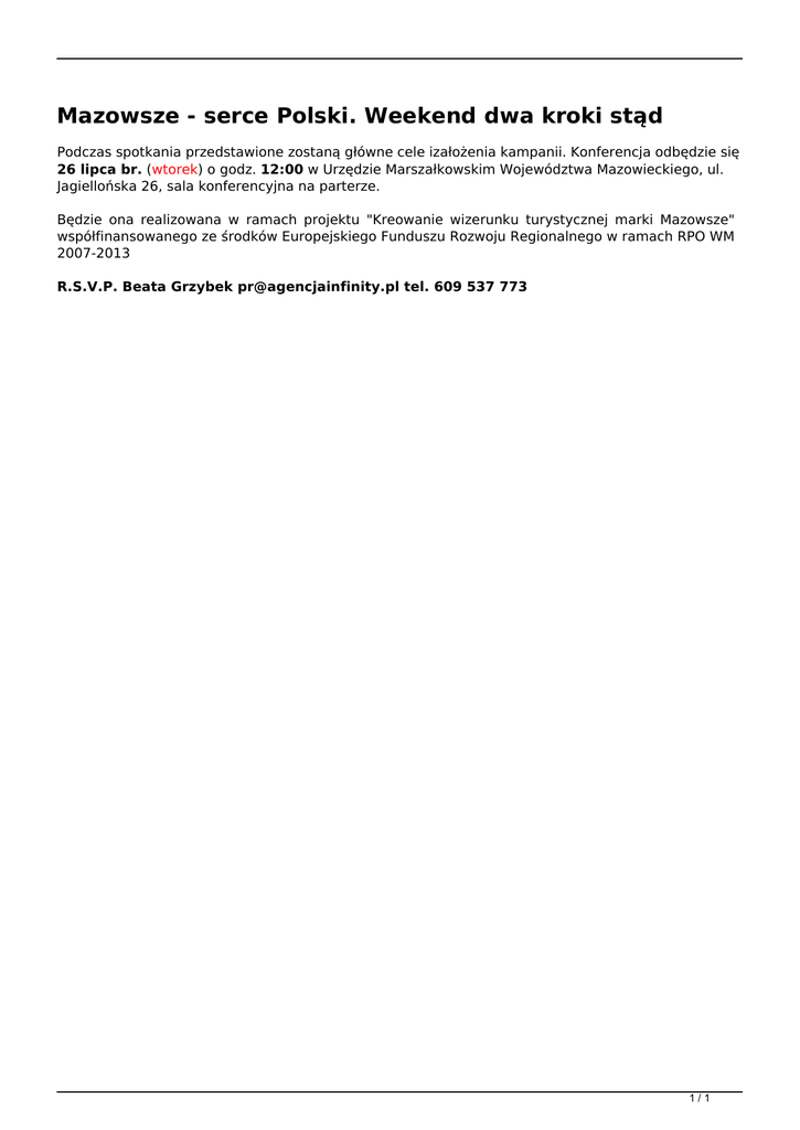 Mazowsze - serce Polski. Weekend dwa kroki stąd Podczas spotkania przedstawione zostaną główne cele izałożenia kampanii. Konferencja odbędzie się 26 lipca br. (wtorek) o godz. 12:00 w Urzędzie Marszałkowskim Województwa Mazowieckiego, ul. Jagiellońska 26, sala konferencyjna na parterze. Będzie ona realizowana w ramach projektu "Kreowanie wizerunku turystycznej marki Mazowsze" współfinansowanego ze środków Europejskiego Funduszu Rozwoju Regionalnego w ramach RPO WM 2007-2013 R.S.V.P. Beata Grzybek [email protected] tel. 609 537 773 1/1