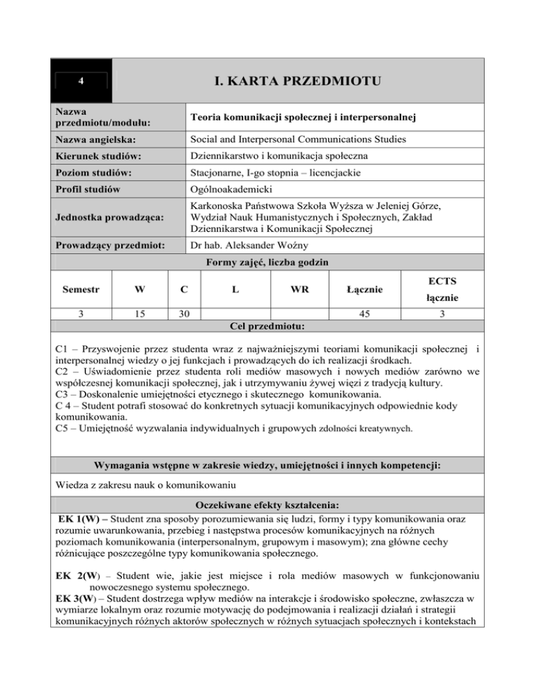 I. KARTA PRZEDMIOTU 4 Nazwa przedmiotu/modułu: Teoria komunikacji społecznej i interpersonalnej Nazwa angielska: Social and Interpersonal Communications Studies Kierunek studiów: Dziennikarstwo i komunikacja społeczna Poziom studiów: Stacjonarne, I-go stopnia – licencjackie Profil studiów Ogólnoakademicki Jednostka prowadząca: Karkonoska Państwowa Szkoła WyŜsza w Jeleniej Górze, Wydział Nauk Humanistycznych i Społecznych, Zakład Dziennikarstwa i Komunikacji Społecznej Prowadzący przedmiot: Dr hab. Aleksander Woźny Formy zajęć, liczba godzin Semestr W C 3 15 30 L WR Łącznie 45 ECTS łącznie 3 Cel przedmiotu: C1 – Przyswojenie przez studenta wraz z najwaŜniejszymi teoriami komunikacji społecznej i interpersonalnej wiedzy o jej funkcjach i prowadzących do ich realizacji środkach. C2 – Uświadomienie przez studenta roli mediów masowych i nowych mediów zarówno we współczesnej komunikacji społecznej, jak i utrzymywaniu Ŝywej więzi z tradycją kultury. C3 – Doskonalenie umiejętności etycznego i skutecznego komunikowania. C 4 – Student potrafi stosować do konkretnych sytuacji komunikacyjnych odpowiednie kody komunikowania. C5 – Umiejętność wyzwalania indywidualnych i grupowych zdolności kreatywnych. Wymagania wstępne w zakresie wiedzy, umiejętności i innych kompetencji: Wiedza z zakresu nauk o komunikowaniu Oczekiwane efekty kształcenia: EK 1(W) – Student zna sposoby porozumiewania się ludzi, formy i typy komunikowania oraz rozumie uwarunkowania, przebieg i następstwa procesów komunikacyjnych na róŜnych poziomach komunikowania (interpersonalnym, grupowym i masowym); zna główne cechy róŜnicujące poszczególne typy komunikowania społecznego. EK 2(W) – Student wie, jakie jest miejsce i rola mediów masowych w funkcjonowaniu nowoczesnego systemu społecznego. EK 3(W) – Student dostrzega wpływ mediów na interakcje i środowisko społeczne, zwłaszcza w wymiarze lokalnym oraz rozumie motywację do podejmowania i realizacji działań i strategii komunikacyjnych róŜnych aktorów społecznych w róŜnych sytuacjach społecznych i kontekstach medialnych; rozumie kryteria oceny etycznej działań medialnych. EK 4 (Ćw) – Potrafi realizować zadania zespołowe i koncepcyjne wymagające współpracy. Jest przedsiębiorczy, kreatywny i świadomy najnowszych trendów w dziedzinie komunikacji. EK 5(Ćw) – Jest świadomy procesów kształtowania więzi społecznych poprzez media i zagroŜeń związanych z wykorzystywaniem zwłaszcza nowych mediów, ma świadomość odpowiedzialności za zachowanie dziedzictwa kultury regionu, kraju, Europy. EK 6 (Ćw) – Jest dobrze przygotowany do efektywnego i zgodnego z zasadami etyki posługiwania się komunikacją językową i pozajęzykową , jest świadomy wyboru stosownych strategii komunikacyjnych i ich konsekwencji etycznych i prawnych . Treści programowe: Forma zajęć: ćwiczenia Ćw. 1,2 Normy i odchylenia w komunikacji społecznej i interpersonalnej Ćw. 3,4 Paradygmaty i syntagmy – procesy transpozycji w reklamie Ćw. 5,6 Ćw. 7,8 Ćw. 9,10 Ćw. 11,12 Ćw. 13,14 Ćw.15,16 Ćw.17,18 Ćw.19,20 Ćw.21,22 Ćw.23,24 Ćw.25,26 Ćw.27,28 Ćw. 29,30 Prezentacja opracowanych przez studentów sloganów reklamowych i ich wizualizacji, uwzględniających procesy transpozycji Rola kodów rozwiniętych i ograniczonych w komunikacji masowej Rola kodów wąskich i szerokich w komunikacji masowej Systemy preferowane i alternatywne (podporządkowane i radyklane) jako kody kultury popularnej Ludyczna koncepcja komunikacji masowej Charakterystyka wydarzenia medialnego. Uniwersalne scenariusze medialne Koronacji, Konkwisty i Konkursu – indywidualne analizy programów informacyjnych. Syntaksa, semantyka i pragmatyka wydarzenia medialnego Media masowe a przemoc i terroryzm Teorie dotyczące terroryzmu w globalnej wiosce Koncepcja terrowizji. Nowe media a terroryzm Komunikacja ułomna, zdegradowana (manipulacja, propaganda, czarny PR) Medialna kultura upokarzania a etyka – próba podsumowania Suma godzin Forma zajęć: wykład w. 1,2 w. 3,4 w. 5,6 w. 7.8 w. 8,10 w. 11,12 w. 13,14 Wprowadzenie (tematyka, warunki zaliczenia, literatura), komunikowanie jako interakcja: definicje, cechy i elementy; poziomy komunikowania w systemie społecznym Sposoby porozumiewania się ludzi; komunikacja interpersonalna formy i typy komunikowania; Komunikacja niewerbalna – jej funkcje w komunikowaniu politycznym Media w systemie komunikowania masowego Nurt krytyczny w komunikowaniu masowym Rola kodów dominujących, podporządkowanych i negocjowanych w komunikowaniu społecznym Semiotyczne koncepcje komunikowania masowego Liczba godzin 2 2 2 2 2 2 2 2 2 2 2 2 2 2 2 30 Liczba godzin 2 2 2 2 2 2 2 w. 15 Podsumowanie zajęć w aspekcie wiedzy 1 15 Suma godzin Narzędzia dydaktyczne: 1. Podręczniki i artykuły w publikacjach zbiorowych 2. Prezentacje materiałów DVD (pochodzących z bogatego archiwum prowadzącego). 3. Wybrane wg wskazań prowadzącego zasoby internetu Metody dydaktyczne Wykład, prezentacja multimedialna do wykładu , dyskusja, metoda sytuacyjna, metoda problemowa F1 P1, P2 P3 Sposoby oceny (F – formująca, P – podsumowująca) Indywidualne wypowiedzi ustne Grupowe (realizowane w 3-osobowych zespołach) i indywidualne projekty Egzamin pisemny ObciąŜenie pracą studenta Łączna i średnia liczba godzin Forma aktywności na zrealizowanie aktywności Godziny kontaktowe z nauczycielem (w trakcie 45 zajęć) Godziny kontaktowe z nauczycielem (w trakcie 18 konsultacji, średnio na studenta) Opracowanie projektów i przygotowanie się do zajęć 27 SUMA 90 SUMARYCZNA LICZBA PUNKTÓW 3 ECTS ECTS DLA PRZEDMIOTU Literatura podstawowa i uzupełniająca J. Fiske, Wprowadzenie do badań nad komunikowaniem, tłum. A, Gierczak, Wrocław 1998 B. Dobek-Ostrowska, Podstawy komunikowania społecznego, Wrocław 1999. D. Dayan, E. Katz, Wydarzenia medialne. Historia transmitowana na Ŝywo, przeł. A. Sawisz, wstęp