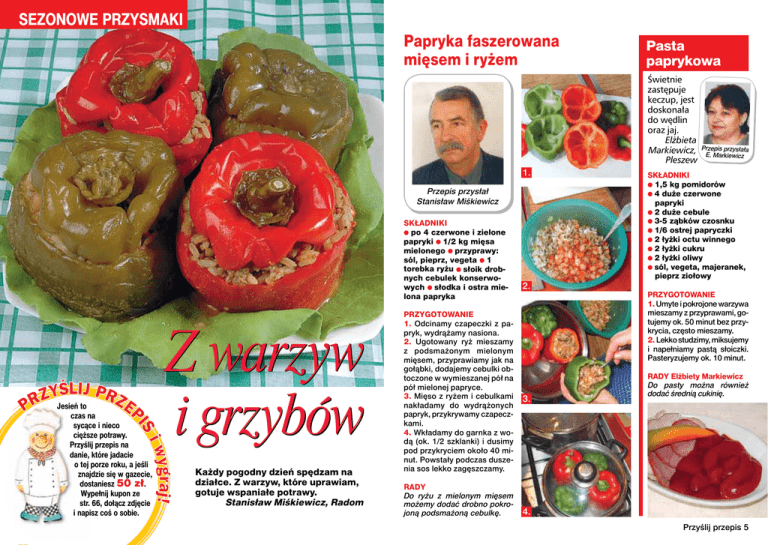 SEZONOWE PRZYSMAKI Papryka faszerowana mięsem i ryżem Pasta paprykowa Świetnie zastępuje keczup, jest doskonała do wędlin oraz jaj. Elżbieta Markiewicz, Pleszew 1. Przepis przysłał Stanisław Miśkiewicz SKŁADNIKI ● po 4 czerwone i zielone papryki ● 1/2 kg mięsa mielonego ● przyprawy: sól, pieprz, vegeta ● 1 torebka ryżu ● słoik drobnych cebulek konserwowych ● słodka i ostra mielona papryka Jesień to czas na sycące i nieco cięższe potrawy. Przyślij przepis na danie, które jadacie o tej porze roku, a jeśli znajdzie się w gazecie, dostaniesz 50 zł. Wypełnij kupon ze str. 66, dołącz zdjęcie i napisz coś o sobie. Z warzyw i grzybów Każdy pogodny dzień spędzam na działce. Z warzyw, które uprawiam, gotuje wspaniałe potrawy. Stanisław Miśkiewicz, Radom PRZYGOTOWANIE 1. Odcinamy czapeczki z papryk, wydrążamy nasiona. 2. Ugotowany ryż mieszamy z podsmażonym mielonym mięsem, przyprawiamy jak na gołąbki, dodajemy cebulki obtoczone w wymieszanej pół na pół mielonej papryce. 3. Mięso z ryżem i cebulkami nakładamy do wydrążonych papryk, przykrywamy czapeczkami. 4. Wkładamy do garnka z wodą (ok. 1/2 szklanki) i dusimy pod przykryciem około 40 minut. Powstały podczas duszenia sos lekko zagęszczamy. RADY Do ryżu z mielonym mięsem możemy dodać drobno pokrojoną podsmażoną cebulkę. 2. 3. Przepis przysłała E. Markiewicz SKŁADNIKI ● 1,5 kg pomidorów ● 4 duże czerwone papryki ● 2 duże cebule ● 3-5 ząbków czosnku ● 1/6 ostrej papryczki ● 2 łyżki octu winnego ● 2 łyżki cukru ● 2 łyżki oliwy ● sól, vegeta, majeranek, pieprz ziołowy PRZYGOTOWANIE 1. Umyte i pokrojone warzywa mieszamy z przyprawami, gotujemy ok. 50 minut bez przykrycia, często mieszamy. 2. Lekko studzimy, miksujemy i napełniamy pastą słoiczki. Pasteryzujemy ok. 10 minut. RADY Elżbiety Markiewicz Do pasty można również dodać średnią cukinię. 4. Przyślij przepis 5