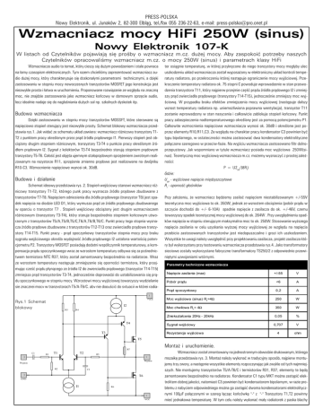 PRESS-POLSKA Nowy Elektronik, ul. Junaków 2, 82-300 Elbl¹g, tel./fax 055 236-22-63, e-mail: [email protected] Wzmacniacz mocy HiFi 250W (sinus) Nowy Elektronik 107-K W listach od Czytelników pojawiaj¹ siê proby o wzmacniacz m.cz. du¿ej mocy. Aby zaspokoiæ potrzeby naszych Czytelników opracowalimy wzmacniacz m.cz. o mocy 250W (sinus) i parametrach klasy HiFi Wzmacniacze audio to temat, który cieszy siê du¿ym powodzeniem i stale powraca na ³amy czasopism elektronicznych. Tym razem chcielimy zaprezentowaæ wzmacniacz au- tor osi¹gnie temperaturê, w której przykrêcone do niego tranzystory mocy mog³yby ulec uszkodzeniu uk³ad wzmacniacza zosta³ wyposa¿ony w elektroniczny uk³ad kontroli tempe- dio du¿ej mocy, który charakteryzuje siê doskona³ymi parametrami technicznymi, a dziêki zastosowaniu w stopniu mocy nowoczesnych tranzystorów MOSFET jego konstrukcja jest niezwykle prosta i ³atwa w uruchomieniu. Proponowane rozwi¹zanie ze wzglêdu na znaczn¹ moc, nie znajdzie zastosowania jako wzmacniacz koñcowy w domowym sprzêcie audio, lecz idealnie nadaje siê do nag³aniania du¿ych sal np. szkolnych dyskotek itp. ratury radiatora, po przekroczeniu której nastêpuje ograniczenie mocy wyjciowej. Przekroczenie temperatury radiatora ok. 75 stopni C powoduje wprowadzenie w stan przewodzenia tranzystora T11, który najpierw przejmie czêæ pr¹du ród³a pr¹dowego I2 i zmniejszy pr¹d zwierciad³a pr¹dowego (tranzystory T14-T15), jednoczenie zmniejszy moc wyjciow¹. W przypadku braku efektów zmniejszenia mocy wyjciowej (nastêpuje dalszy wzrost temperatury radiatora np. uniemo¿liwiona poprawna wentylacja), tranzystor T11 Budowa wzmacniacza Dziêki zastosowaniu w stopniu mocy tranzystorów MOSSFT, które sterowane s¹ napiêciowo stopieñ steruj¹cy jest niezwykle prosty. Schemat blokowy wzmacniacza przedstawia rys.1. Jak widaæ ze schematu uk³ad zawiera: wzmacniacz ró¿nicowy tranzystory T1T2 z punktem pracy okrelonym przez pr¹d ród³a pr¹dowego I1. Pierwszy stopieñ jest obci¹¿ony drugim stopniem ró¿nicowym, tranzystory T3-T4 o punkcie pracy okrelonym ró- zostanie wprowadzony w stan nasycenia i ca³kowicie zablokuje stopieñ koñcowy. Punkt pracy zabezpieczenia nadtemperaturowego okrelany jest za pomoc¹ potencjometru P1. Ca³kowite wzmocnienia napiêciowe wzmacniacza wynosi ok. 30dB i okrelone jest poprzez elementy R10,R11,C3. Ze wzglêdu na charakter pracy kondensator C3 powinien byæ typu bipolarnego, w ostatecznoci mo¿na zastosowaæ dwa kondensatory elektrolityczne po³¹czone szeregowo w przeciw-fazie. Na wyjciu wzmacniacza zastosowano filtr dolno- d³em pr¹dowym I2. Sygna³ z kolektorów T3-T4 bezporednio steruj¹ stopniem pr¹dowym tranzystory T5-T6. Ca³oæ jest objêta ujemnym sta³opr¹dowym sprzê¿eniem zwrotnym realizowanym na rezystorze R11, sprzê¿enie zmienno pr¹dowe jest realizowane na dwójniku R10-C3. Wzmocnienie napiêciowe wynosi ok. 30dB. przepustowy. Jak wspomniano w tytule wzmacniacz posiada moc wyjciowa 250W(sinus). Teoretyczn¹ moc wyjciow¹ wzmacniacza m.cz. mo¿emy wyznaczyæ z prostej zale¿noci: P = U2pp/(8Rl) Budowa i dzia³anie Gdzie: Upp - wyjciowe napiêcie miêdzyszczytowe Rl - opornoæ g³oników Schemat ideowy przedstawia rys. 2. Stopieñ wejciowy stanowi wzmacniacz ró¿nicowy tranzystory T1-T2, którego punk pracy wyznacza ród³o pr¹dowe zbudowane z tranzystorów T7-T8. Napiêciem odniesienia dla ród³a pr¹dowego (tranzystor T8) jest spadek napiêcia na diodzie LED D1, który wymusza pr¹d ze ród³a pr¹dowego zbudowanego w oparciu o tranzystor T7 . Stopieñ wejciowy obci¹¿ony jest drugim wzmacniaczem ró¿nicowym (tranzystory T3-T4), który steruje bezporednio stopniem koñcowym utwo- Przy za³o¿eniu, ¿e wzmacniacz bêdziemy zasilaæ napiêciem niestabilizowanym +/-55V teoretyczna moc wyjciowa to ok. 350W, jednak ze wzrostem obci¹¿enia (pobór pr¹du w szczycie dochodzi do +/- 6-10A) spadnie napiêcie z zasilacza do ok. +/-46V, czemu towarzyszy spadek teoretycznej mocy wyjciowej do ok. 264W . Przy uwzglêdnieniu spad- rzonym z tranzystorów T5/A,T5/B,T5/C,T6/A,T6/B,T6/C. Punkt pracy tego stopnia wyznacza ród³o pr¹dowe zbudowane z tranzystorów T12-T13 oraz zwierciad³o pr¹dowe tranzystory T14-T15. Punkt pracy - pr¹d spoczynkowy tranzystorów stopnia mocy przy braku sygna³u wejciowego okrela wydajnoæ ród³a pr¹dowego I2 ustalona wartoci¹ potencjometru P2. Tranzystory MOSFET posiadaj¹ dodatni wspó³czynnik temperaturowy, a kompensacja pr¹du spoczynkowego wraz ze wzrostem temperatury odbywa siê za porednic- ków napiêcia w stopniu steruj¹cym maksymalna moc to ok. 250W. Stosowanie wy¿szego napiêcia zasilania w celu uzyskania wy¿szej mocy wyjciowej ze wzglêdu na napiêcia przebicia zastosowanych tranzystorów jest niedopuszczalne i grozi ich uszkodzeniem. Wszystkie te uwagi nale¿y uwzglêdniæ przy projektowaniu zasilacza, projekt zasilacza który by³ wykorzystany przy testowaniu wzmacniacza przedstawia rys.4. Jako transformatory sieciowe zosta³y wykorzystane fabryczne transformatory TS250/2 z odpowiednio przewi- twem termistora NTC R37, który zosta³ zamontowany bezporednio na radiatorze. Wraz ze wzrostem temperatury nastêpuje zmniejszenie siê opornoci termistora, który przejmuj¹c czeæ pr¹du p³yn¹cego ze ród³a I2 do zwierciad³a pr¹dowego (tranzystor T14-T15) zmniejsza pr¹d tranzystorów T3-T4, jednoczenie doprowadzi do ustabilizowania siê pr¹du spoczynkowego w stopniu mocy. Wzrostowi mocy wyjciowej towarzyszy wydzielanie siê znacznej mocy w tranzystorach T5/A-T6/C, aby nie dopuciæ do sytuacji w której radia- niêtymi uzwojeniami wtórnymi. 1 +VCC Rys.1 Schemat blokowy I2 R3 R4 T4 T3 Parametry techniczne wzmacniacza Napiêcie zasilania (max) +/-55 V Pobór pr¹du <6 A Pr¹d spoczynkowy 0,2 A Moc wyjciowa (sinus) RL=4W 250 W Moc chwilowa RL= 4W 350 W Zniekszta³cenia 20Hz - 20kHz 0,05 % Sygna³ wejciowy 0,707 V 4 ohm Rezystancja wyjciowa T5 Monta¿ i uruchomienie. R7 C1