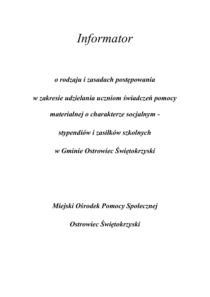 Informator o rodzaju i zasadach postępowania w zakresie udzielania uczniom świadczeń pomocy materialnej o charakterze socjalnym stypendiów i zasiłków szkolnych w Gminie Ostrowiec Świętokrzyski Miejski Ośrodek Pomocy Społecznej Ostrowiec Świętokrzyski Pomoc materialna dla uczniów. Miejski Ośrodek Pomocy Społecznej w Ostrowcu Świętokrzyskim na podstawie uchwały Rady Miasta Ostrowca Św. Miejski Ośrodek Pomocy Społecznej w Ostrowcu Świętokrzyskim na podstawie uchwały Rady Miasta Ostrowca Św. Nr LIV/685/2010 z dnia 29 kwietnia 2010 roku w sprawie upoważnienia Dyrektora Miejskiego Ośrodka Pomocy Społecznej w Ostrowcu Świętokrzyskim do prowadzenia postępowania w zakresie udzielania świadczeń pomocy materialnej o charakterze socjalnym (Dz.Urz.woj. świętokrzyskiego Nr 180, poz.1669) oraz uchwały Rady Miasta Ostrowca Św. Nr LIX/731/2010 z dnia 5 sierpnia 2010 roku zmieniającą w/w uchwałę (Dz.Urz.woj. świętokrzyskiego Nr 251 poz. 2494) prowadzi od dnia 1 września 2011 r. postępowania w zakresie udzielania uczniom świadczeń pomocy materialnej o charakterze socjalnym. Stypendia i zasiłki szkolne przyznawane są na podstawie, ustawy z dnia 7 września 1991 r. o systemie oświaty (jt. Dz. U. z 2015 r. poz. 2156 z późn. zm.) oraz uchwały Nr X/68/2011 Rady Miasta Ostrowca Świętokrzyskiego z dnia 3 czerwca 2011 r. w sprawie Regulaminu udzielania pomocy materialnej o charakterze socjalnym dla uczniów zamieszkałych na terenie Gminy Ostrowiec Świętokrzyski (Dz. Urz. woj. świętokrzyskiego Nr 167, poz.1935 i Nr 178, poz. 2088) Informacje udzielane są w Miejskim Ośrodku Pomocy Społecznej ul. Świętokrzyska 22 w Dziale Dodatków Mieszkaniowych i Energetycznych II piętro pokój nr 2.22 I pod nr tel. 41 2767617 w godzinach 7.00-15.00 Komu przysługuje pomoc materialna? 1) Uczniom szkół publicznych i niepublicznych o uprawnieniach szkół publicznych dla młodzieży i dla dorosłych oraz słuchaczom publicznych kolegiów nauczycielskich, nauczycielskich kolegiów języków obcych i kolegiów pracowników służb społecznych - do czasu ukończenia kształcenia, nie dłużej jednak niż do ukończenia 24 roku życia. 2) Wychowankom publicznych i niepublicznych ośrodków umożliwiających dzieciom i młodzieży, o których mowa w art. 16 ust. 7, ustawy z dnia 7.09.1991 r. o systemie oświaty (jt. Dz. U. z 2015 r. poz. 2156 z późn. zm.) a także dzieciom i młodzieży upośledzonym umysłowo ze sprzężonymi niepełnosprawnościami realizację odpowiednio obowiązku szkolnego i obowiązku nauki - do czasu ukończenia realizacji obowiązku nauki. 3) Świadczenia pomocy materialnej przysługują również uczniom szkół niepublicznych nieposiadających uprawnień szkół publicznych dla młodzieży i dla dorosłych - do czasu ukończenia realizacji obowiązku nauki oraz słuchaczom niepublicznych kolegiów nauczycielskich i nauczycielskich kolegiów języków obcych - do czasu ukończenia kształcenia, nie dłużej jednak niż o ukończenia 24 roku życia. 4) Uczeń lub słuchacz musi być mieszkańcem Ostrowca Świętokrzyskiego. INFORMACJE O STYPENDIUM SZKOLNYM Kto może otrzymać stypendium szkolne ? Stypendium szkolne mogą otrzymać uczniowie znajdujący się w trudnej sytuacji materialnej wynikającej z niskich dochodów na osobę w rodzinie, wielodzietności, choroby, bezrobocia, uzależnień itp. Pomoc nie obejmuje dzieci uczęszczających do klas „0” Miesięczna wysokość dochodu netto na osobę w rodzinie ucznia uprawniająca do ubiegania się o stypendium szkolne nie może być większa niż kwota: dla rodzin na osobę w rodzinie od 1 X 2015 r. do nadal 514,00 zł netto, dla osób samotnie gospodarujących 634,00 zł netto. Przy składanych wnioskach należy przedstawić dokumenty (informacje) o wszystkich dochodach NETTO uzyskanych w miesiącu poprzedzającym złożenie wniosku. Kto może złożyć wniosek? a) rodzic/prawny opiekun niepełnoletniego ucznia b) pełnoletni uczeń c) dyrektor szkoły lub kolegium d) z urzędu Gdzie pobiera się wnioski ? Wnioski o przyznanie stypendium szkolnego pobiera się w Dziale Dodatków Mieszkaniowych i Energetycznych MOPS ul. Świętokrzyska 22 II piętro pokój nr 2.22. lub w Informacji MOPS (parter budynku) Wnioski corocznie wydawane są od dnia 1 sierpnia Gdzie składa się wypełnione wnioski? Wypełnione wnioski o przyznanie stypendium szkolnego z załącznikami składa się w Dziale Dodatków Mieszkaniowych i Energetycznych MOPS ul. Świętokrzyska 22 II piętro pokój nr 2.22. wnioski przyjmowane są w okresie: od 1 września do 15 września W jakiej formie może być udzielane stypendium szkolne ? Stypendium szkolne może być udzielane uczniom, w formie: a) częściowego lub całkowitego pokrycia kosztów udziału w zajęciach edukacyjnych, w szkole, w tym wyrównawczych, wykraczających poza zajęcia realizowane w szkole w ramach planu nauczania, b) częściowego lub całkowitego pokrycia kosztów udziału w zajęciach edukacyjnych realizowanych poza szkołą, c) częściowego lub całkowitego pokrycia kosztów związanych z pobieraniem nauki poza miejscem zamieszkania przez uczniów szkół ponadgimnazjalnych lub słuchaczy kolegiów, d) pomocy rzeczowej o charakterze edukacyjnym w tym zakup podręczników i/lub innych pomocy edukacyjnych, e) świadczenia pieniężnego- tylko w przypadku gdy Dyrektor MOPS uzna, że udzielenie w innych formach jest niemożliwe lub w przypadku słuchaczy kolegiów niecelowe. Stypendium szkolne może być udzielone w jednej lub kilku formach jednocześnie. W jakiej wysokości i na jak długo przyznawane jest stypendium ? Stypendium szkolne nie może być niższe miesięcznie niż 94,40 zł i nie może przekraczać 236,00 zł. Stypendium szkolne jest przyznawane na okres nie krótszy niż miesiąc i nie dłuższy niż 10 miesięcy w danym roku szkolnym, a w przypadku kolegiów nie dłuższy niż 9 miesięcy w danym roku szkolnym. Jak trzeba dokumentować w